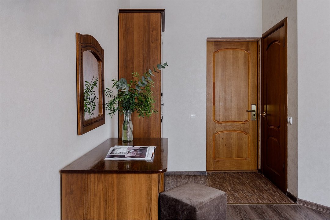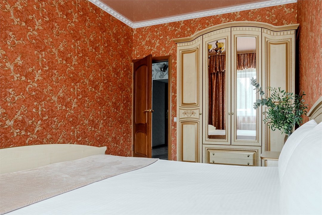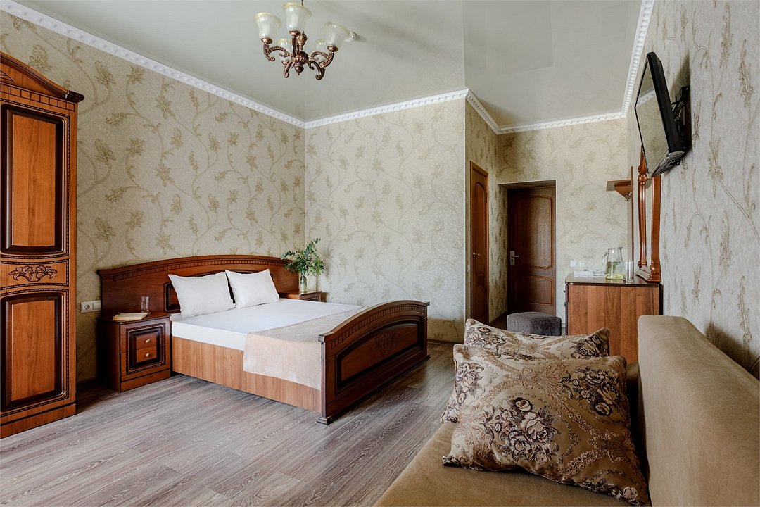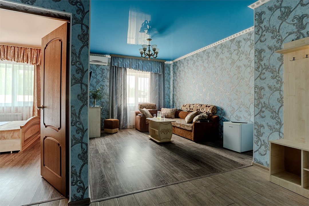 Улучшенный номер площадью 22 квадратных метров. На выбор гостей спальные места в комнате представлены: двуспальной кроватью и двуспальным диваном (шириной 1,5 метра). В номере есть: Wi-Fi, сплит-система, стол, современный телевизор и фен. Номер оснащен собственной ванной комнатой с душем, туалетом и косметическими принадлежностями.Семейный двухкомнатный номер
