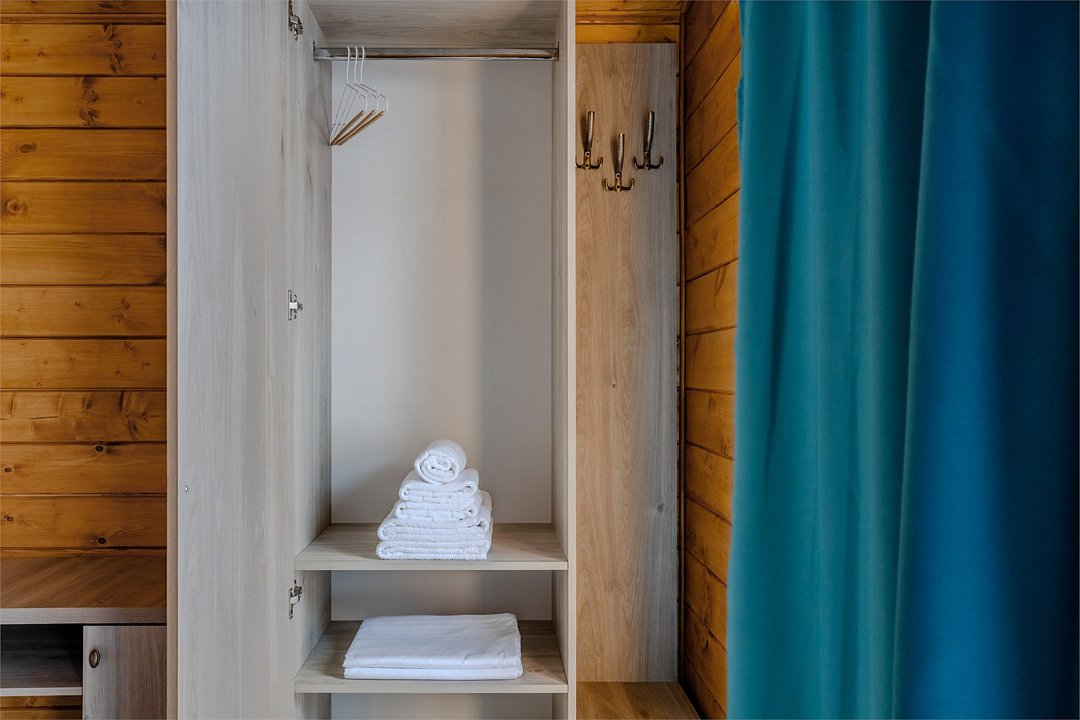Семейный двухкомнатный номер площадью 26 квадратных метров. Спальные места в номере представлены: двуспальной кроватью в отдельной спальне и двуспальным диваном (шириной 1,5 метра) и креслом-кроватью (шириной 80 см) в гостиной комнате. В номере есть: Wi-Fi, сплит-система, стол, современный телевизор и фен. Номер оснащен собственной ванной комнатой с душем, туалетом и косметическими принадлежностями.Домики