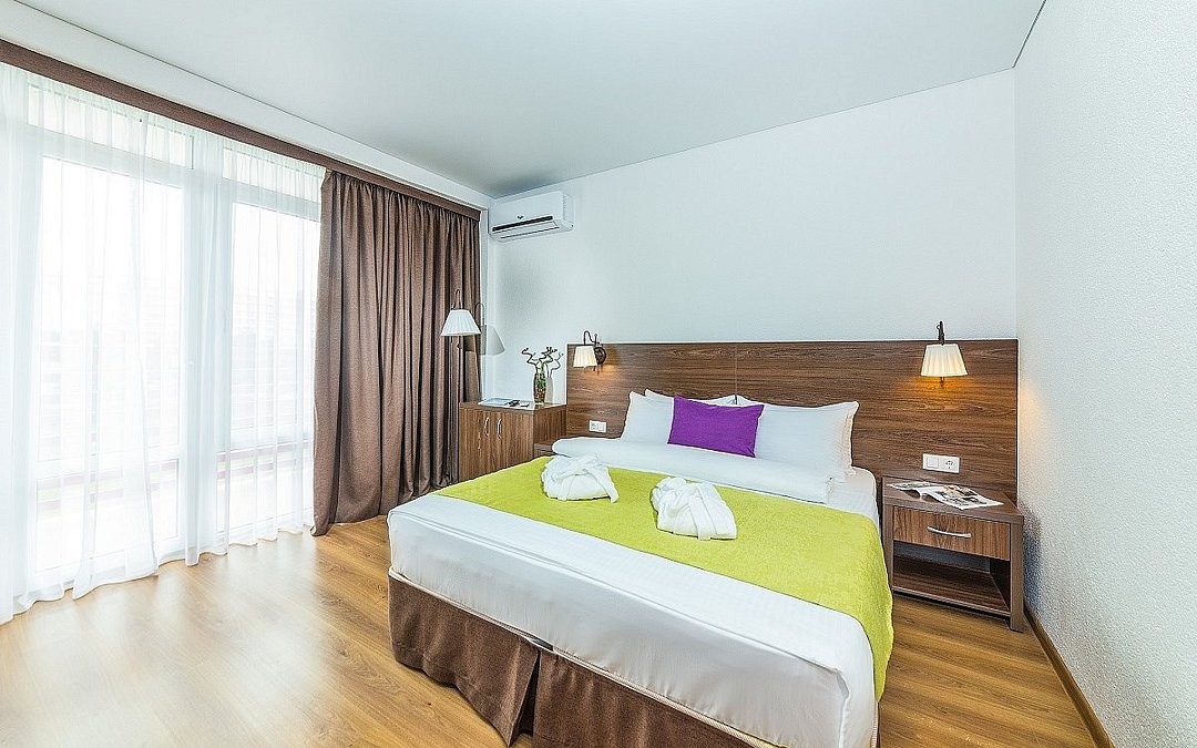 кабельное телевидение, Wi-Fi, IP-телефон, кондиционер, светильник, настольные лампы, электронные замки, ванная комната, ванна, ванна или душевая кабина, санузел, банные принадлежности, банные полотенца, пляжные полотенца, косметические средства, балкон, двуспальная кровать, гипоаллергенное белье, ортопедический матрас, шкаф для одежды, гардеробная, вешалки, багажная тумба, зеркало, звуконепроницаемые стены и окна, сейф, раковина, кулер на этаже, ламинат, стаканы, стул, туалетные средства, туалет, раскладное кресло, внутренний телефон, телевизор с плоским экраном, мини-холодильник, номер для некурящих, USB-порт, рабочий стол, общественный бассейн, кресло-кровать, услуги прачечной (платно), мылоВ гостиничном номере