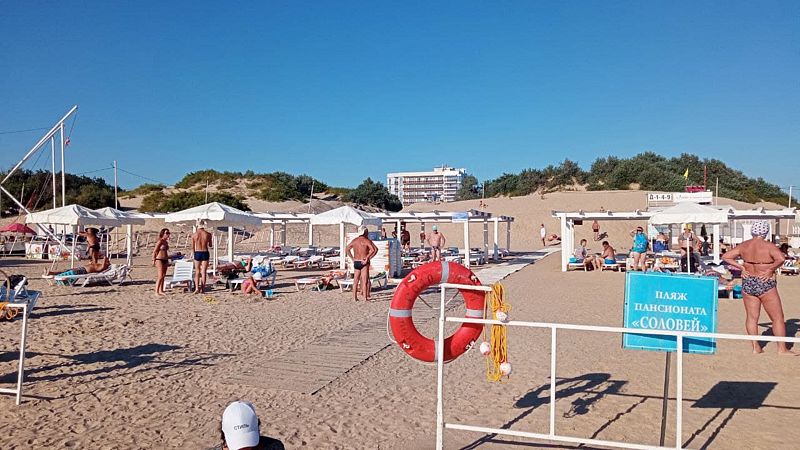 В 700 метрах от санатория находится собственный песчаный пляж. Для гостей пансионата «Соловей» предоставляются лежаки и навесы. Посещать пляж могут только проживающие в пансионате. Безопасность на пляже обеспечивают спасатели. Для детей выделена отдельная зона для купания.