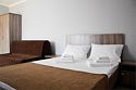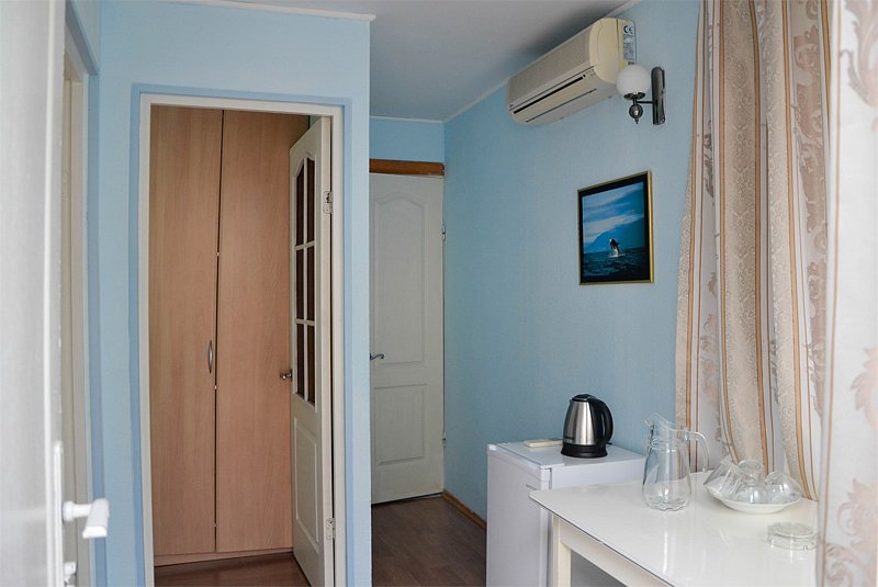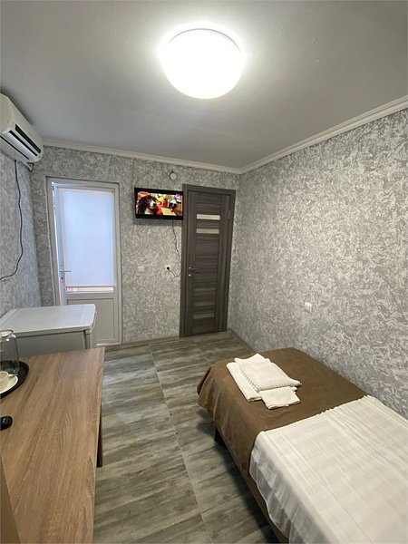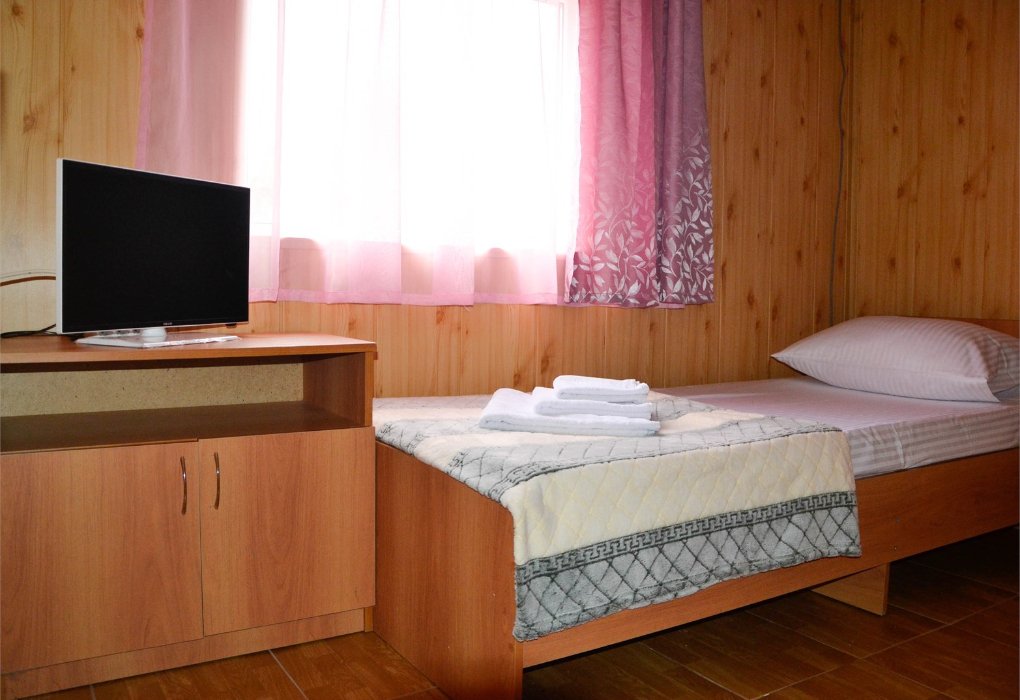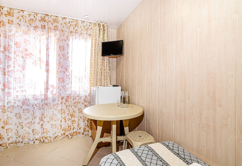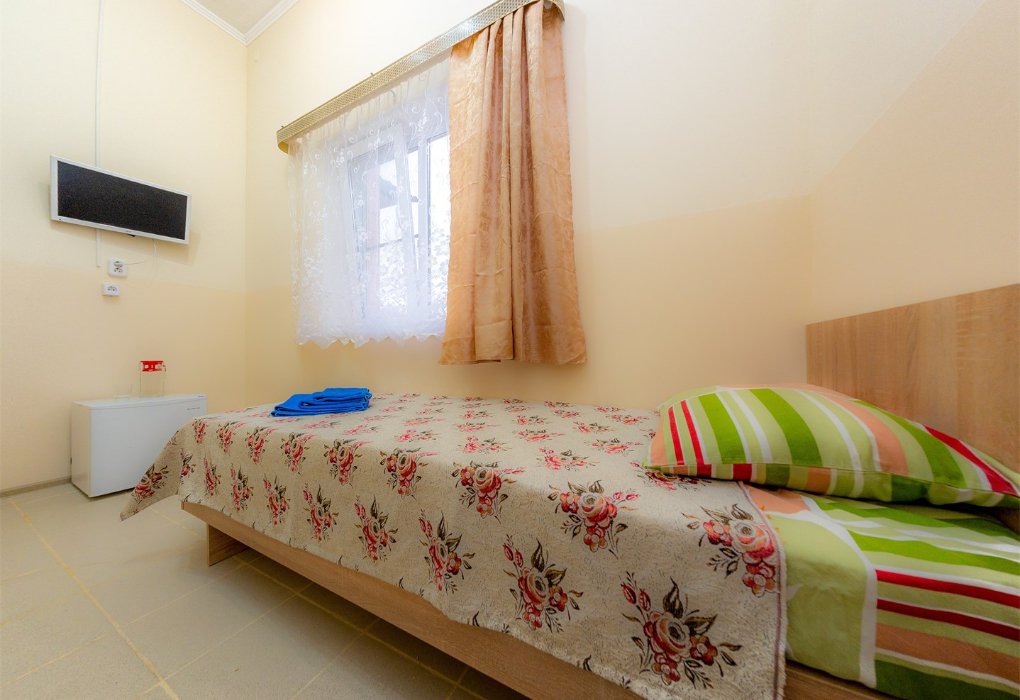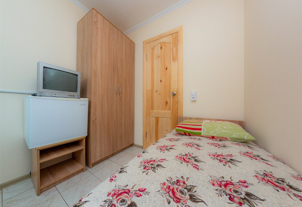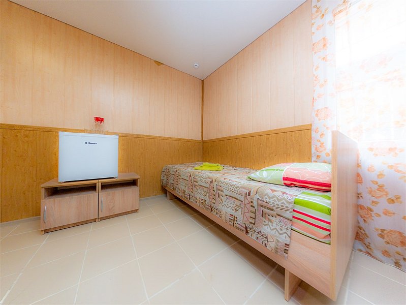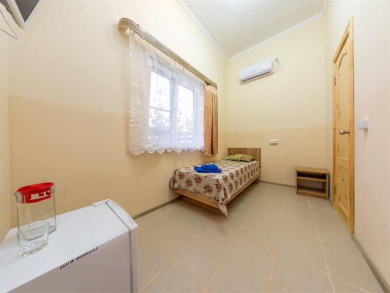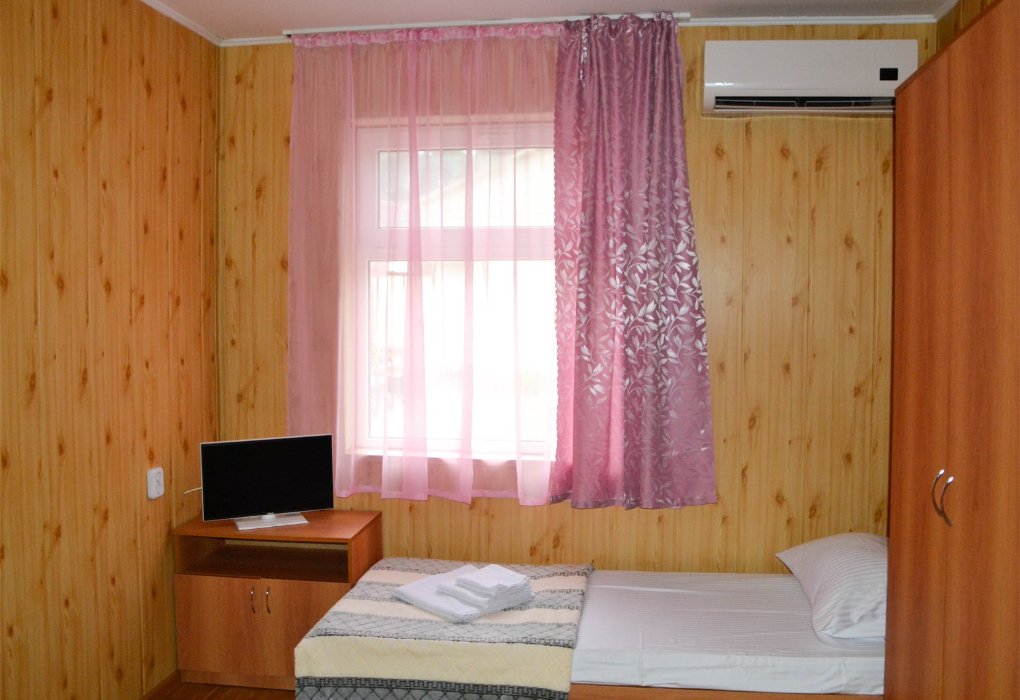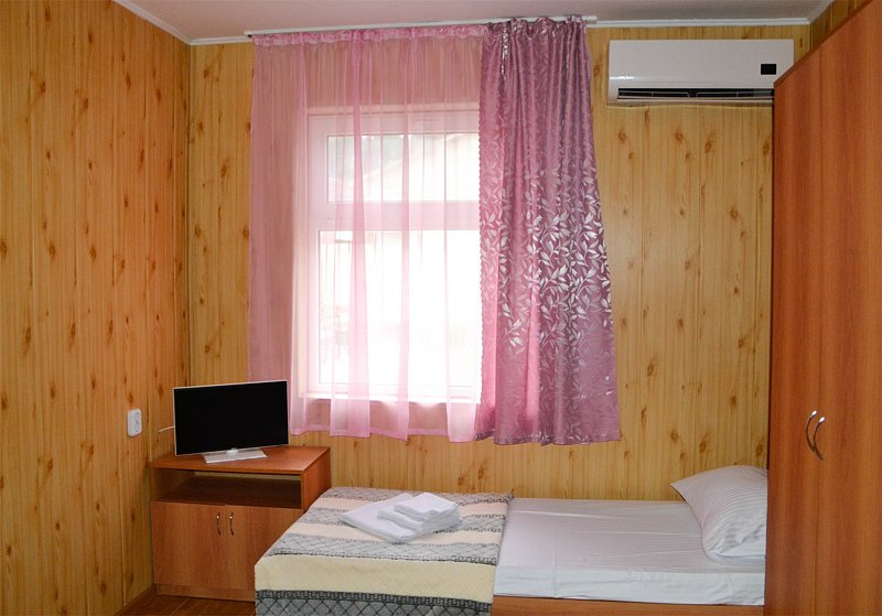 Небольшой номер в отдаленной части пансионата. Для гостей, предпочитающих тишину и минимализм. В номере: мини-холодильник, ТВ, кондиционер, с/у, шкаф для одежды.
