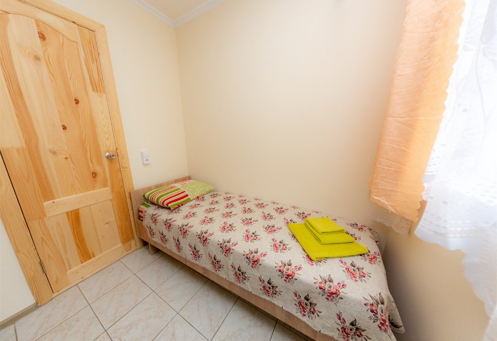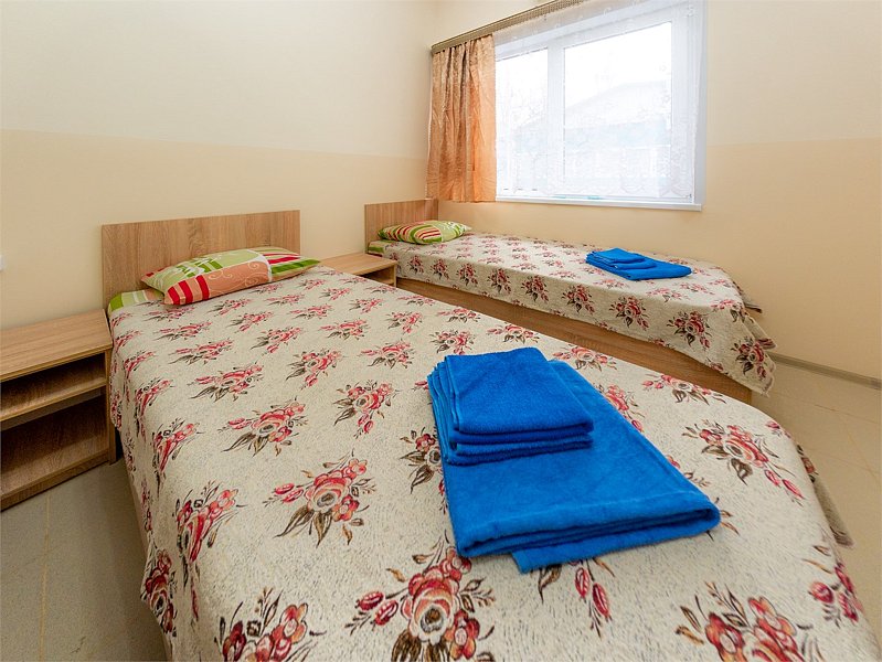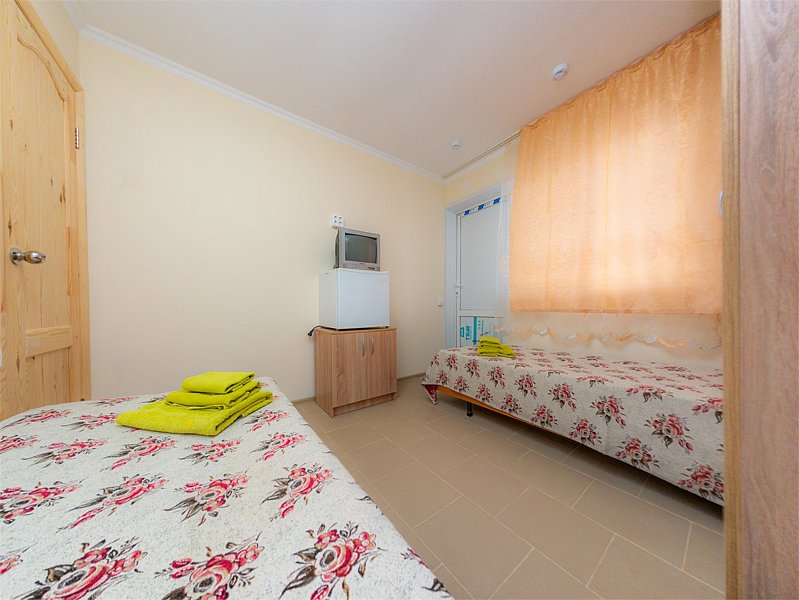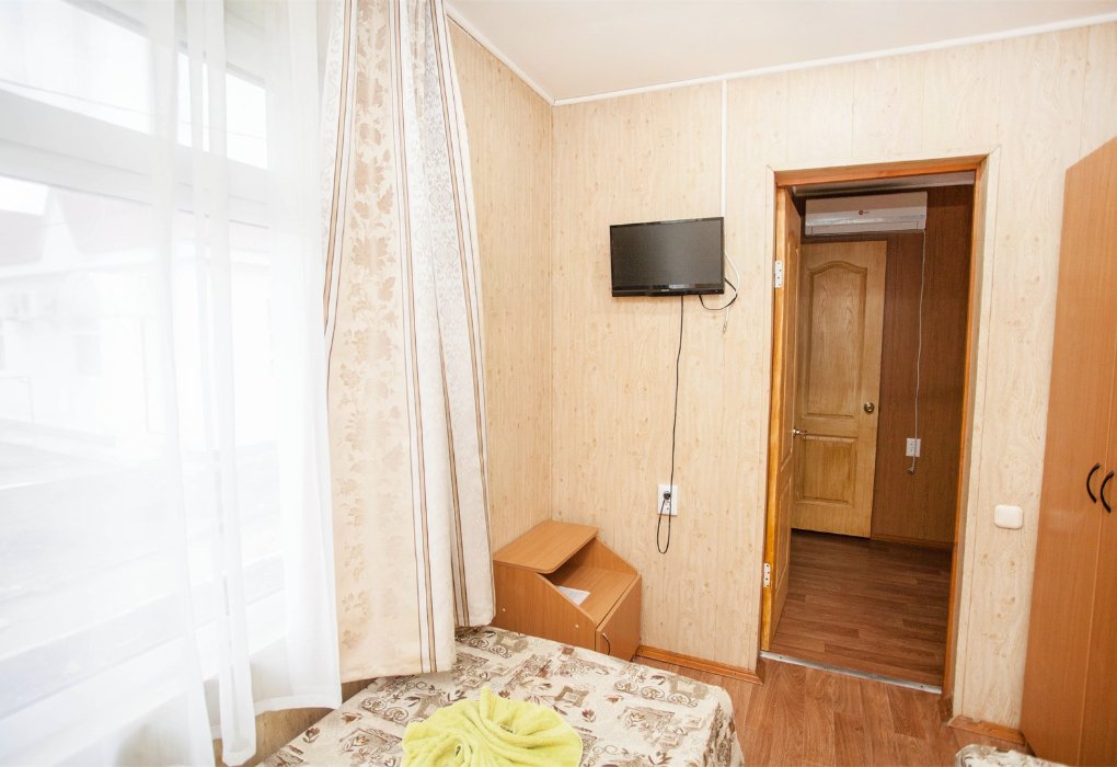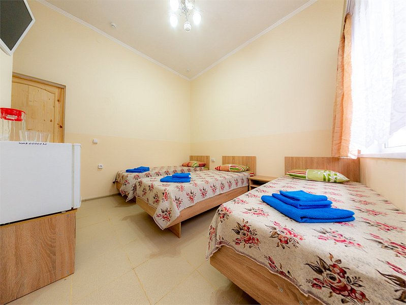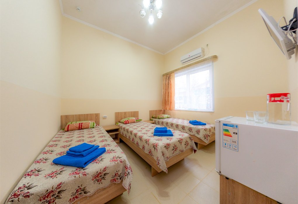 Трехместный номер категории «Эконом» в спокойных тонах. Для вас в номере: мини-холодильник, ТВ, сплит-система. Санузел с душем вне номера на веранде.