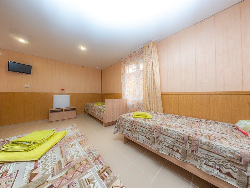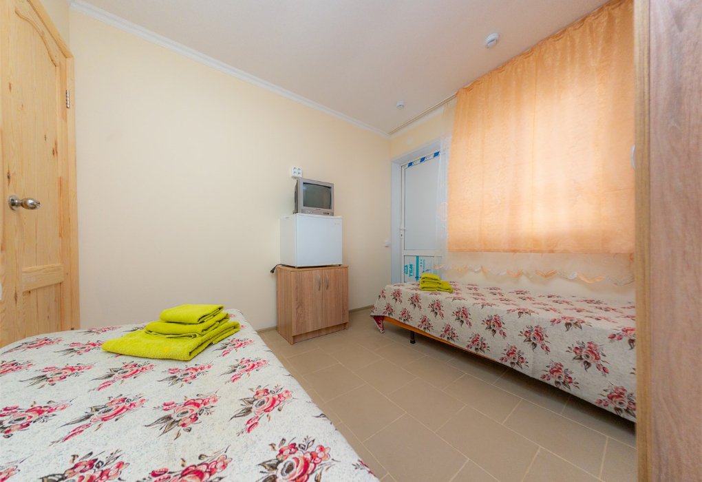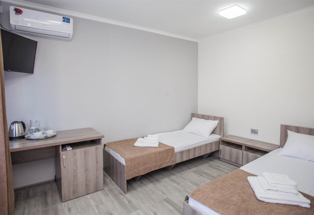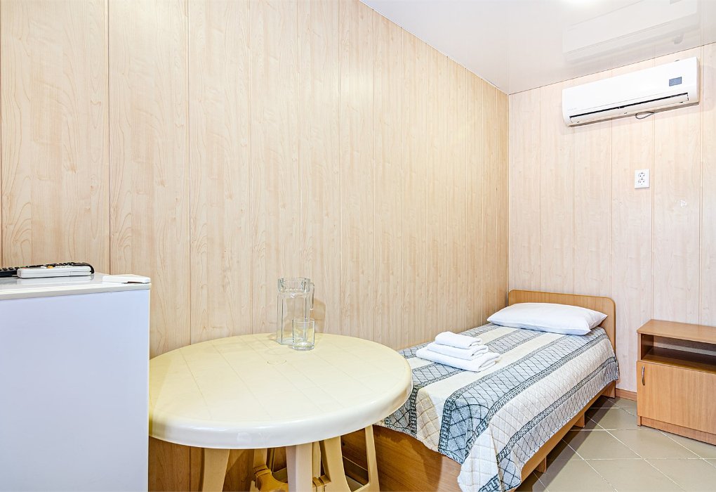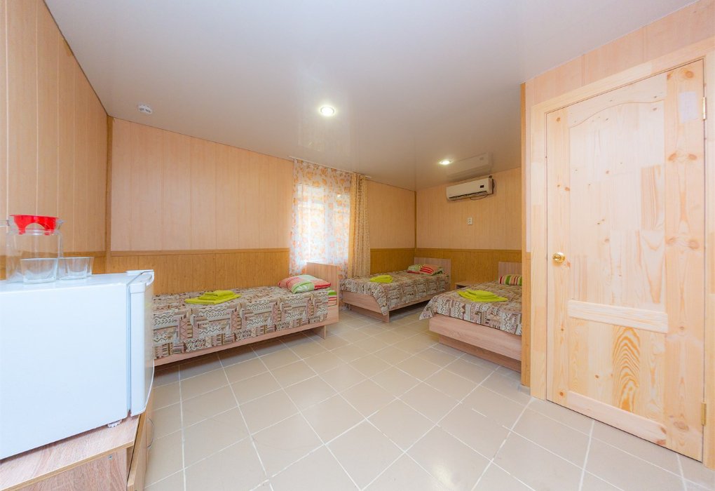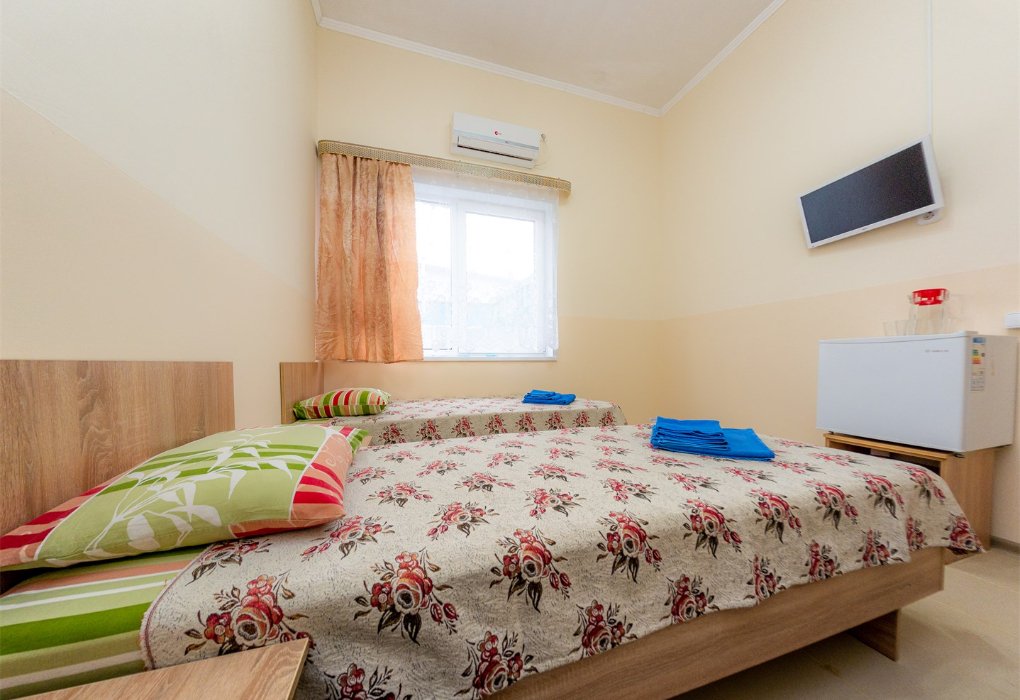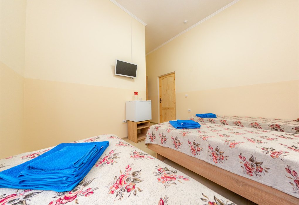 Трехместный номер категории «Эконом» в спокойных тонах. Для вас в номере — мини-холодильник, ТВ, сплит-система. Санузел с душем вне номера на веранде.