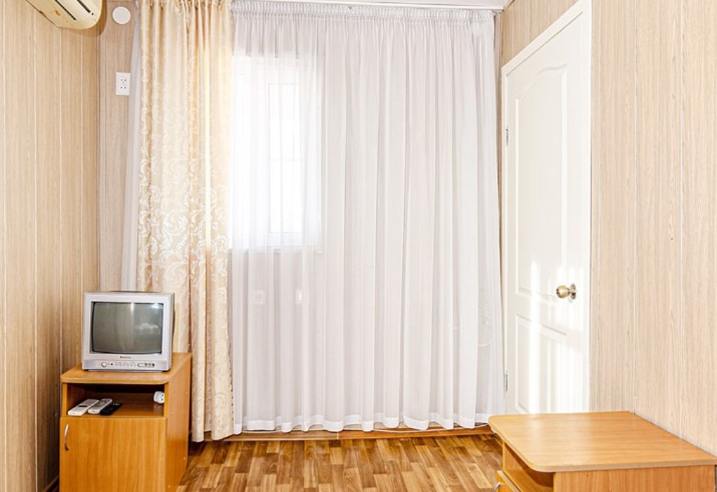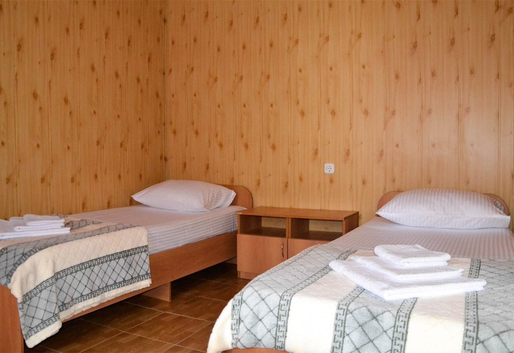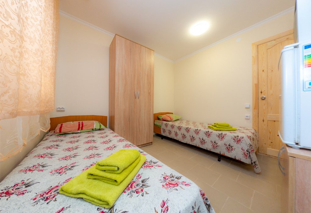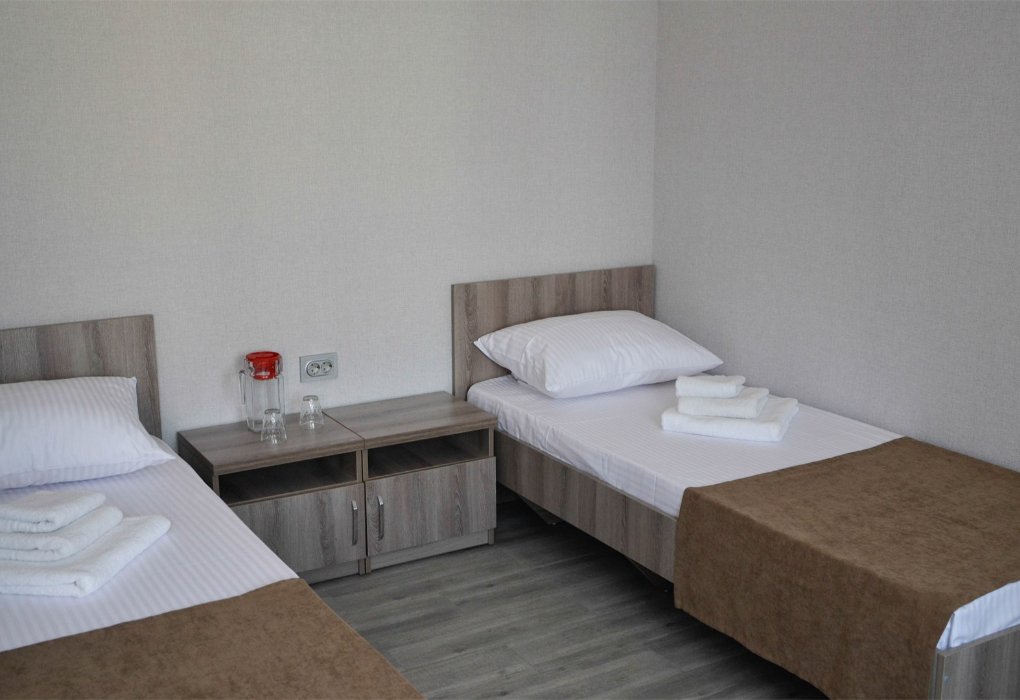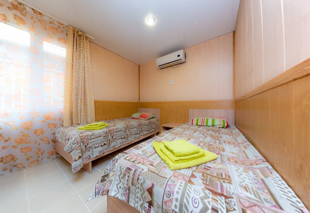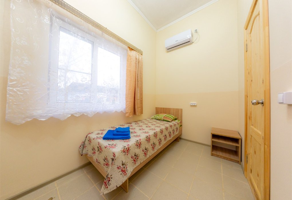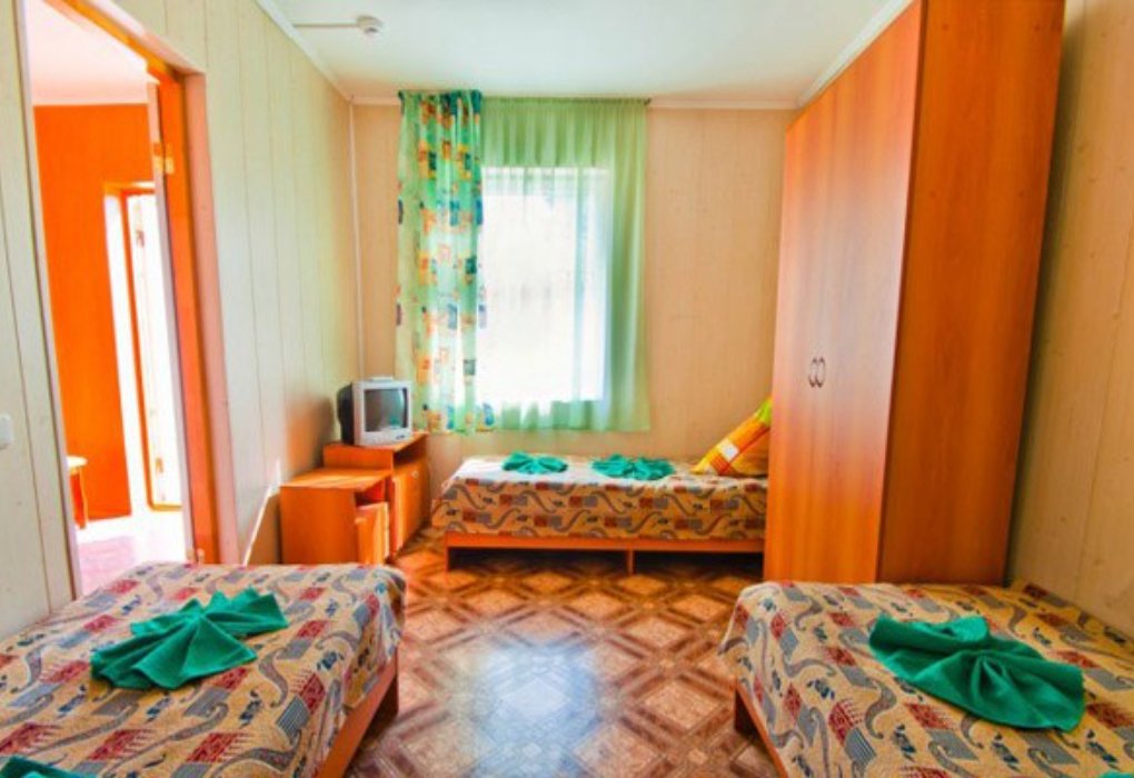 Трехместный номер категории «Эконом» в спокойных тонах. Для вас в номере — мини-холодильник, ТВ, сплит-система. Санузел с душем вне номера на веранде.