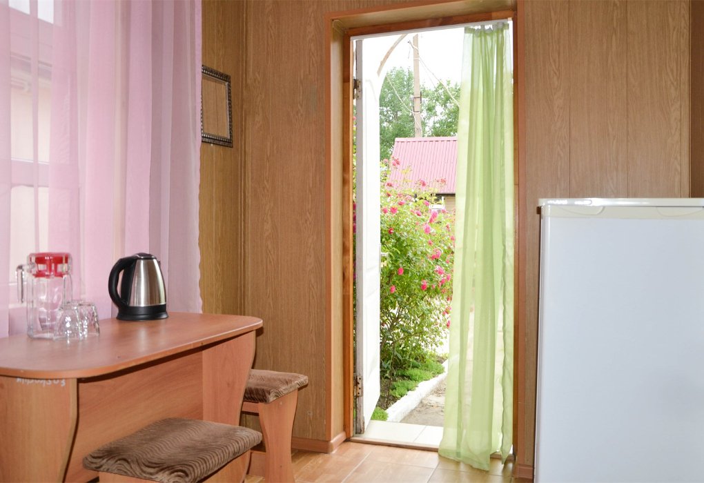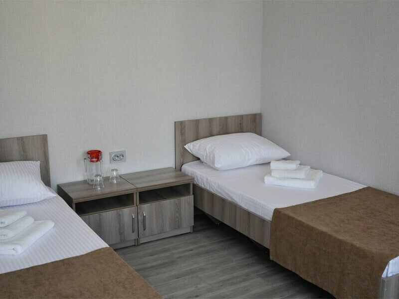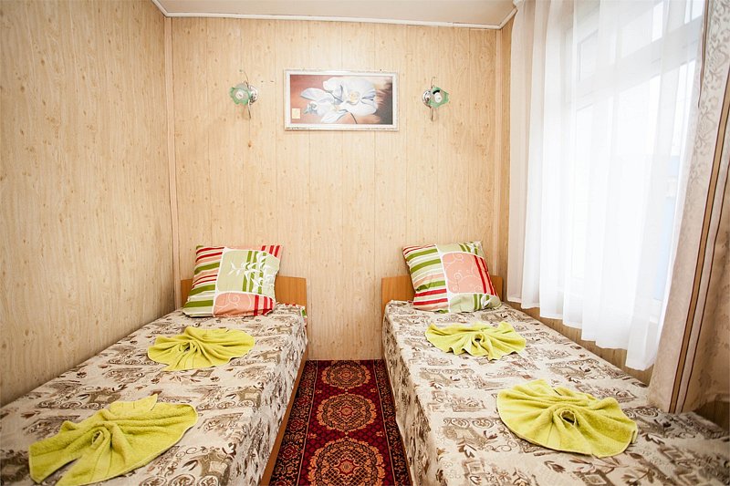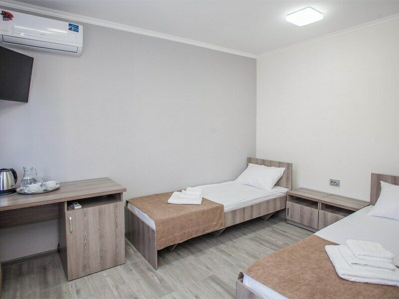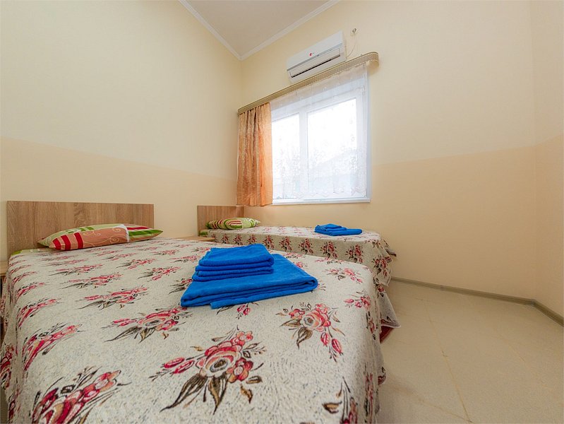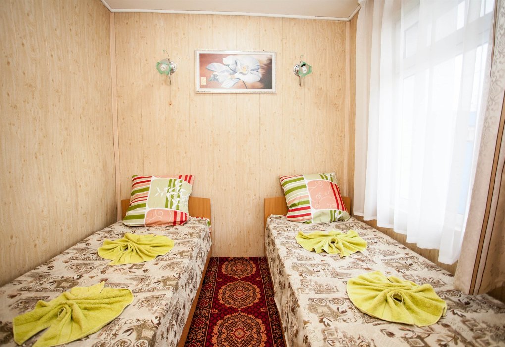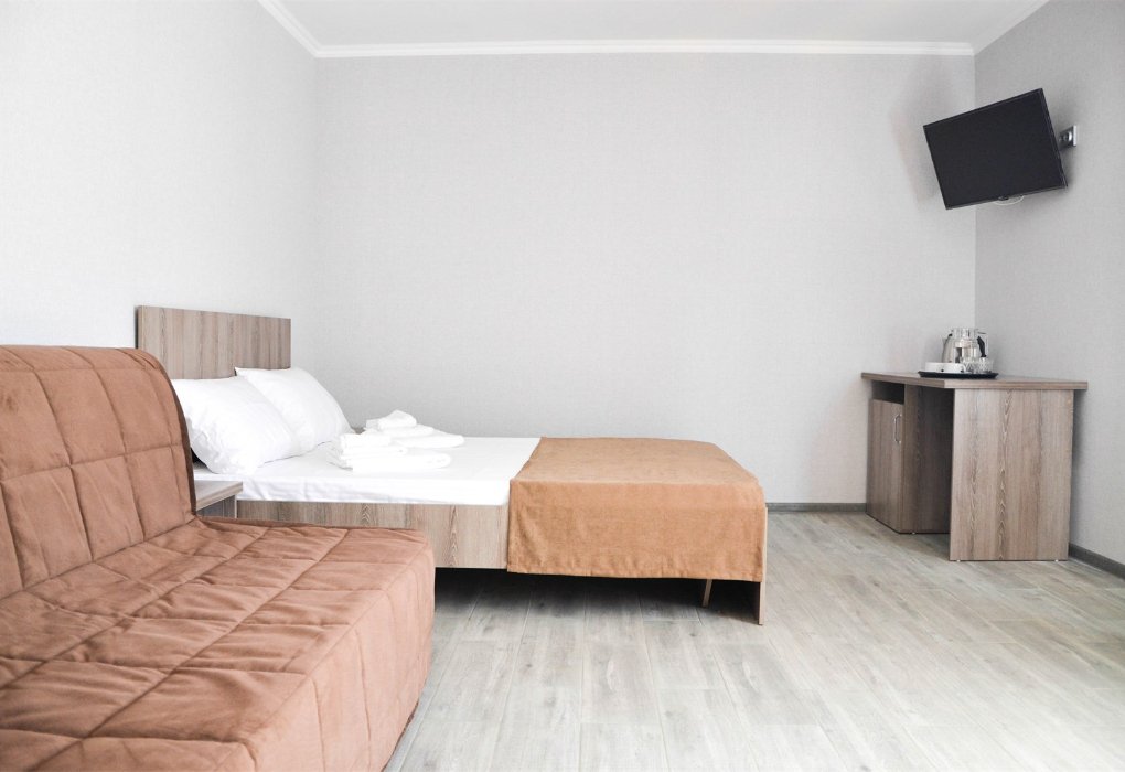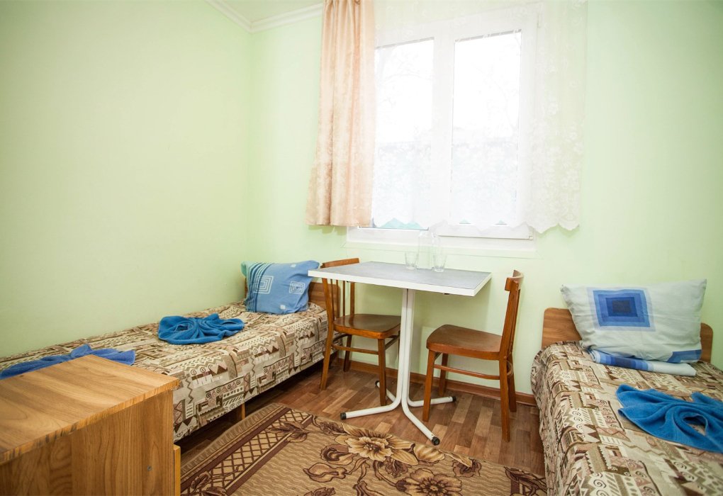 Трехместный номер категории «Эконом» в спокойных тонах. Для вас в номере — мини-холодильник, ТВ, сплит-система. Санузел с душем вне номера на веранде.