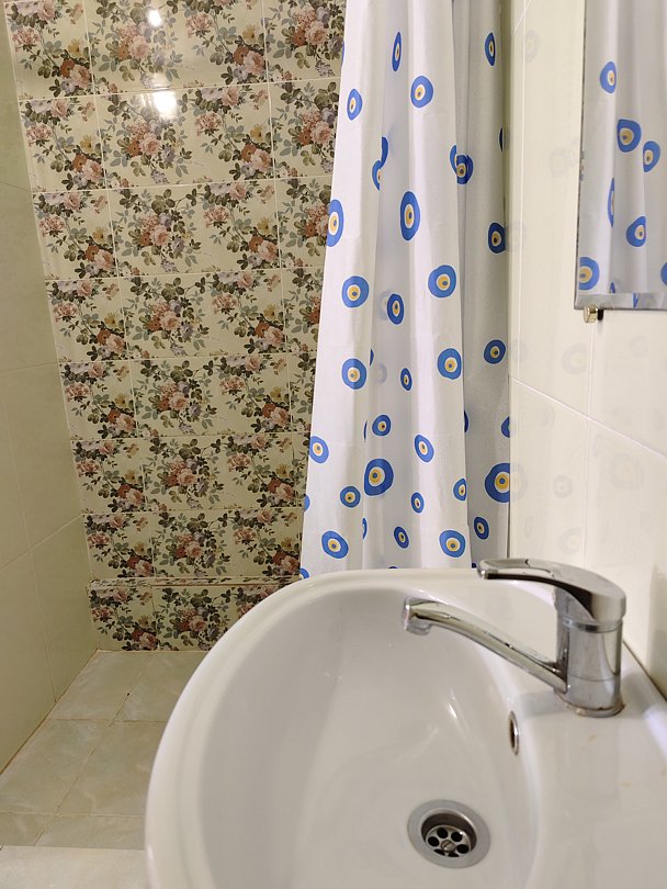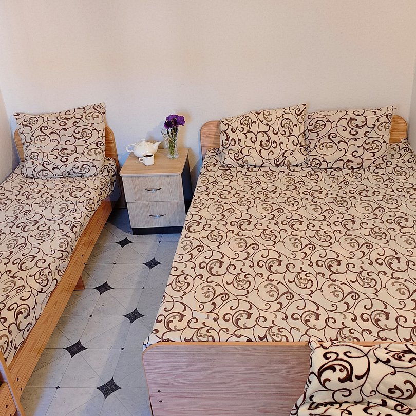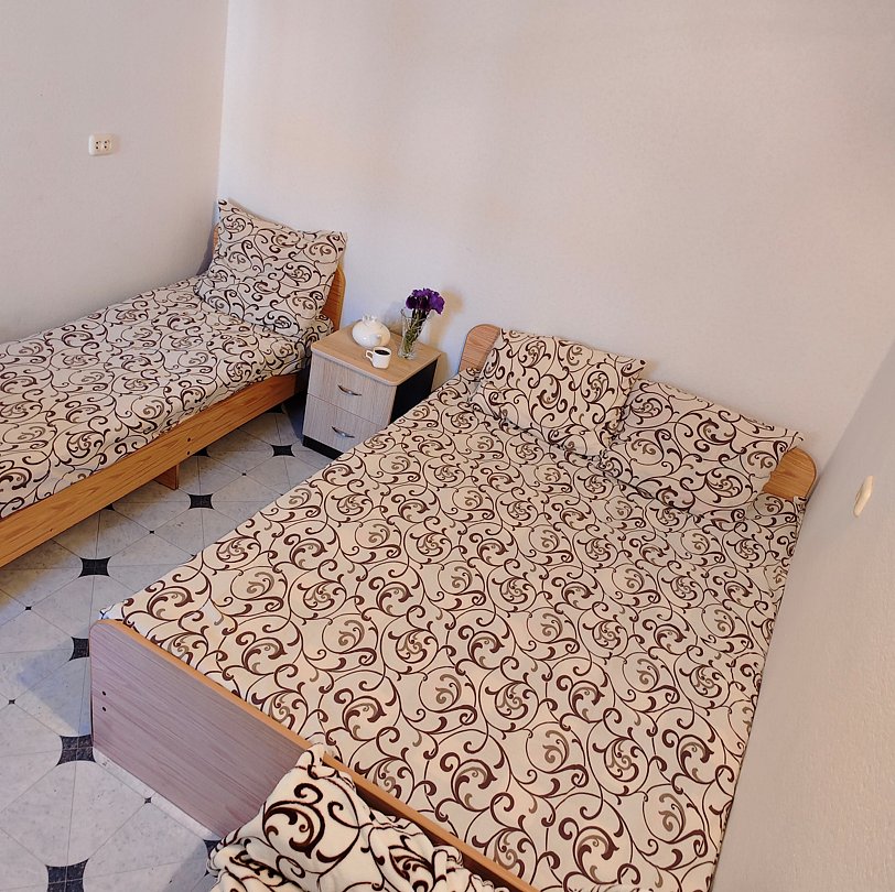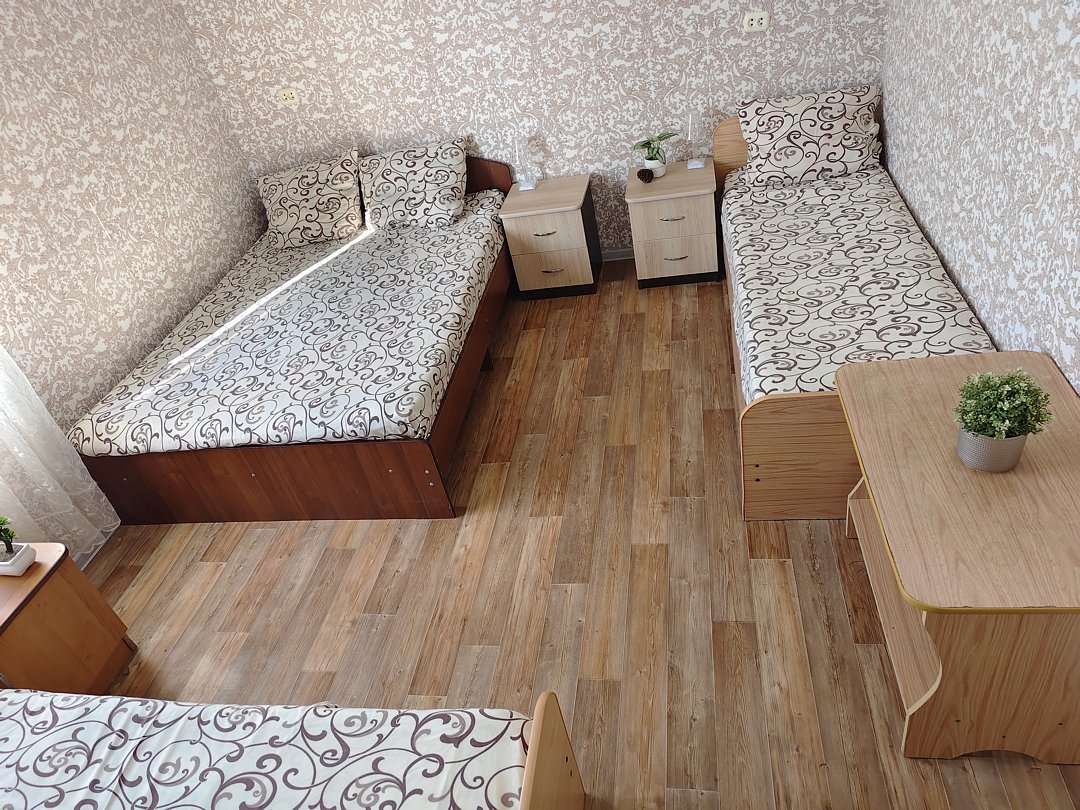 Номер оснащен: двуспальная и две односпальные кровати, шкаф для хранения одежды, телевизор, прикроватная тумбочка, мини-холодильник, вентилятор. Ванная комната и санузел на этаже.