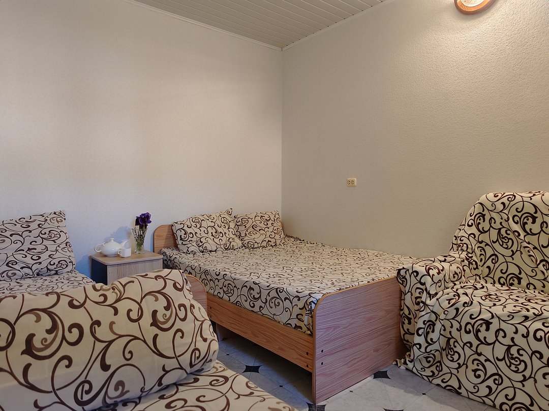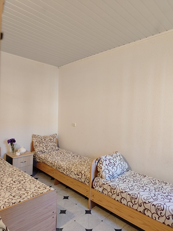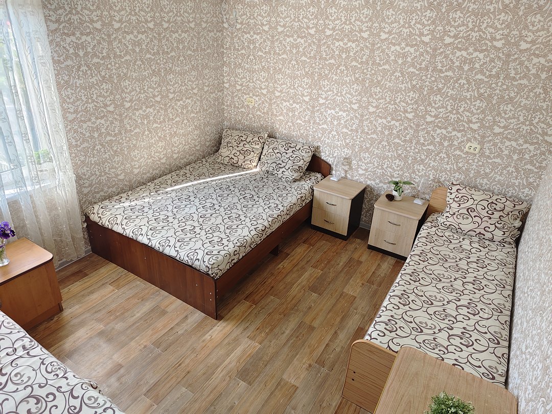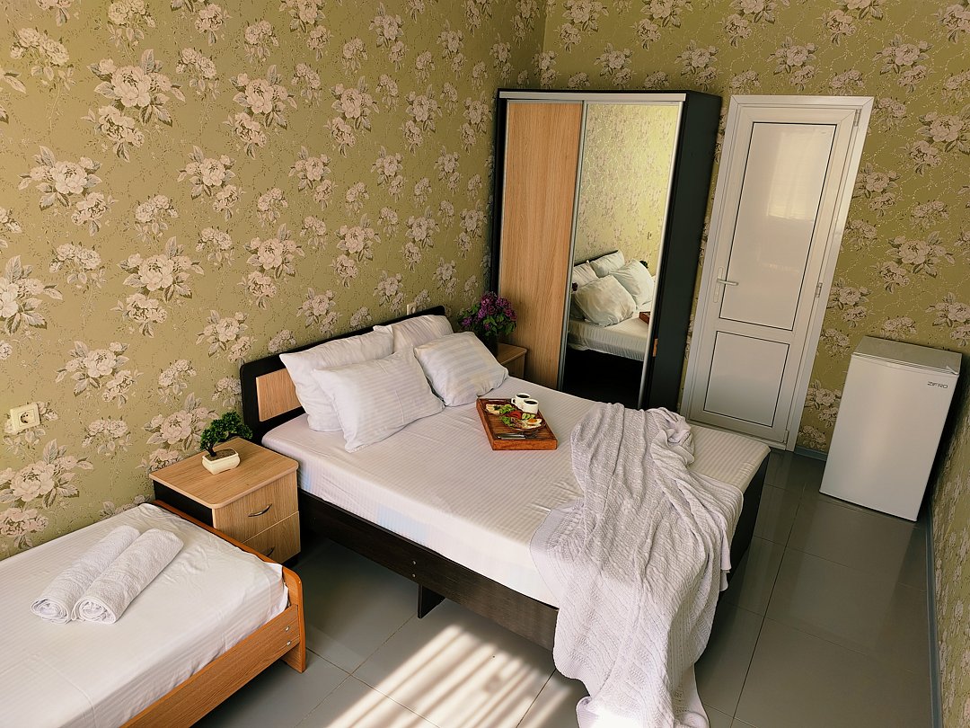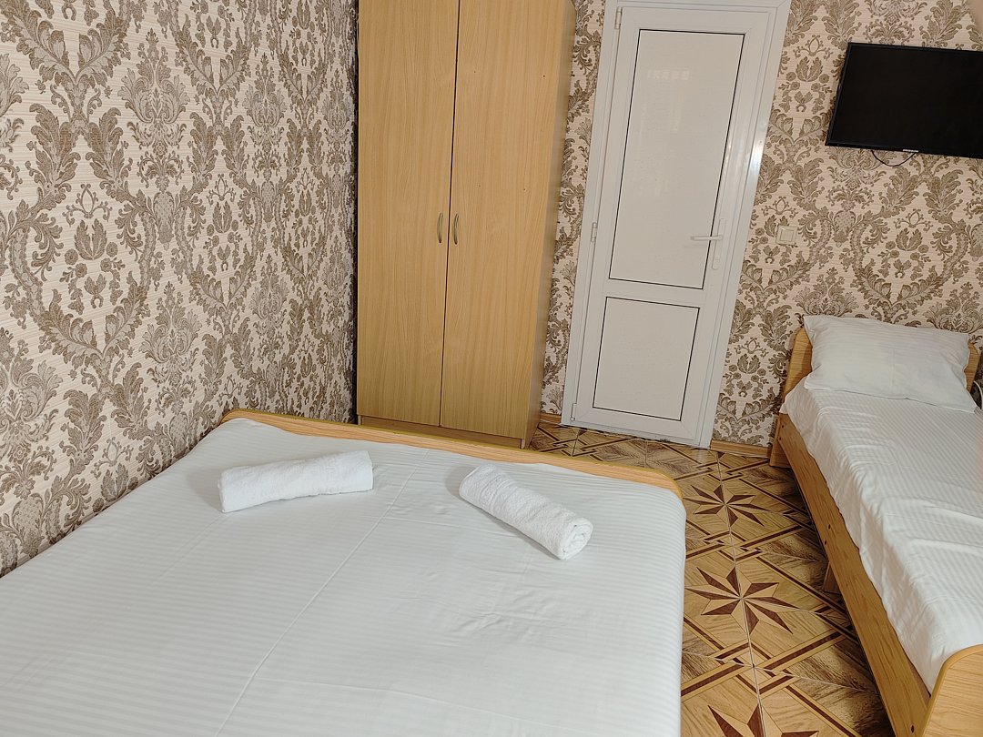 Номер оснащен: двуспальная и односпальная кровати, шкаф для хранения одежды, телевизор, прикроватная тумбочка, кресло, мини-холодильник, вентилятор. Ванная комната и санузел на этаже.