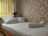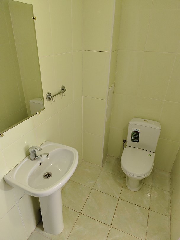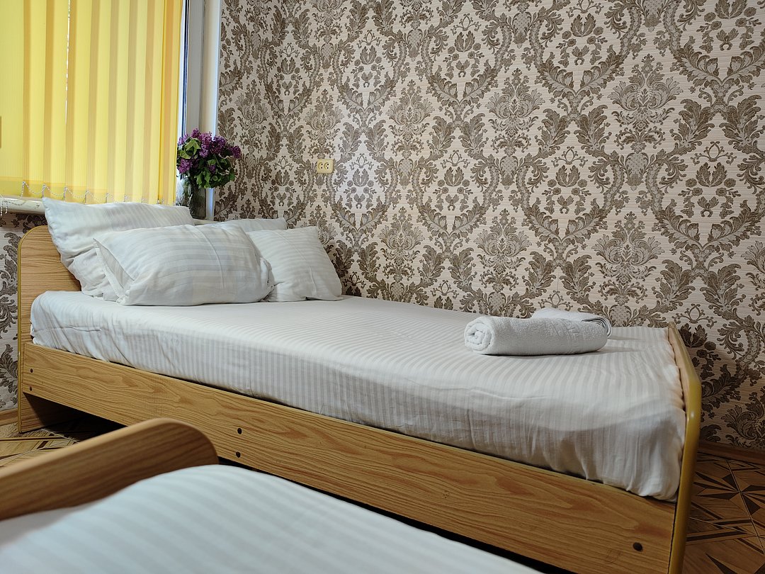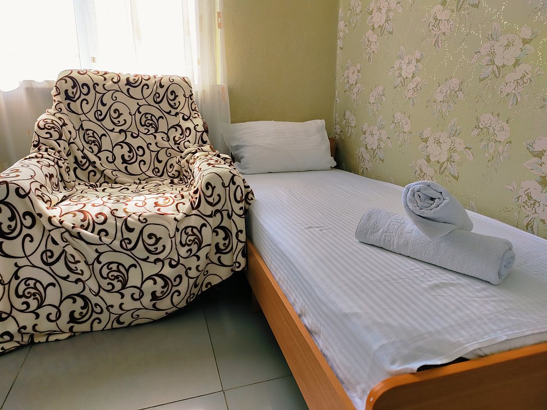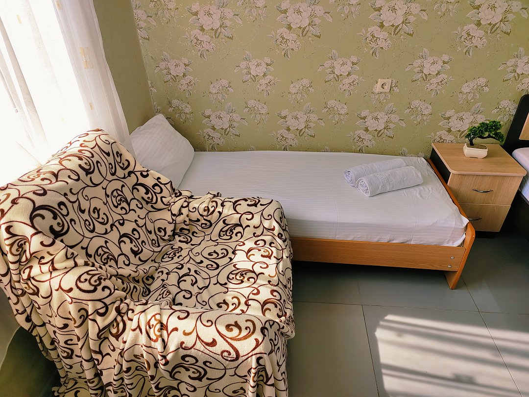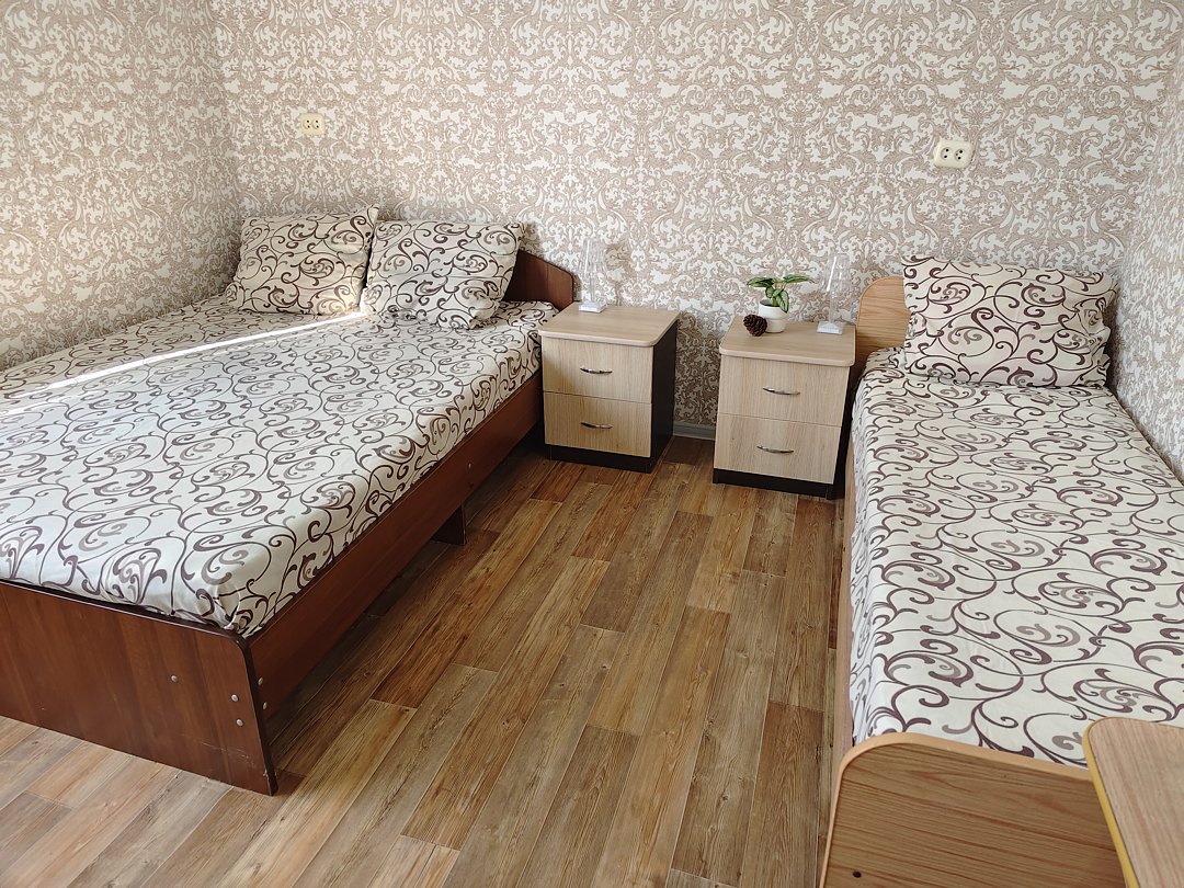 Номер оснащен: двуспальная и односпальная кровати, шкаф для хранения одежды, телевизор, прикроватная тумбочка, кресло, мини-холодильник, вентилятор. Ванная комната и санузел на этаже.