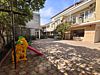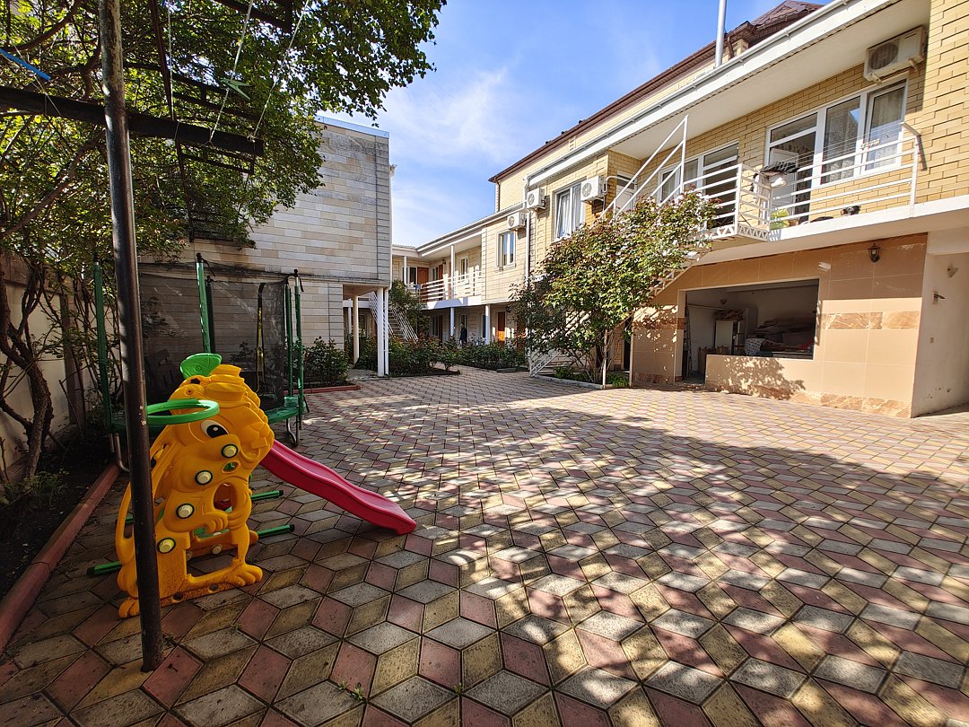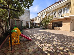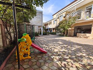 На территории гостевого дома позаботились о досуге самых маленьких: для них оборудована детская зона с небольшой горкой и батутом.