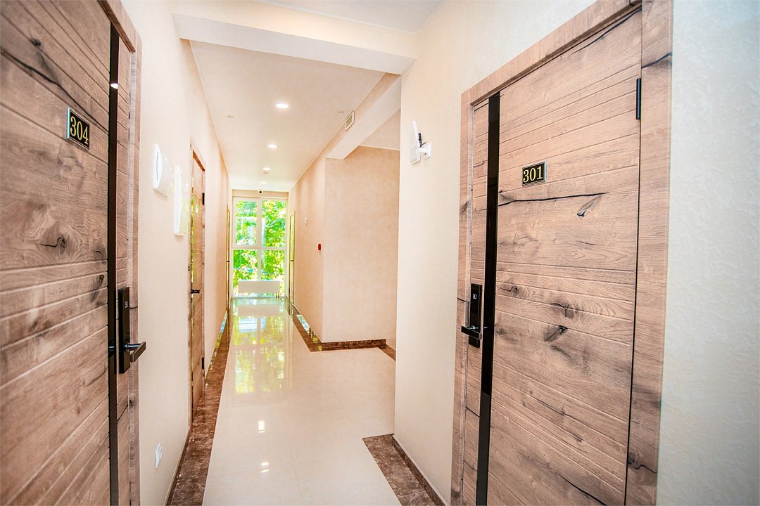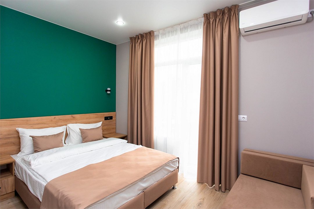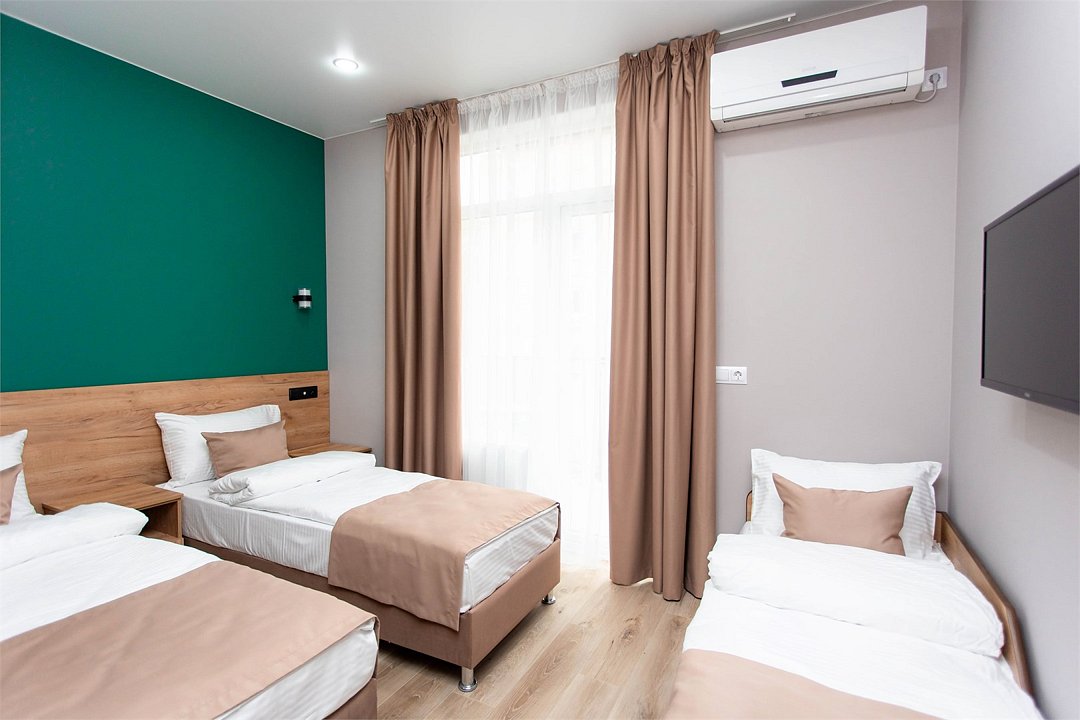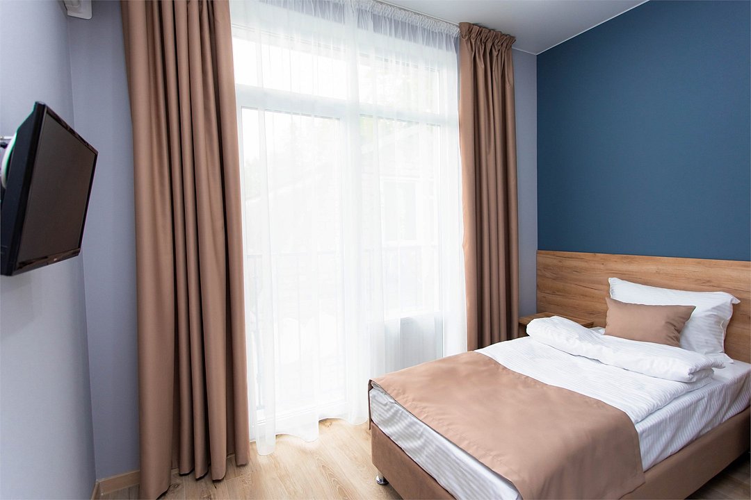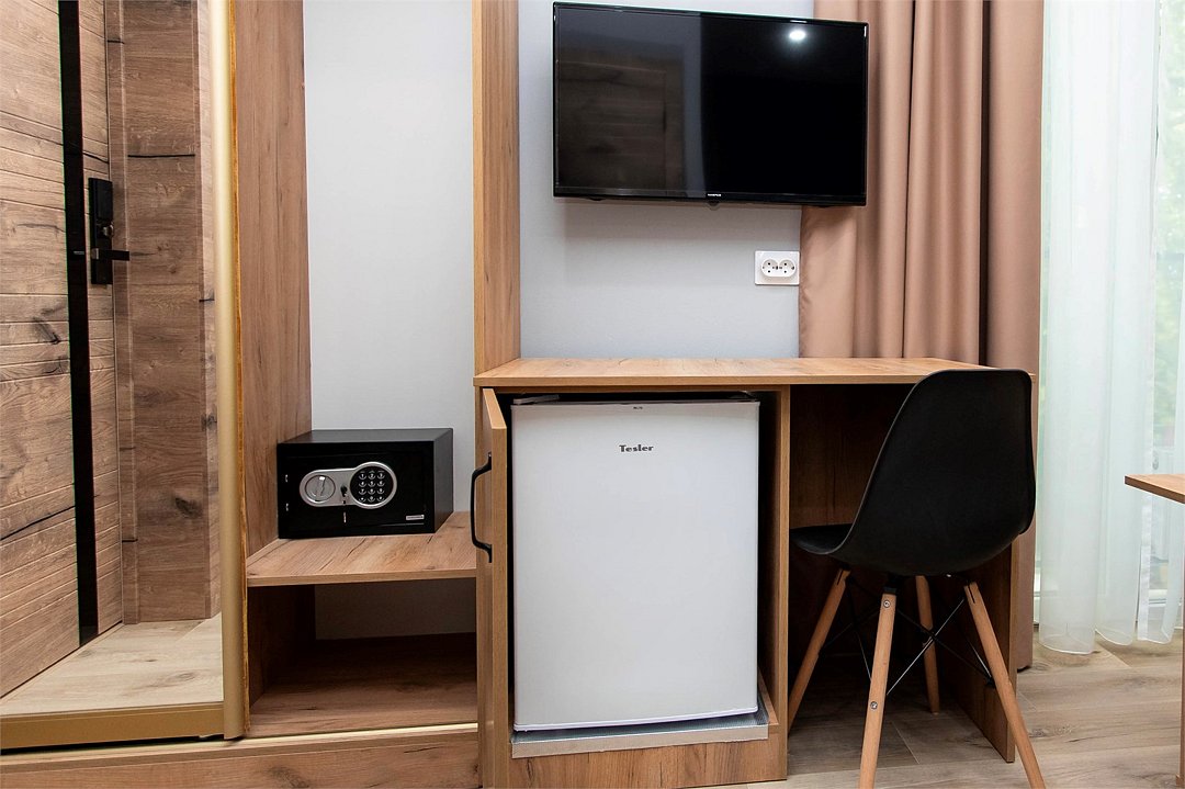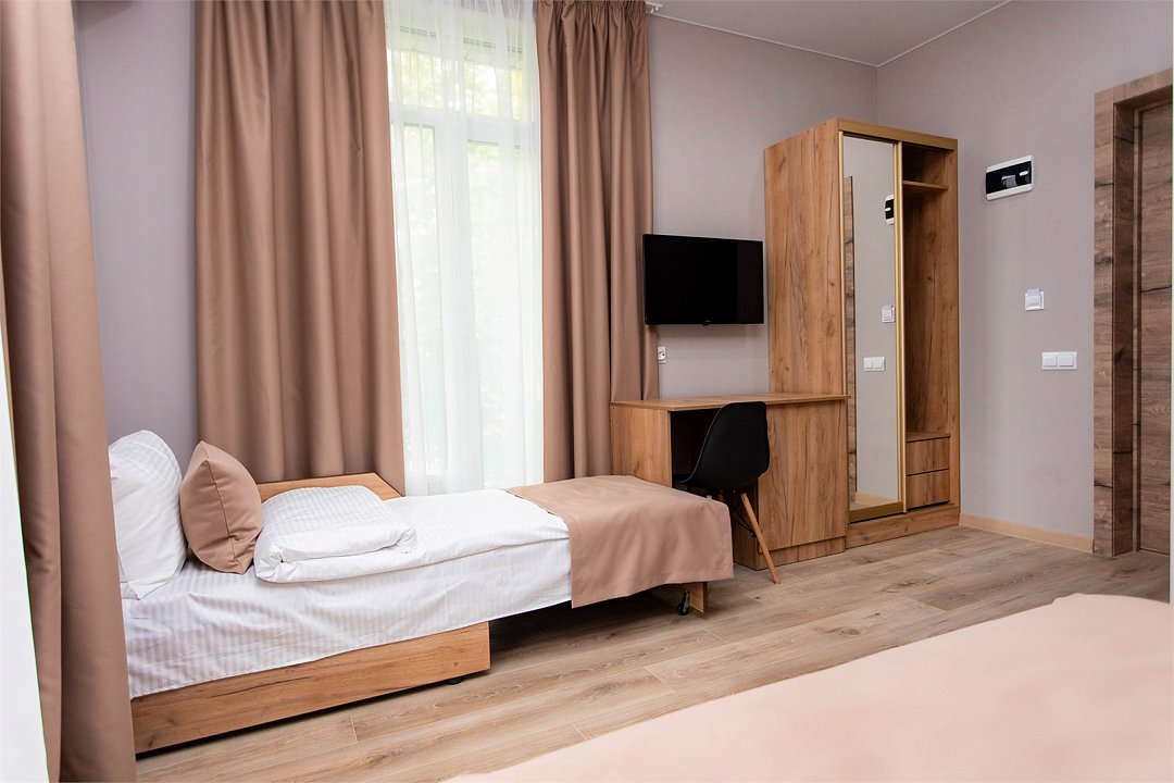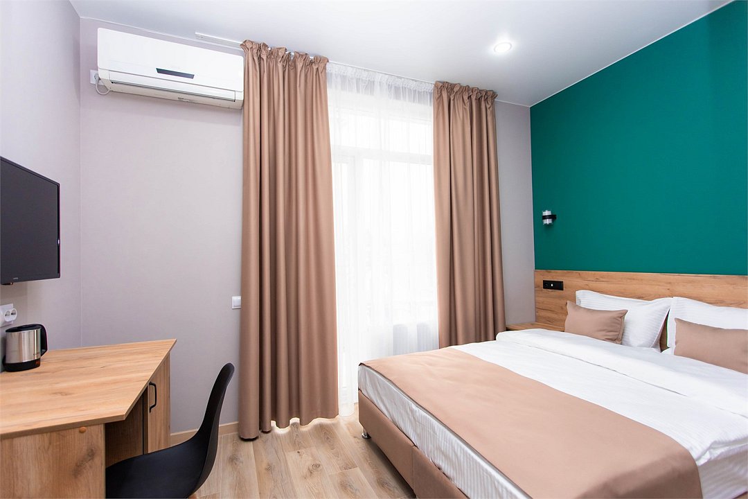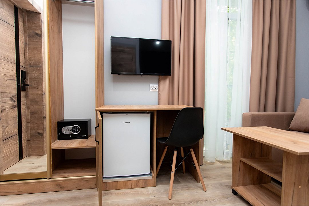 На огороженной территории отеля есть внутренний двор с зеленью и цветами, уютными уголками для отдыха. Трехэтажное здание отеля способно одновременно вместить до 40 человек. Каждый из номеров оборудован автономным санузлом с душем. В каждом есть необходимые бытовые приборы: сплит-система, холодильник, телевизор. Wi-Fi доступен на территории.