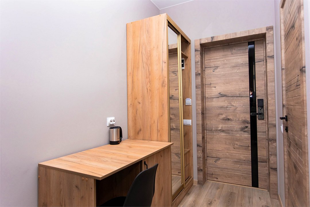 Wi-Fi, интернет, кондиционер, фен, электронные замки, ванная комната, душевая кабина, санузел, банные полотенца, тапочки, односпальная кровать, ортопедический матрас, тумбы, письменный стол, сейф, чайник, унитаз, раковина, отопление, душ, вид на город, ламинат, стул, туалет, цифровое тв, телевизор с плоским экраном, мини-холодильник, шкаф-купе, уборка номера, вешалки-плечики, мыло, затемняющая штора, окна от пола до потолка, зеркало в полный ростВ гостиничном номере
