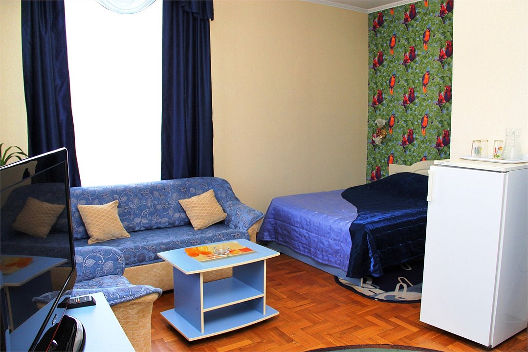 Однокомнатный Номер с балконом и диваном 28 кв.м. Спальные места: одна двуспальная кровать (140*190) и диван-кровать. Есть возможность поставить раскладушку и детскую кроватку для ребенка до 3-х лет. Размещение для ребенка до 6 лет - бесплатно Номер подходит для семьи из 2-4 человек, которых не пугает пеший подъём по лестнице на 4 этаж. Микроволновка, гладильная доска, утюг и кулер находятся на 4 этаже в свободном доступе.Услуги и удобства