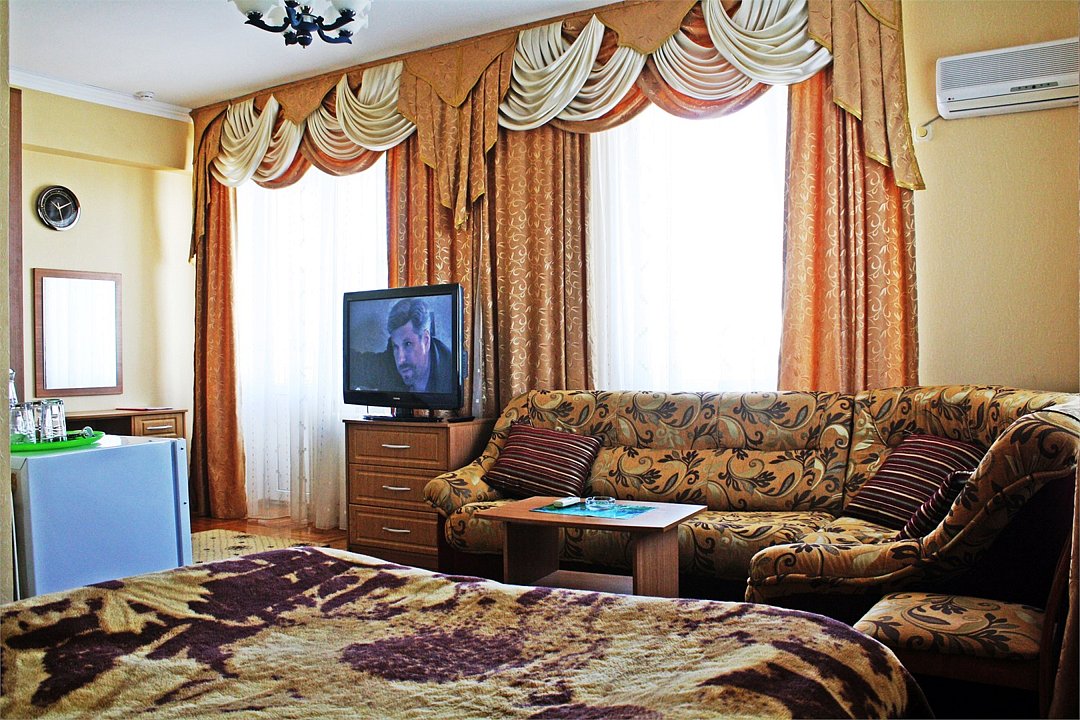 Wi-Fi, холодильник, кондиционер, ванная комната, ванна, санузел, банные полотенца, гигиенические средства, двуспальная кровать, шкаф для одежды, мебельный гарнитур, чайник, диван-кровать, внутренний телефон, телевизор с плоским экраном, без питомцевВ гостиничном номере