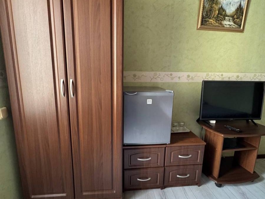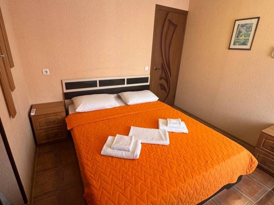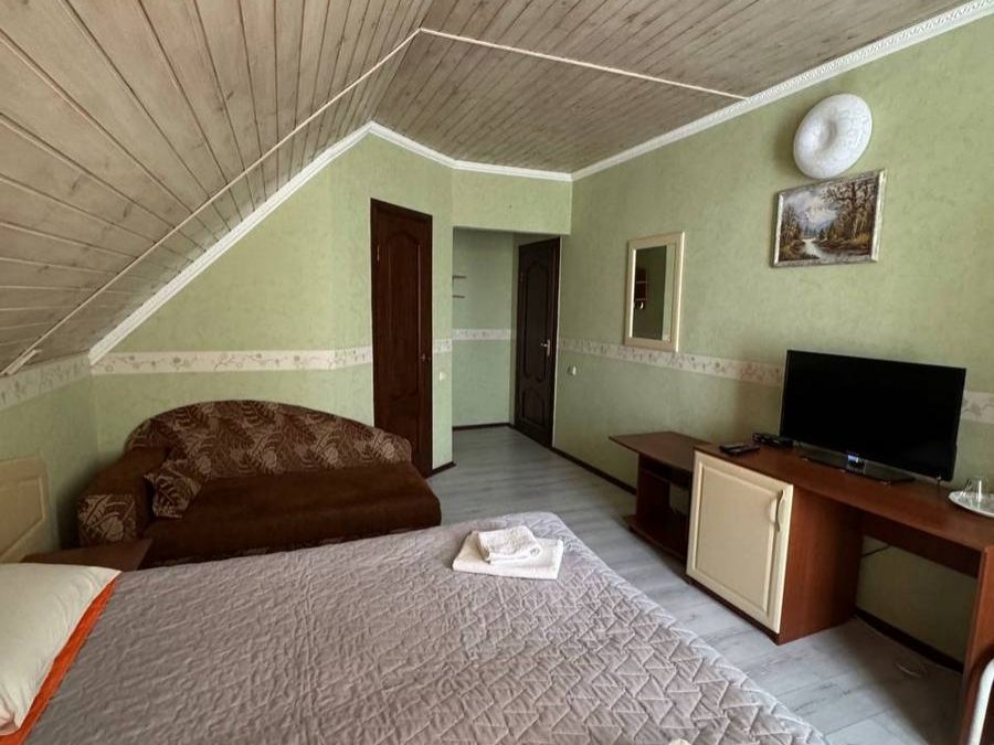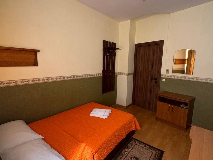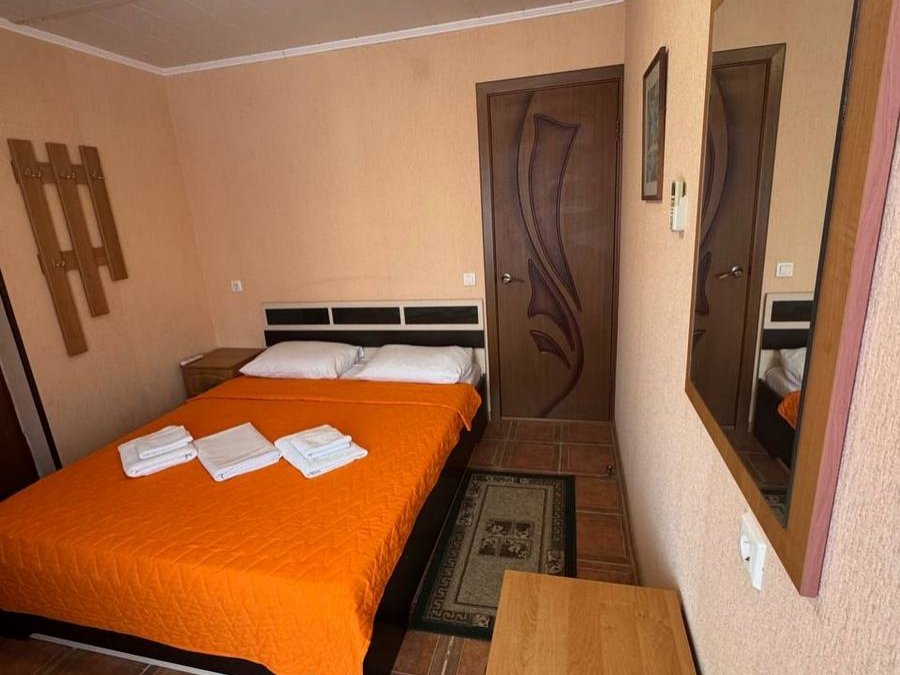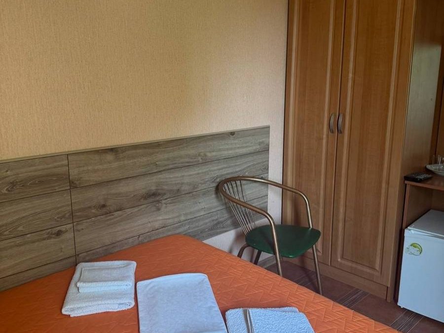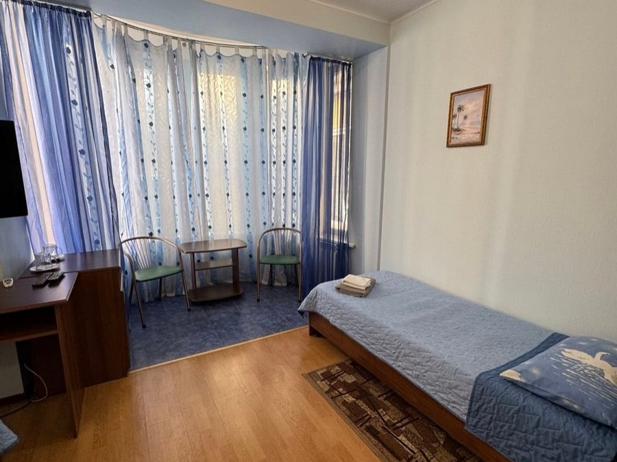 Короткий отпуск с друзьямиТипичный гостевой домАтласные занавески, покрывала и голубые стены. Дверь в номер с витражом))) в ванной душевая кабина и жидкое мыло. Завтрак был включен в стоимость проживания - вареные яйца, яичница, гречневая каша, запеканка с фруктами, сыр, колбаса, консервированные персики, хлопья, чай и кофе. Есть гладильная доска и утюг, на 1 этаже кулер с водой. Персонал отзывчивый, за соседней дверью минимаркет.