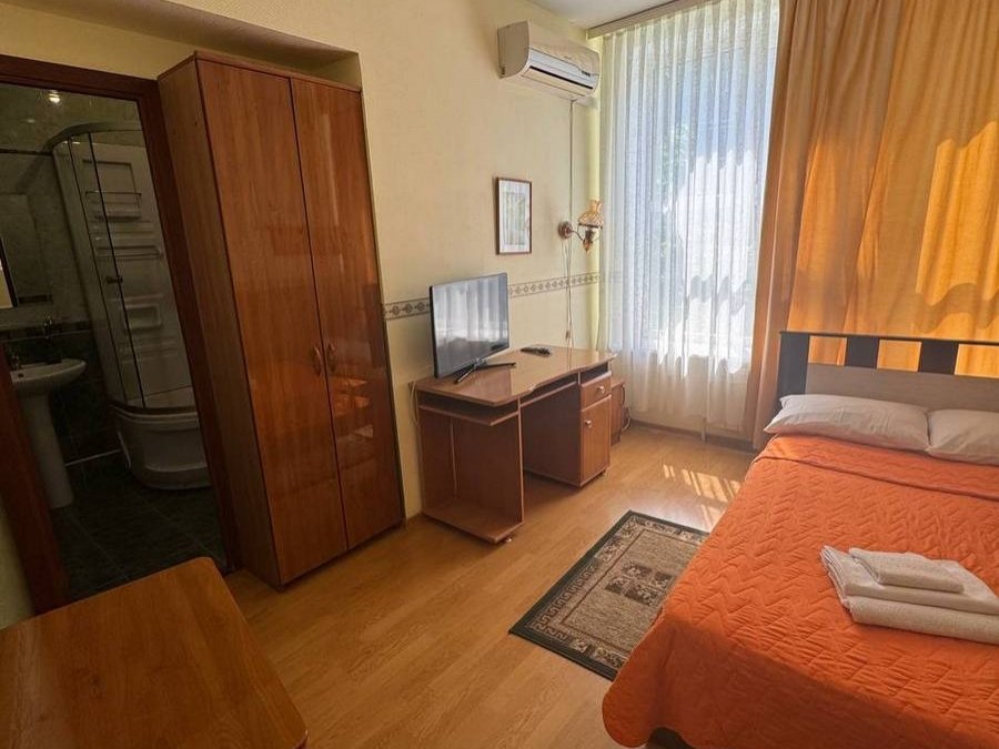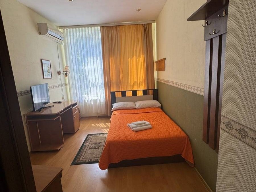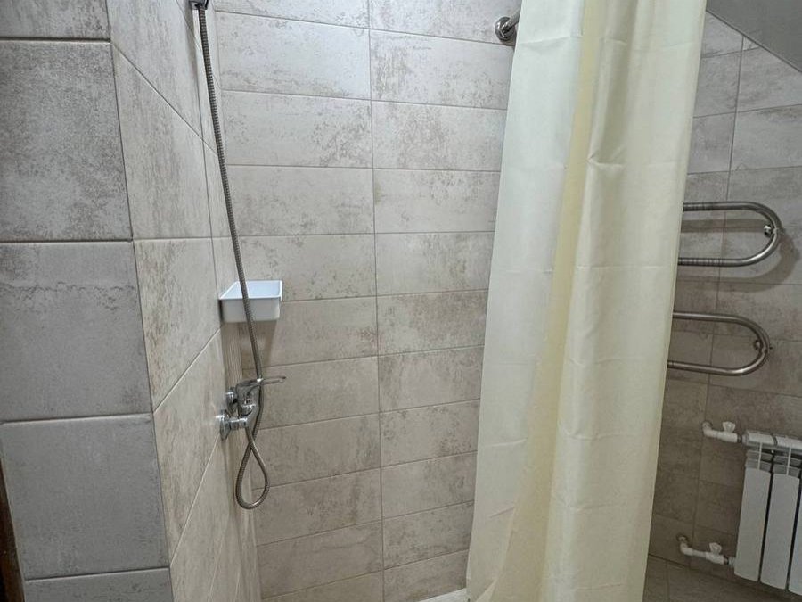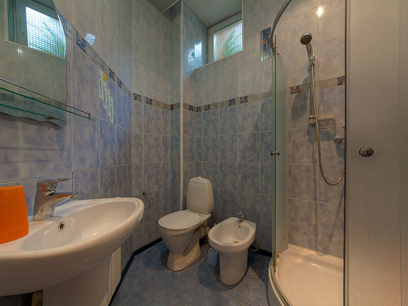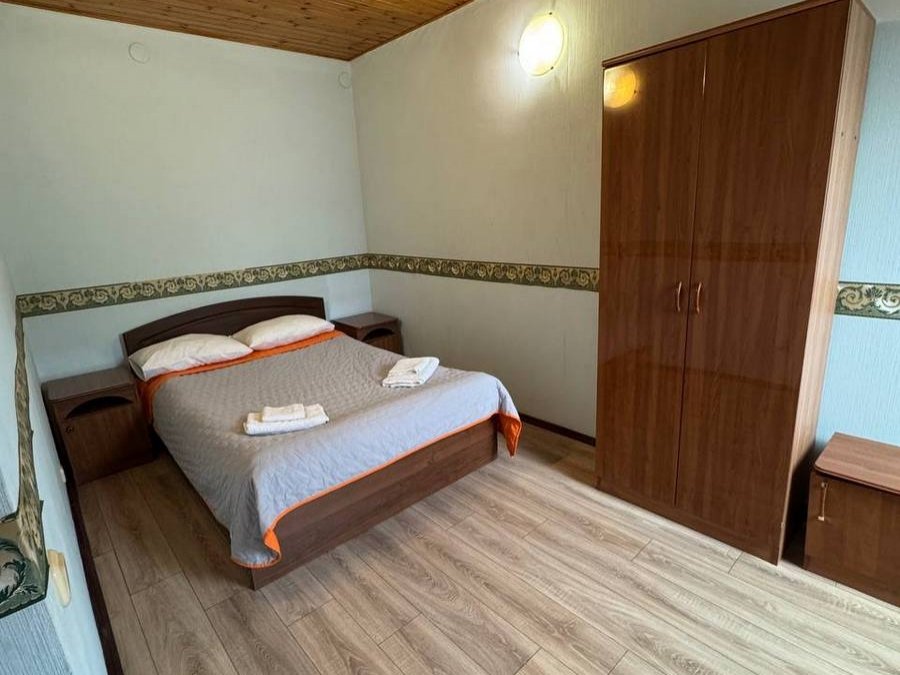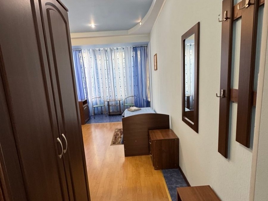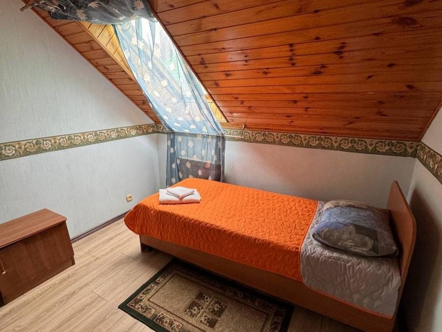 Короткий отпуск с друзьямиТипичный гостевой домАтласные занавески, покрывала и голубые стены. Дверь в номер с витражом))) в ванной душевая кабина и жидкое мыло. Завтрак был включен в стоимость проживания - вареные яйца, яичница, гречневая каша, запеканка с фруктами, сыр, колбаса, консервированные персики, хлопья, чай и кофе. Есть гладильная доска и утюг, на 1 этаже кулер с водой. Персонал отзывчивый, за соседней дверью минимаркет.