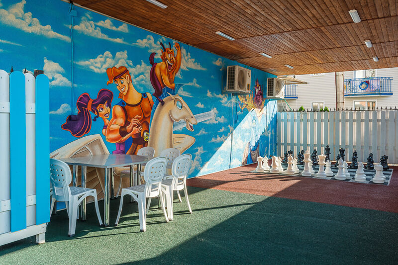 На территории отеля находится большой открытый бассейн с морской водой, детская игровая площадка, фонтан, беседки и автомобильная парковка с видеонаблюдением.