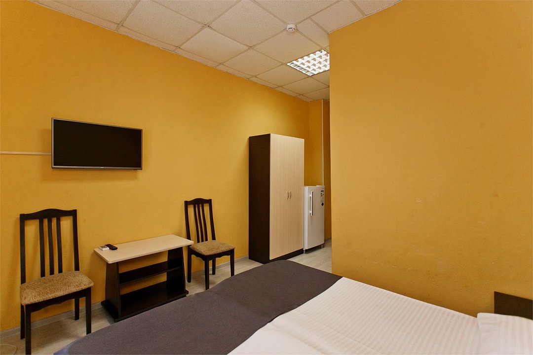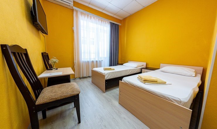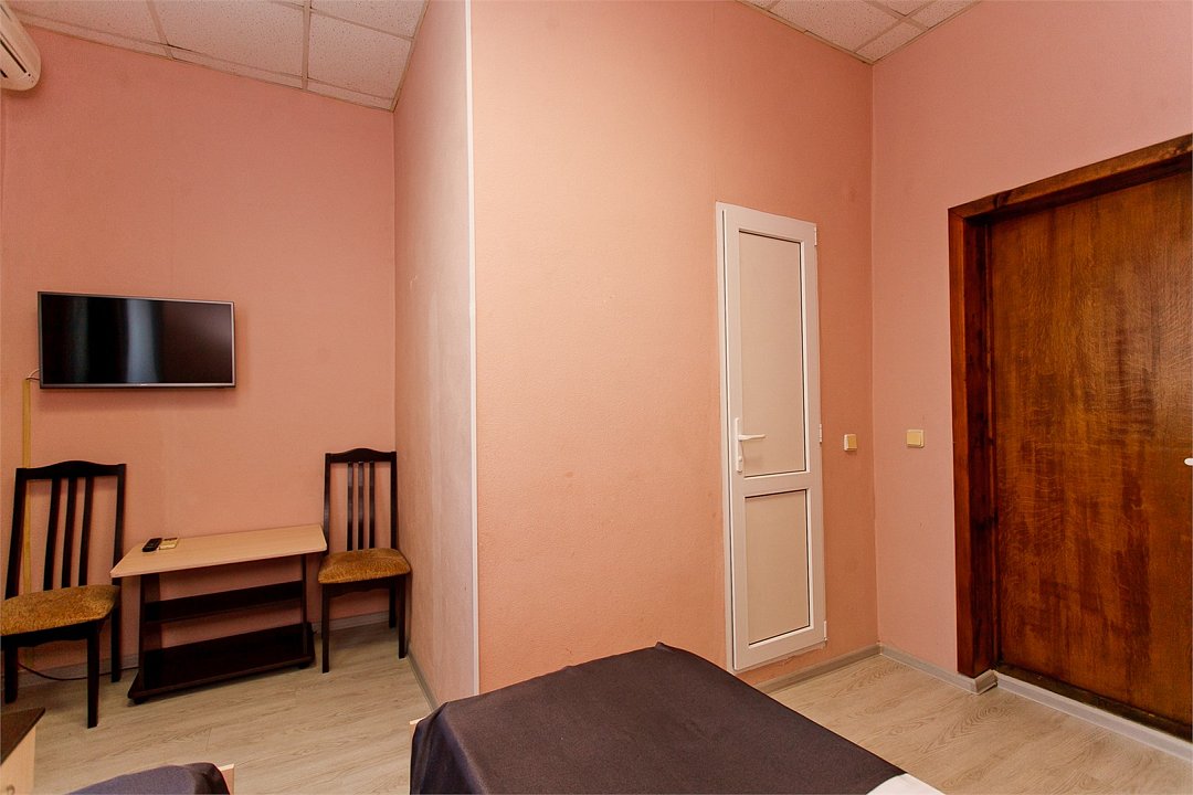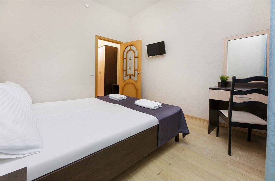 телевизор, Wi-Fi, холодильник, кондиционер, банные полотенца, две односпальные или большая двуспальная кровать, шкаф для одежды, вешалки, журнальный столик, зеркало, раковина, душ, вид во двор, стул, тумба, туалет, цифровое тв, без питомцевВ номере