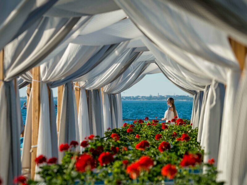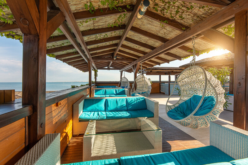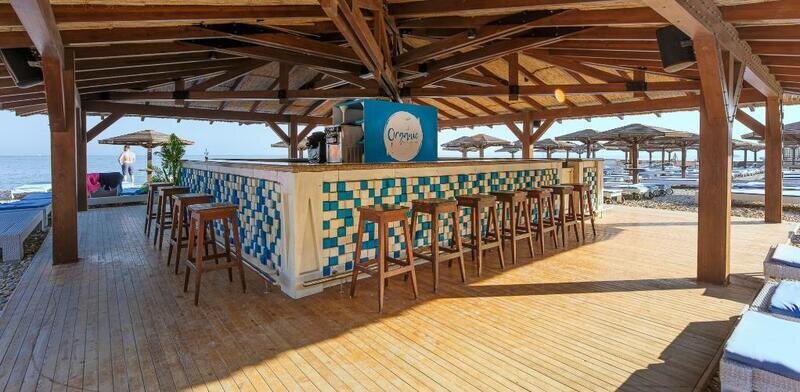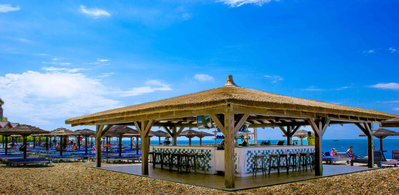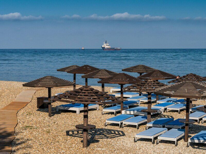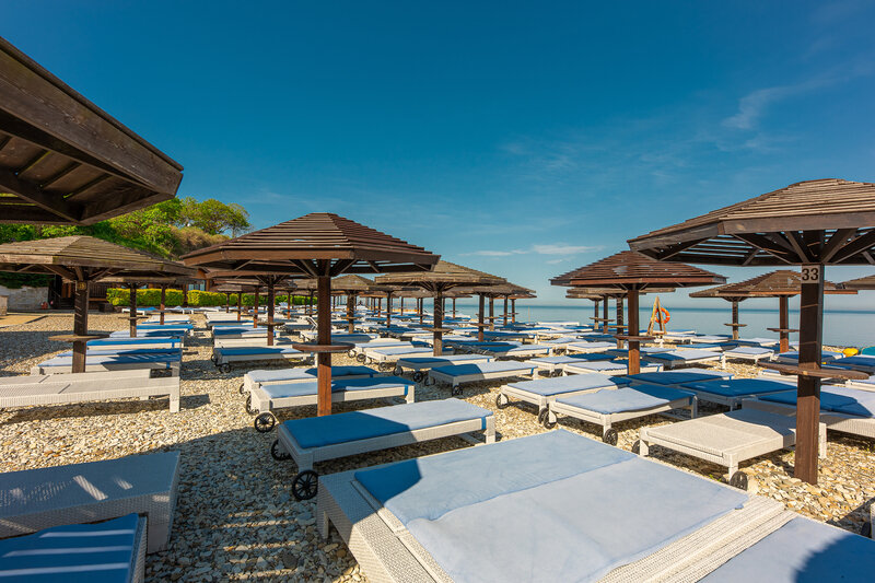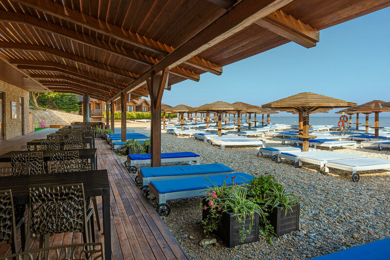 На территории отеля в 10 метрах от бунгало разместился собственный пляж. Галечный пляж оснащен всем необходимым – душевыми, кабинками для переодевания, комфортными лежаками, навесами работают летние кафе и бары.