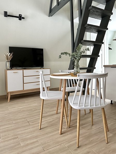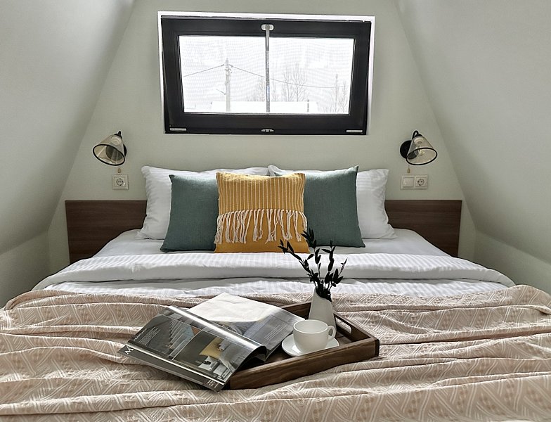 Имеет 2 этажа, рассчитан максимально на 6 человек. На первом этаже, просторная гостиная с диваном, телевизором, камином, кухонная зона оборудована современным кухонным гарнитуром и обеденным столом. В кухне есть: плита, холодильник с морозильником, посудомоечная машина, микроволновка, чайник, кофемашина. Также на первом этаже есть санузел и современная ванная комната с душевой кабиной и баней на дровах. Спальня с двумя уютными односпальными кроватями. На втором этаже расположена вторая спальня с роскошной двуспальной кроватью. В доме теплые полы.