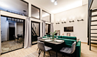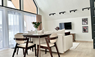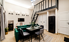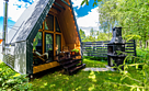 Имеет 2 этажа, рассчитан максимально на 4 человека. На первом этаже дома, просторная гостиная с диваном, телевизором, камином, кухонная зона оборудована современным кухонным гарнитуром и обеденным столом. В кухне есть: плита, холодильник с морозильником, микроволновка, чайник. Также на первом этаже есть санузел с душевой кабиной. На втором этаже расположена роскошная двуспальная кровать. В доме теплые полы и дровяной камин.