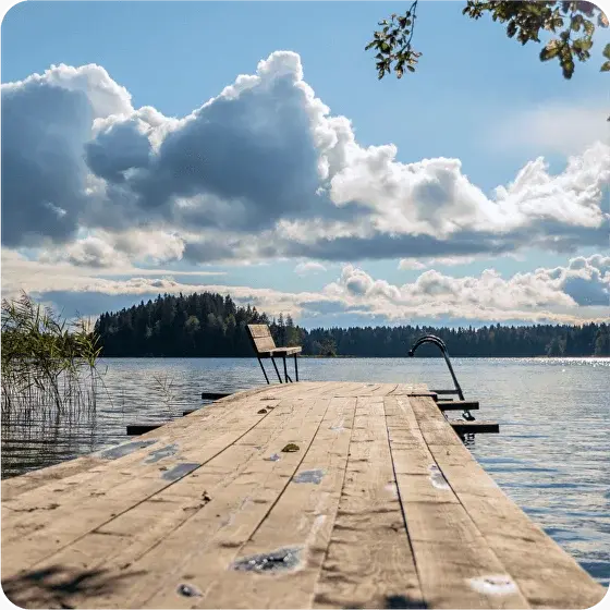 Таежный дом находится на низине холма ближе всего к озеру — 20 метров. Вы не увидите другие домики из этой точки, вам даже может показаться, что вы единственные гости во всей стране Поозерья. Ближе к воде находится мангальная зона, вы можете накрывать завтраки на природе или готовить ужины на углях.