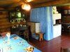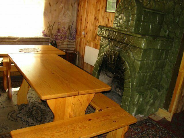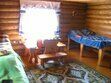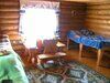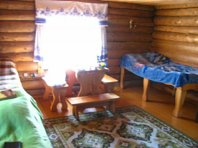На первом этаже большой зал для отдыха со столом и лавками, три односпальные кровати и раскладной диван. Кухня со всем необходимым, прихожая, русская печь. На втором этаже отдельная комнатка с 1 кроватью, спальня с 4 односпальными кроватями. Удобства на территории.