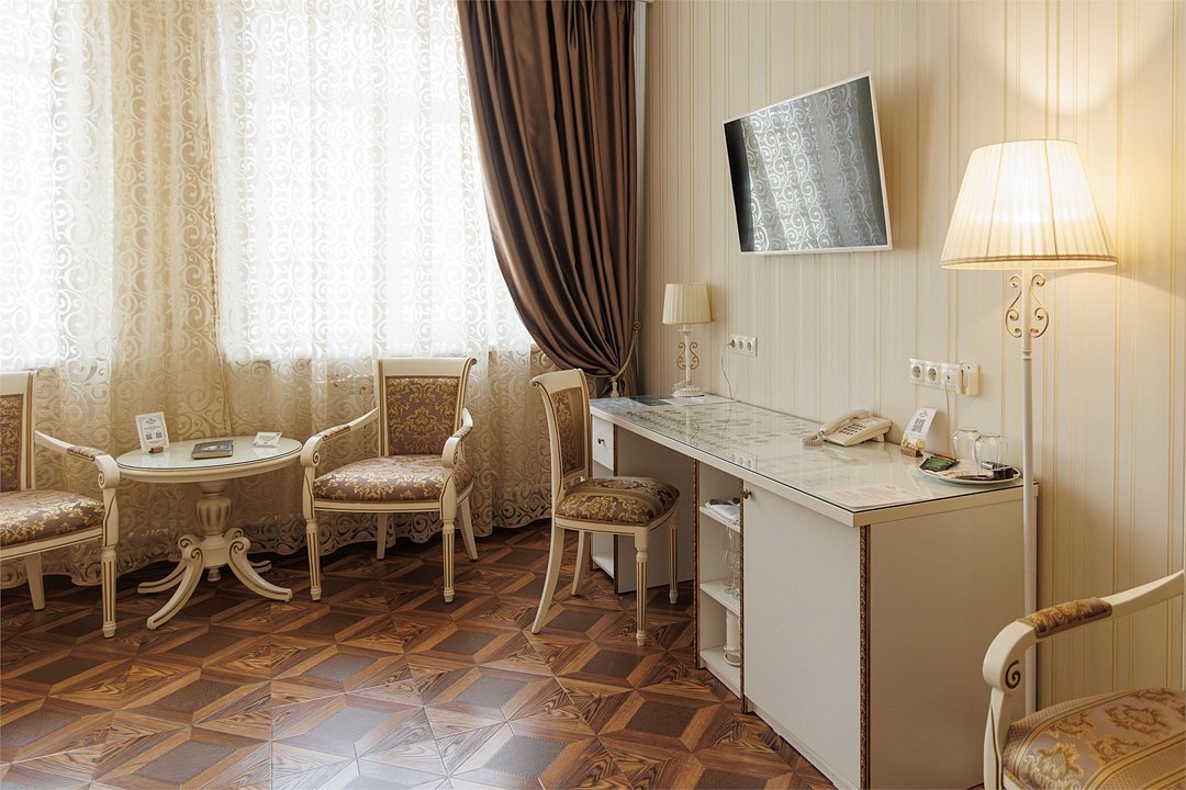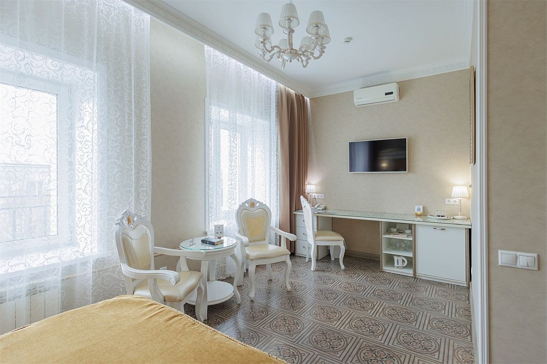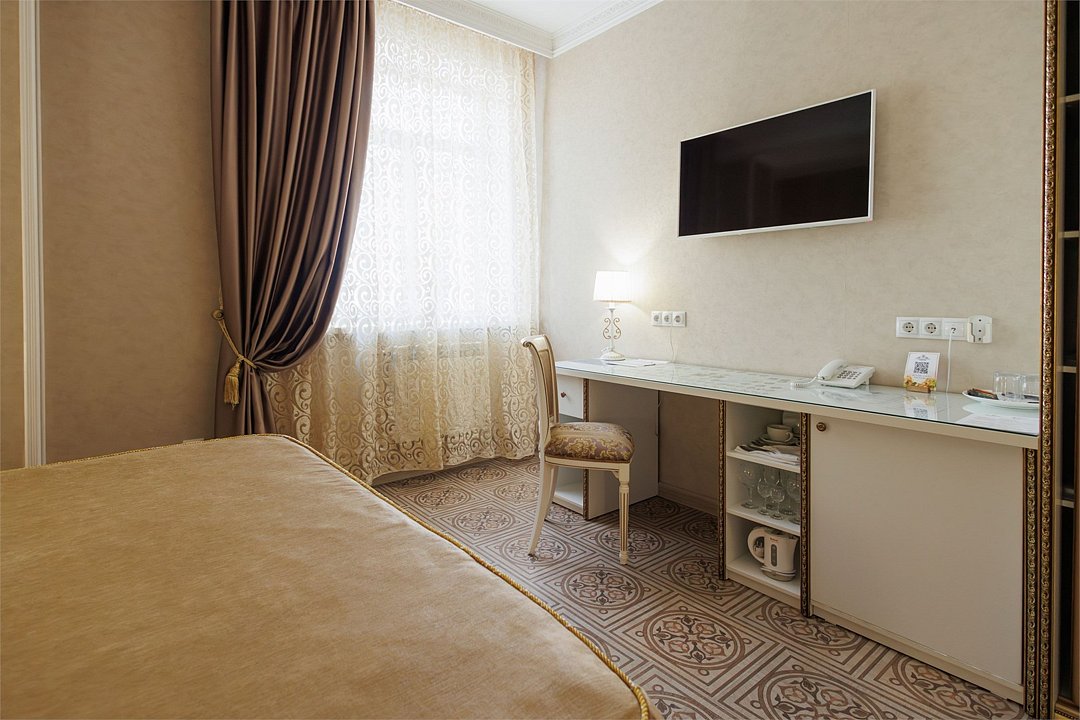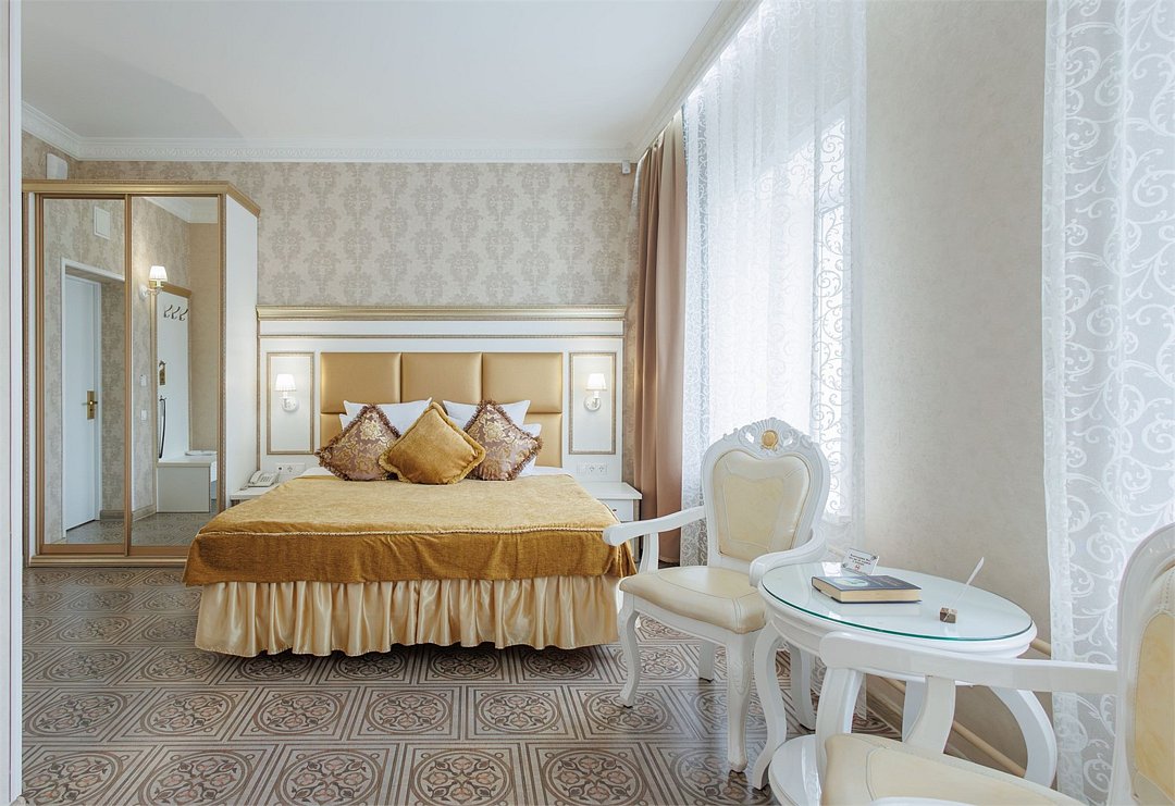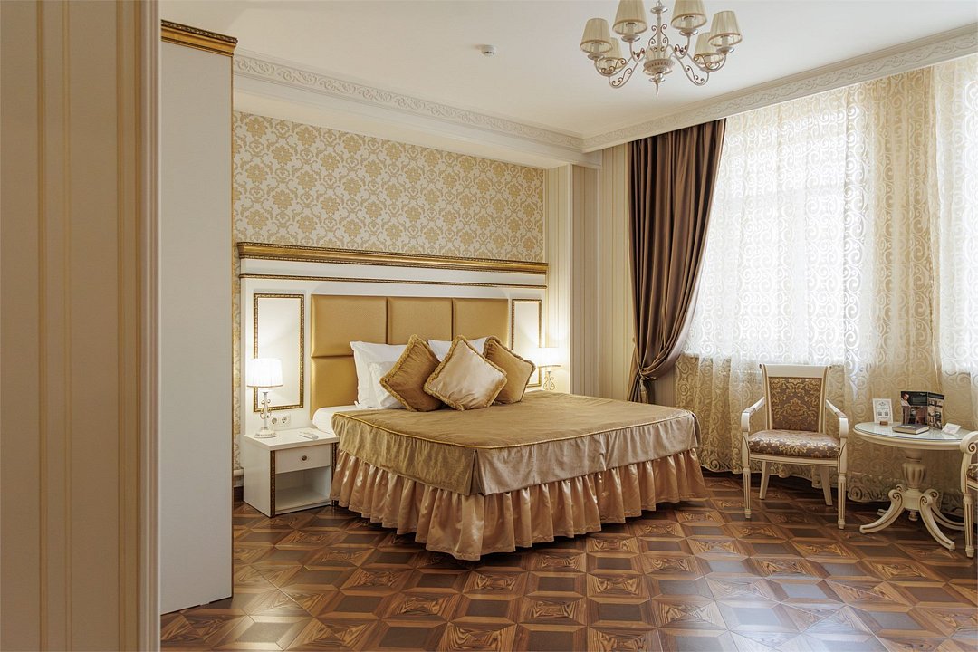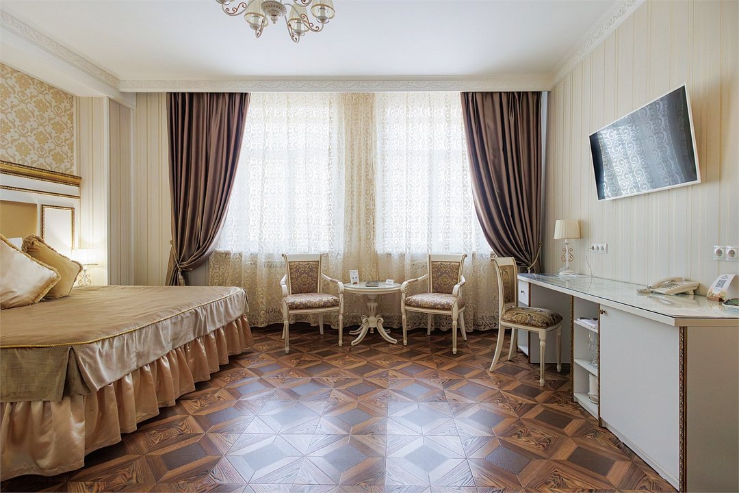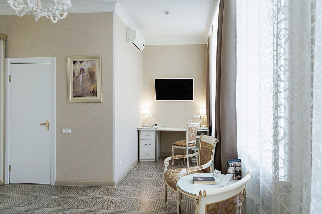 Изысканный однокомнатный номер в золотисто-бежевых тонах, выполнен в классическом стиле 19 века, площадью 30 кв. м., с элегантной классической мебелью, оснащенный всем необходимым для работы и отдыха. Состоит из спальной зоны с большой двуспальной кроватью King size с матрасом по индивидуальному заказу, рабочей зоны с письменным столом, а также зоны отдыха с двумя креслами и журнальным столиком. В номере изысканная мягкая мебель, декорированная натуральной кожей. К услугам гостей бесплатный интернет WiFi, ЖК-телевизор с системой SMART (прямой доступ в Интернет), индивидуальный сейф и многое другое.Услуги и удобства