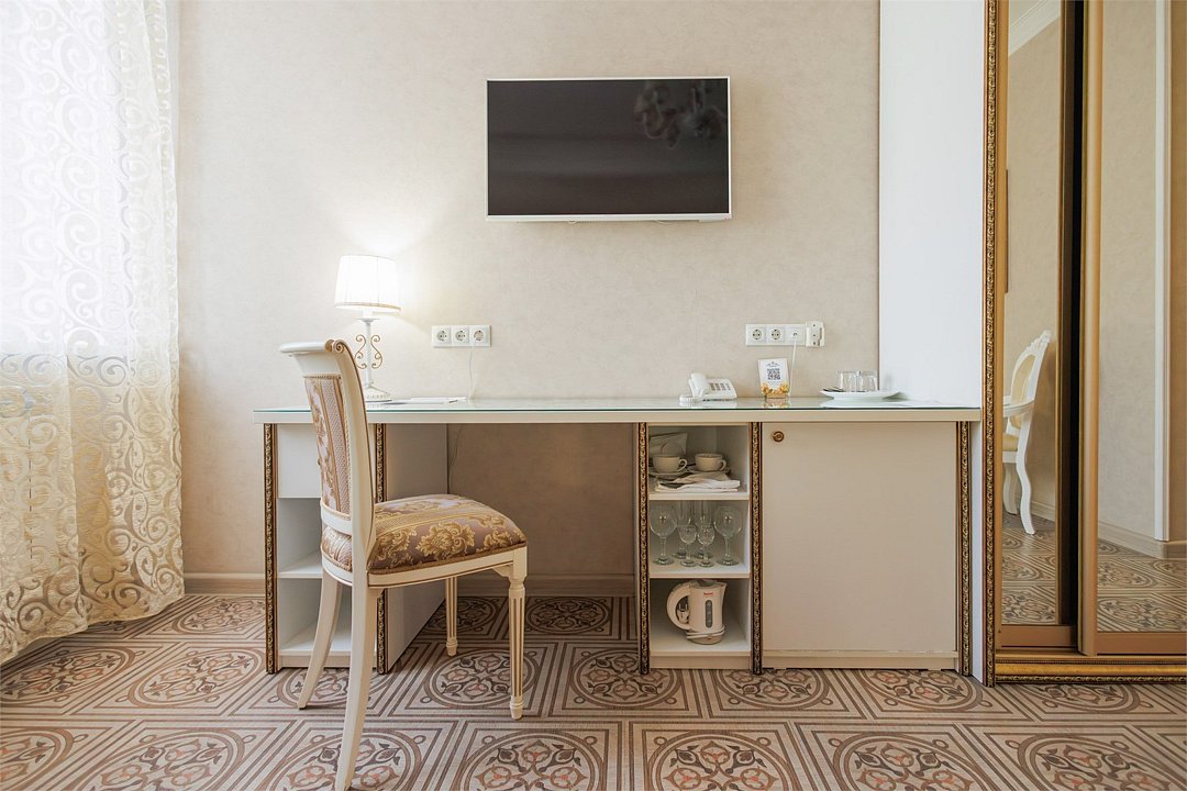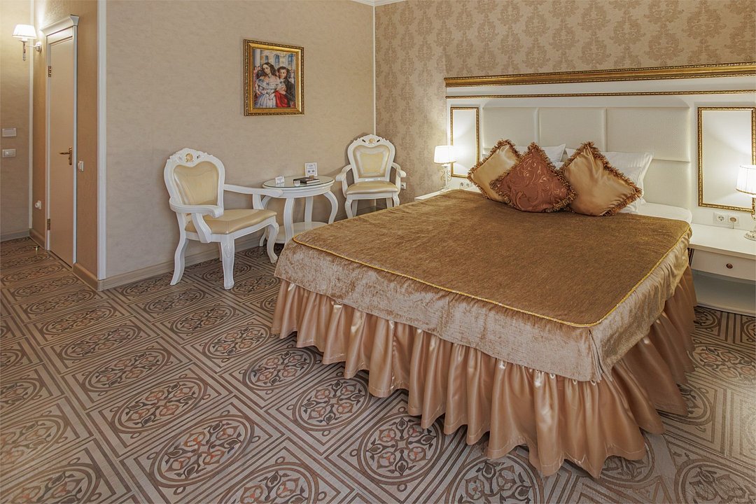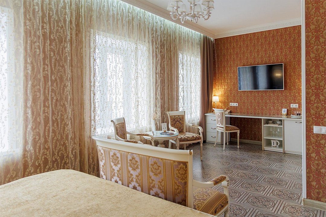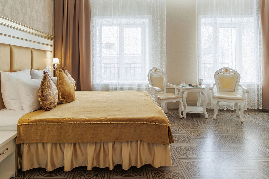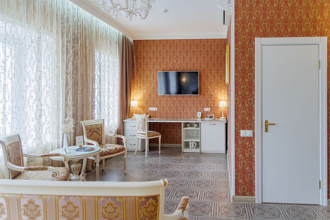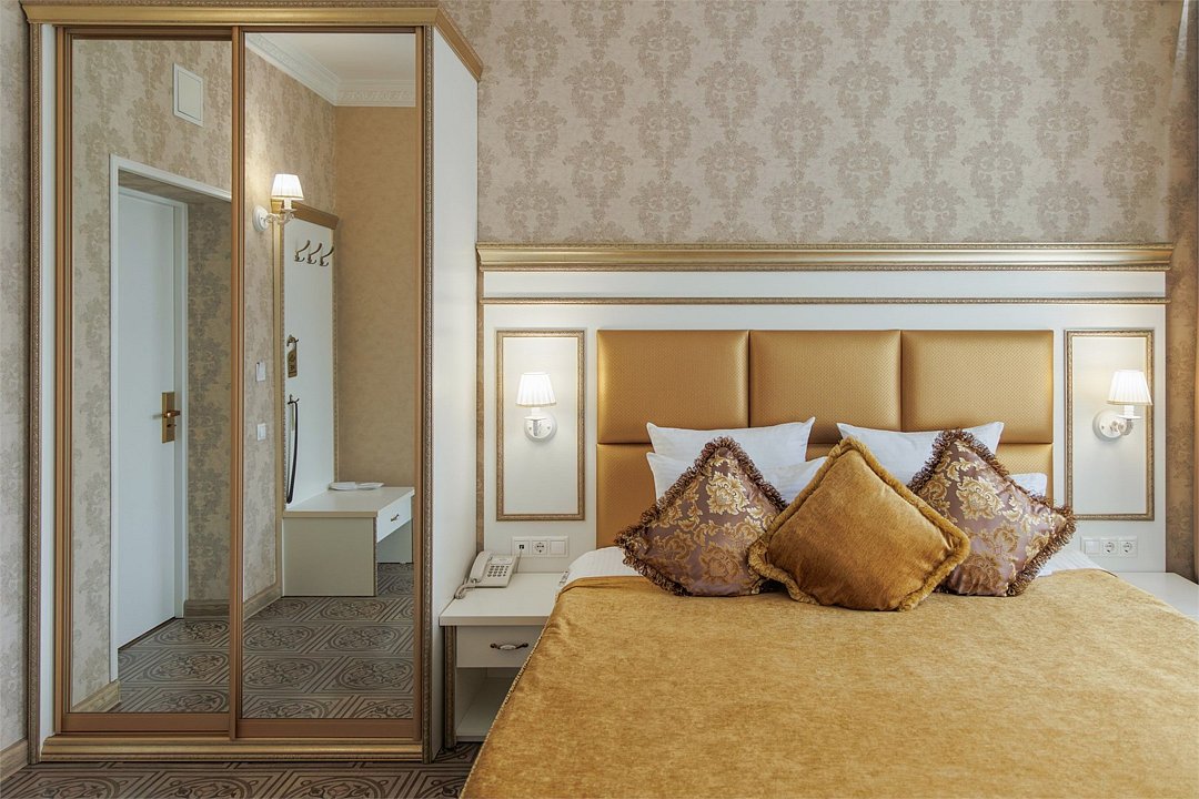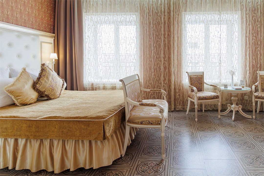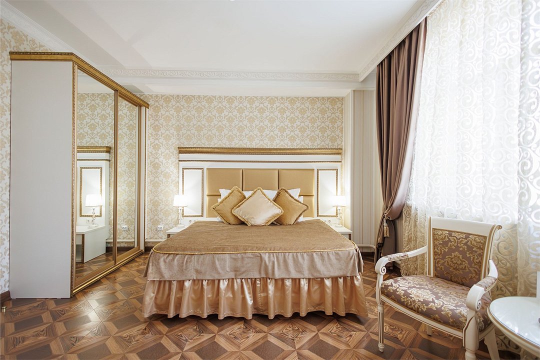 Изысканный однокомнатный номер в золотисто-бежевых тонах, выполнен в классическом стиле 19 века, площадью 30 кв. м., с элегантной классической мебелью, оснащенный всем необходимым для работы и отдыха. Состоит из спальной зоны с большой двуспальной кроватью King size с матрасом по индивидуальному заказу, рабочей зоны с письменным столом, а также зоны отдыха с двумя креслами и журнальным столиком. В номере изысканная мягкая мебель, декорированная натуральной кожей. К услугам гостей бесплатный интернет WiFi, ЖК-телевизор с системой SMART (прямой доступ в Интернет), индивидуальный сейф и многое другое.Услуги и удобства