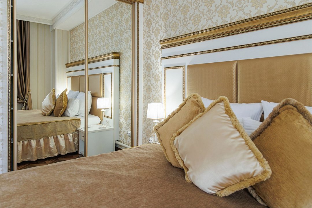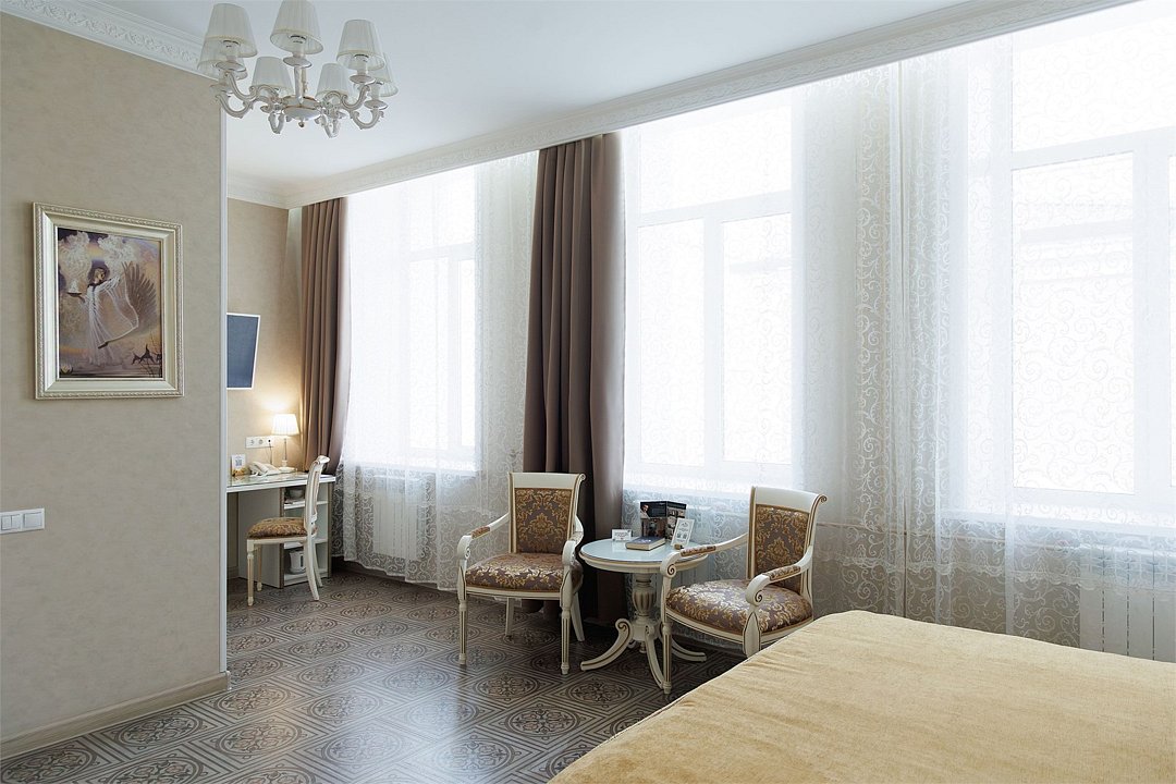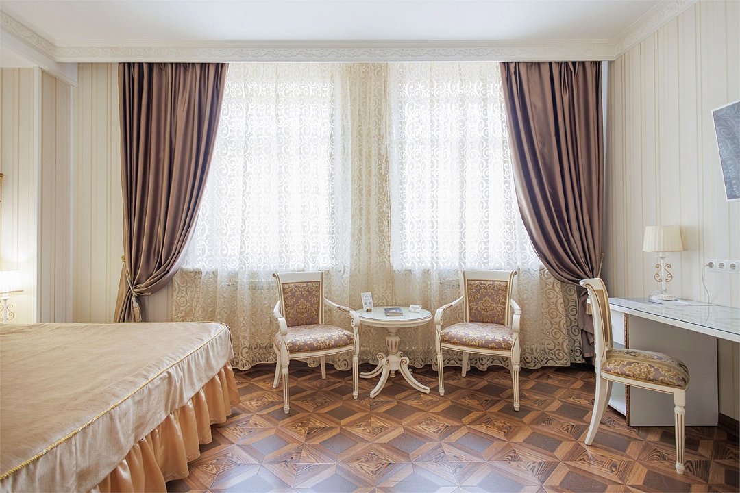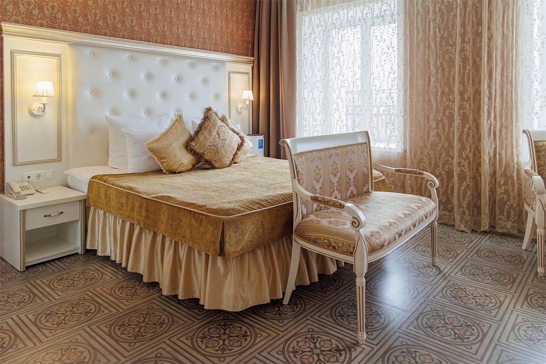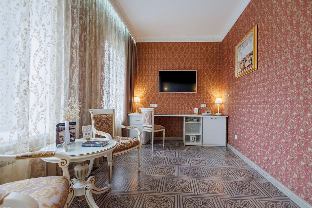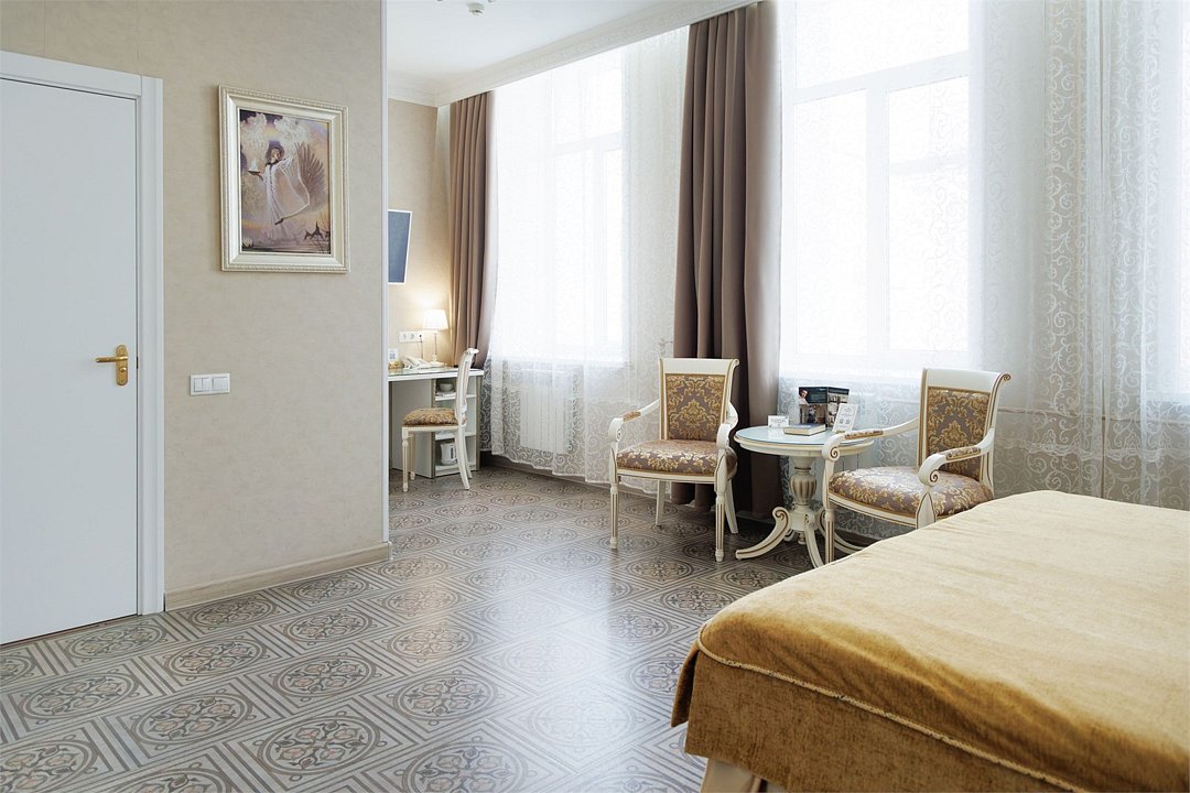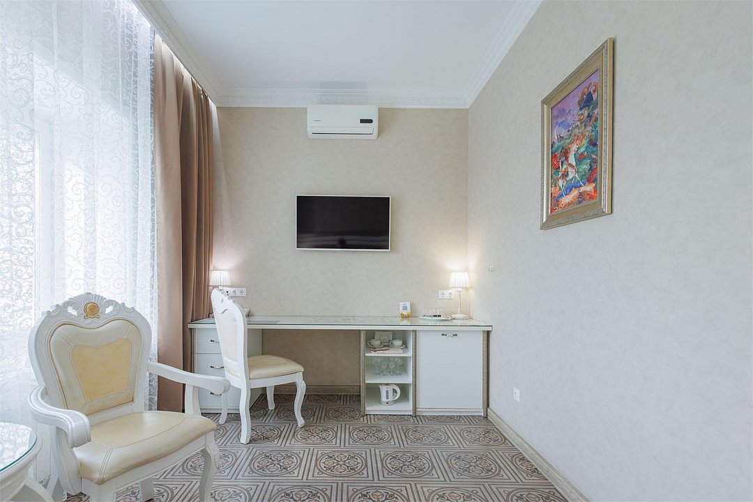 Изысканный однокомнатный номер в золотисто-бежевых тонах, выполнен в классическом стиле 19 века, площадью 30 кв. м., с элегантной классической мебелью, оснащенный всем необходимым для работы и отдыха. Состоит из спальной зоны с большой двуспальной кроватью King size с матрасом по индивидуальному заказу, рабочей зоны с письменным столом, а также зоны отдыха с двумя креслами и журнальным столиком. В номере изысканная мягкая мебель, декорированная натуральной кожей. К услугам гостей бесплатный интернет WiFi, ЖК-телевизор с системой SMART (прямой доступ в Интернет), индивидуальный сейф и многое другое.Услуги и удобства