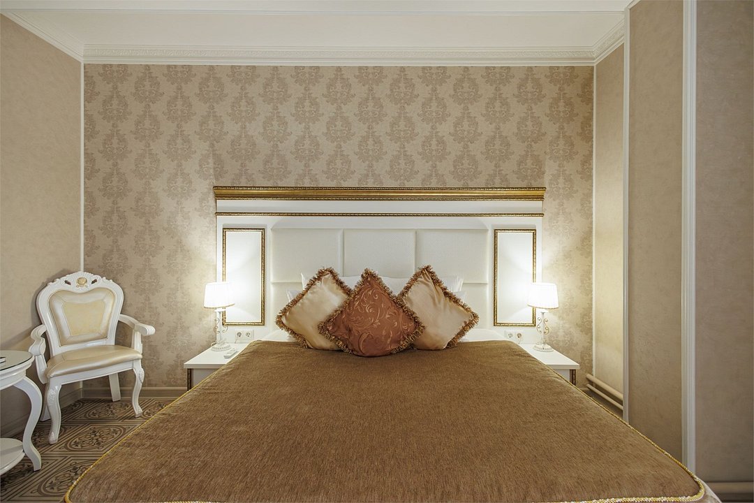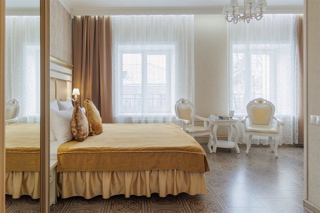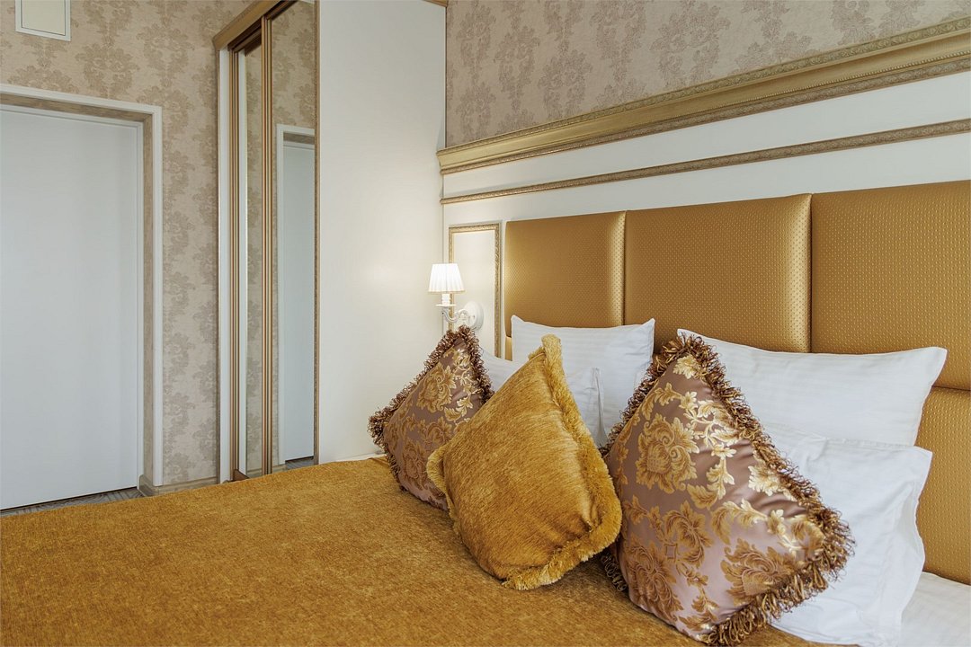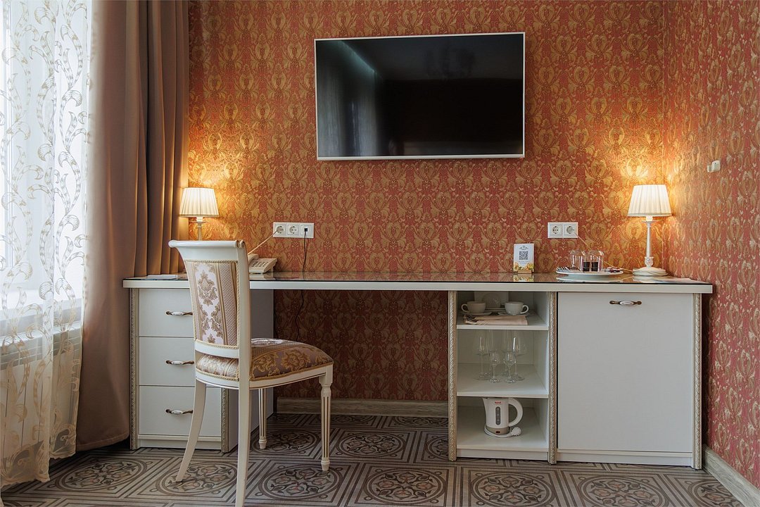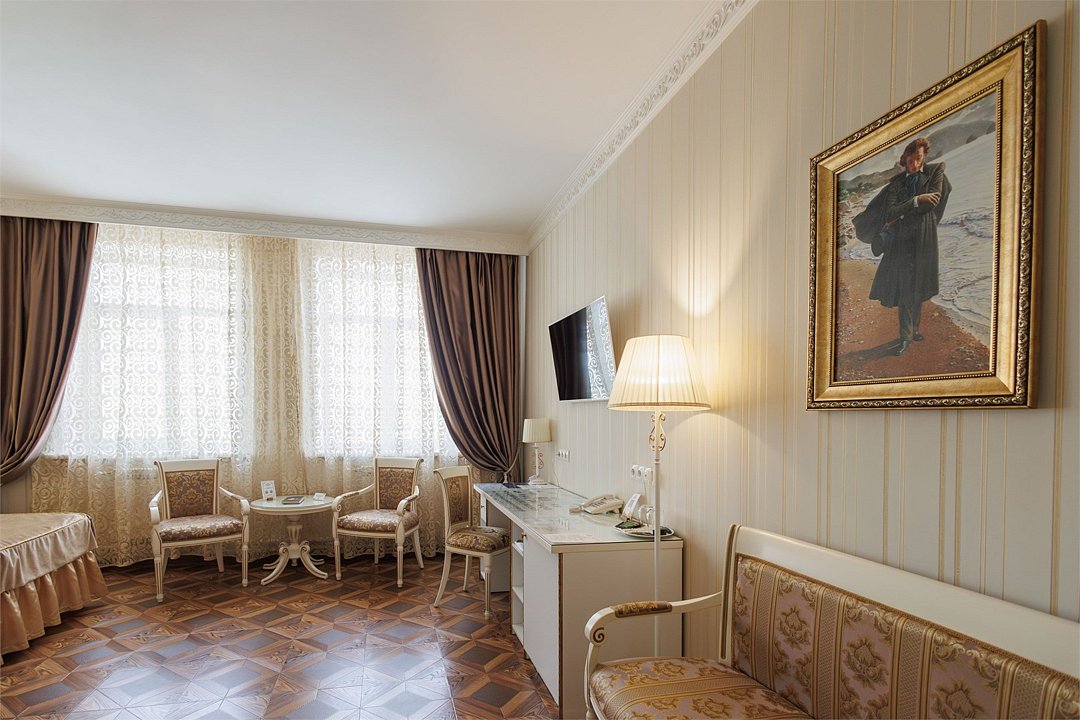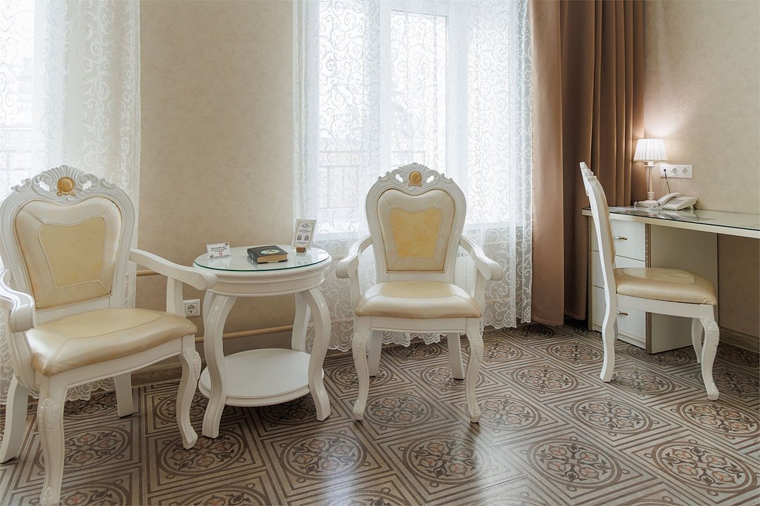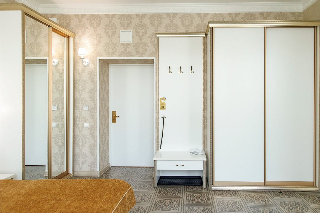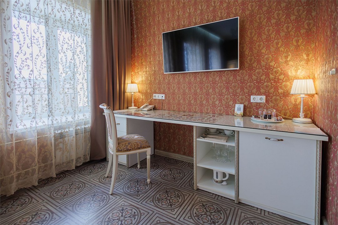 Изысканный однокомнатный номер в золотисто-бежевых тонах, выполнен в классическом стиле 19 века, площадью 30 кв. м., с элегантной классической мебелью, оснащенный всем необходимым для работы и отдыха. Состоит из спальной зоны с большой двуспальной кроватью King size с матрасом по индивидуальному заказу, рабочей зоны с письменным столом, а также зоны отдыха с двумя креслами и журнальным столиком. В номере изысканная мягкая мебель, декорированная натуральной кожей. К услугам гостей бесплатный интернет WiFi, ЖК-телевизор с системой SMART (прямой доступ в Интернет), индивидуальный сейф и многое другое.Услуги и удобства