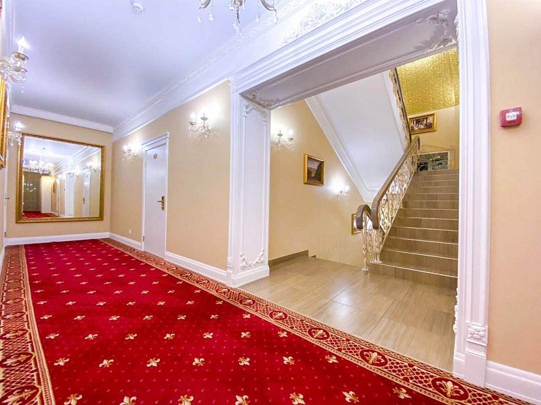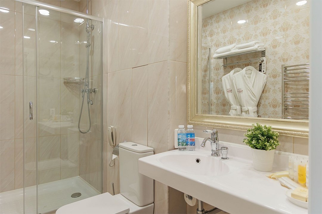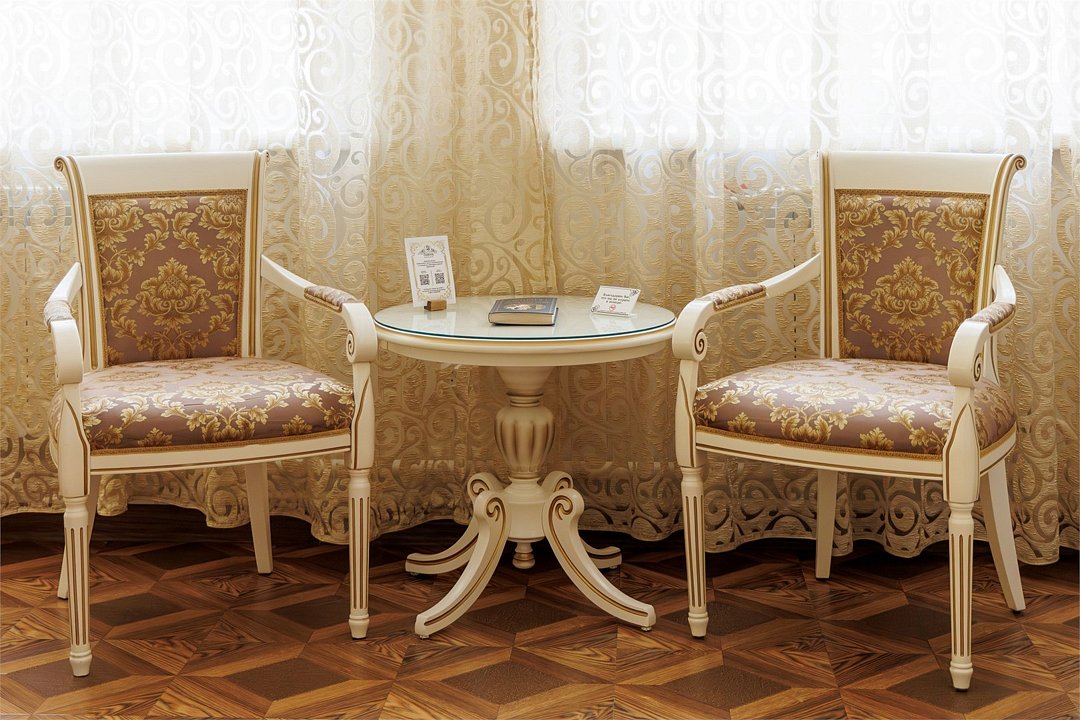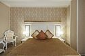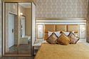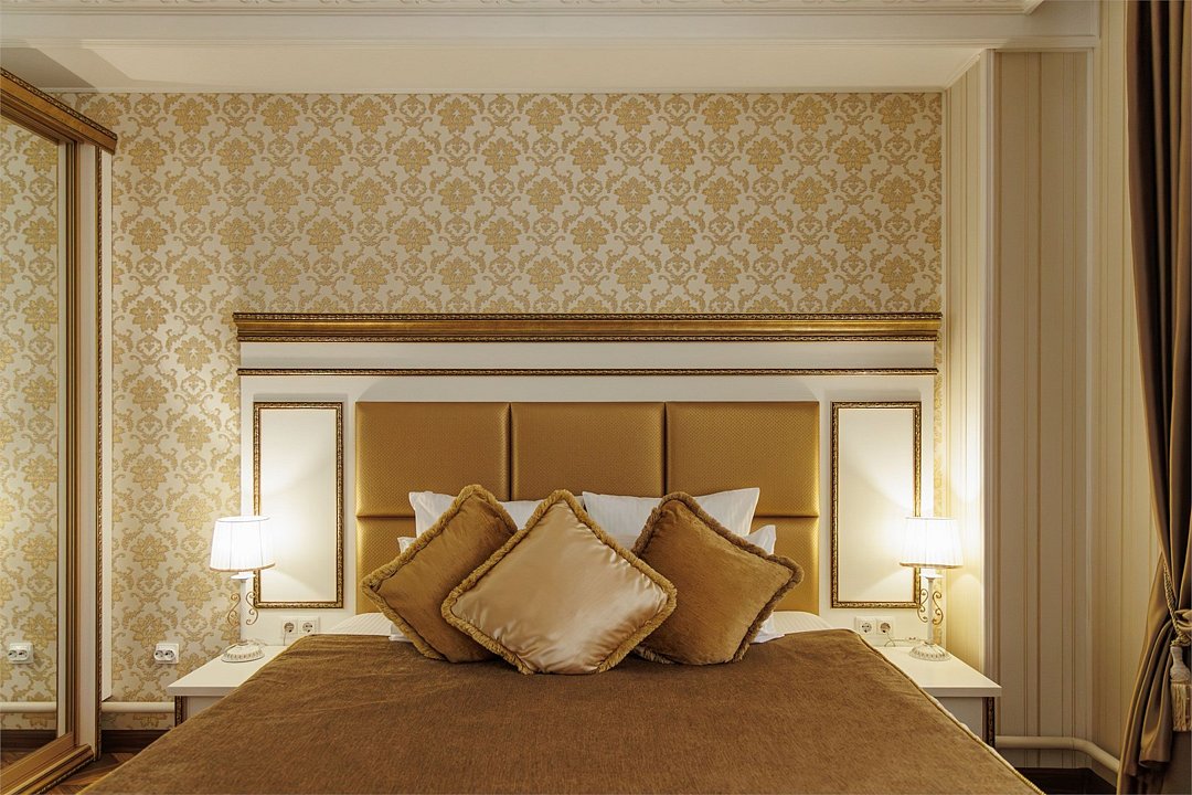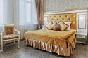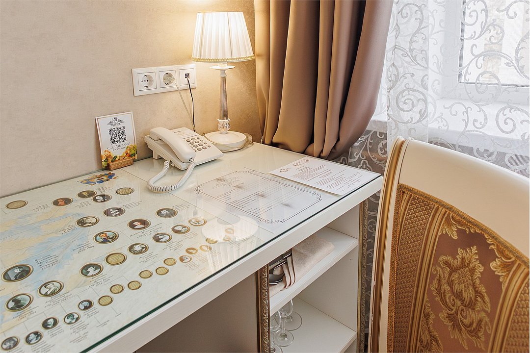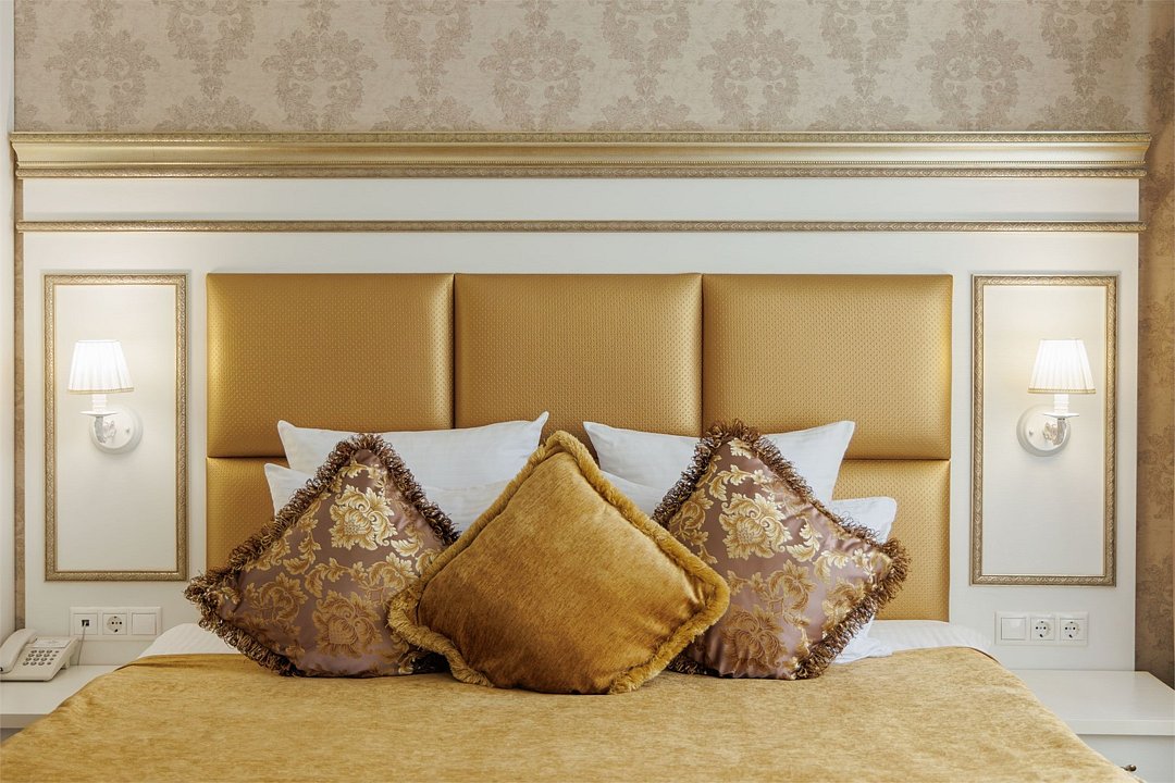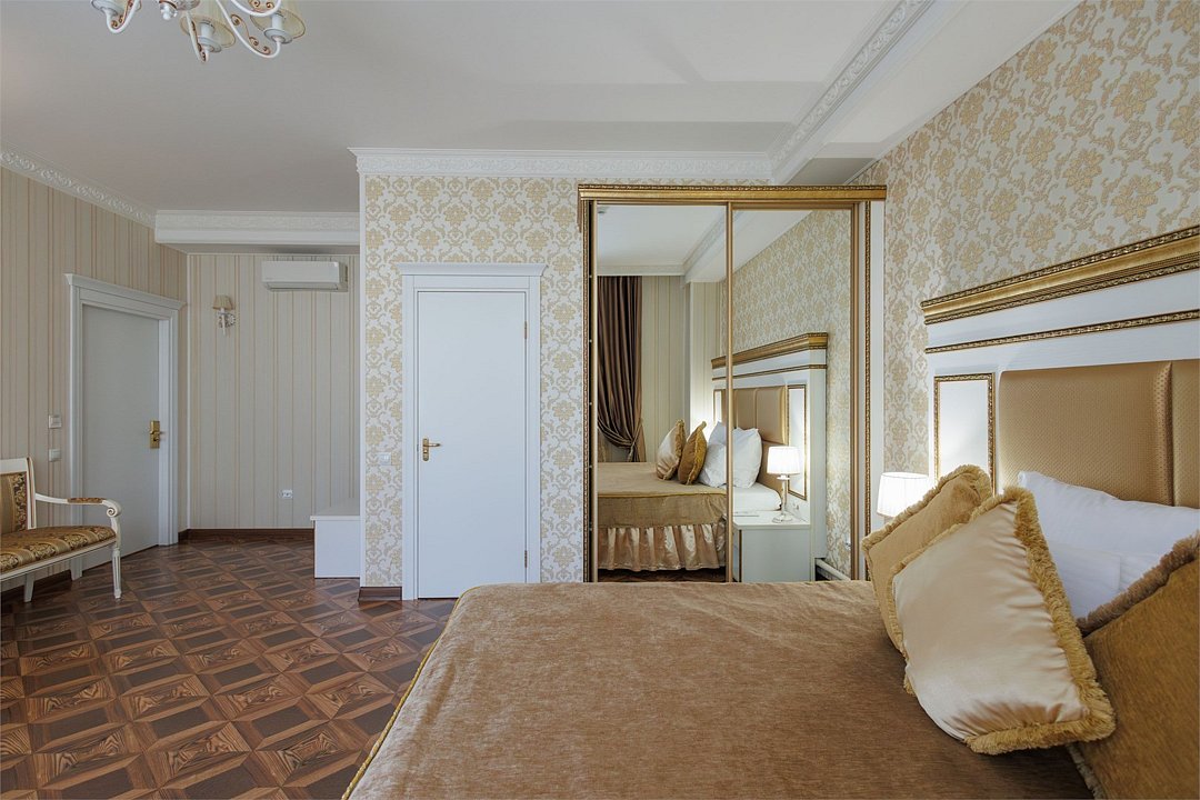 Изысканный однокомнатный номер в золотисто-бежевых тонах, выполнен в классическом стиле 19 века, площадью 30 кв. м., с элегантной классической мебелью, оснащенный всем необходимым для работы и отдыха. Состоит из спальной зоны с большой двуспальной кроватью King size с матрасом по индивидуальному заказу, рабочей зоны с письменным столом, а также зоны отдыха с двумя креслами и журнальным столиком. В номере изысканная мягкая мебель, декорированная натуральной кожей. К услугам гостей бесплатный интернет WiFi, ЖК-телевизор с системой SMART (прямой доступ в Интернет), индивидуальный сейф и многое другое.Услуги и удобства
