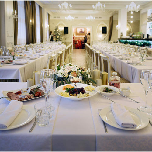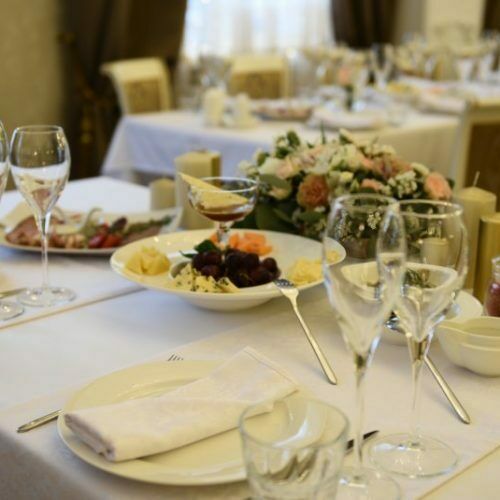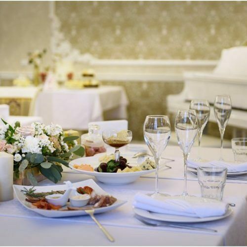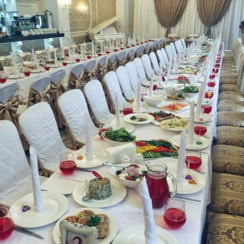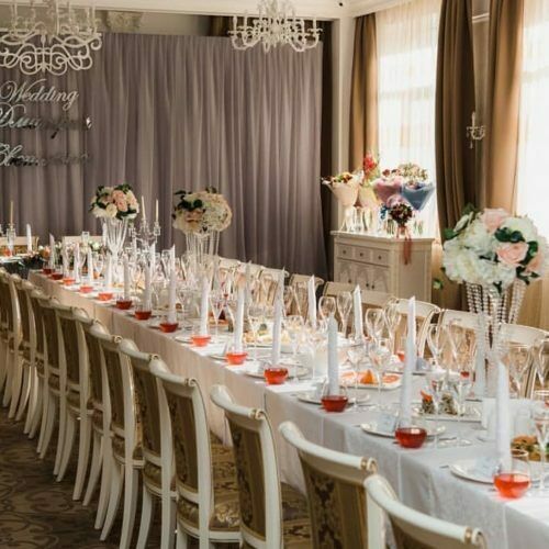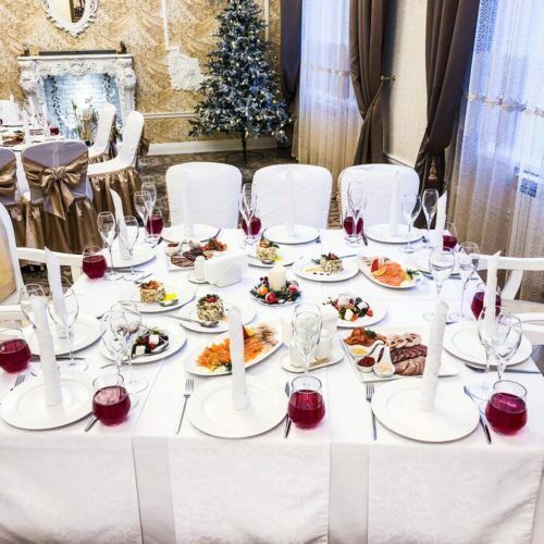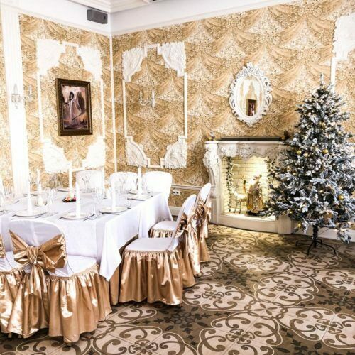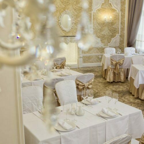Для торжественных событий предоставляются нарядные белые с золотом — чехлы для столов и стульев. Зал идеально подходит для уютных торжественных мероприятий, рассчитанных на 30-35 гостей.