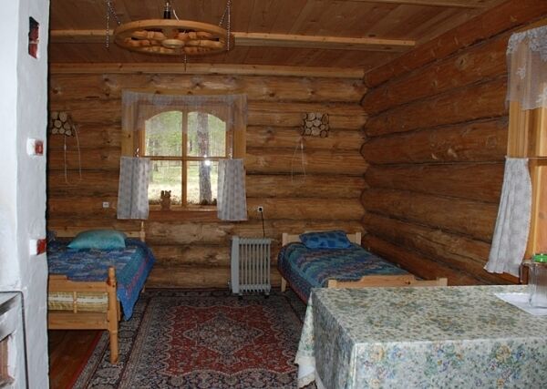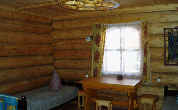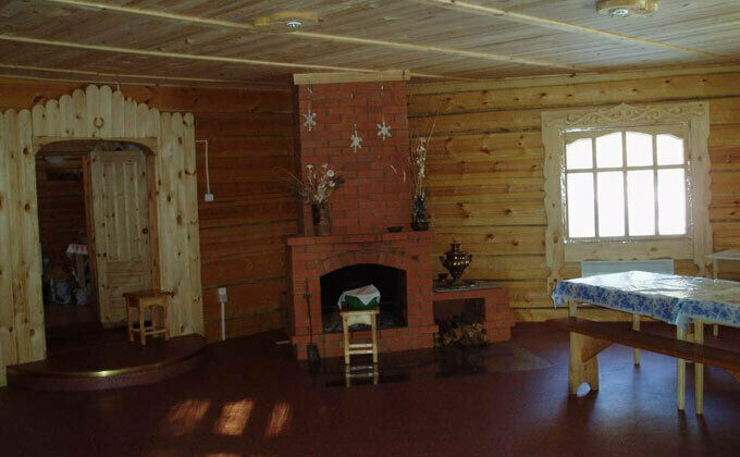 Первый этаж занимает гостевая с камином, деревянными столами и кухня. Каминный зал рассчитан на 50 человек. Второй этаж - жилой, размещение на диванах или русских полатях, всего 8 мест.