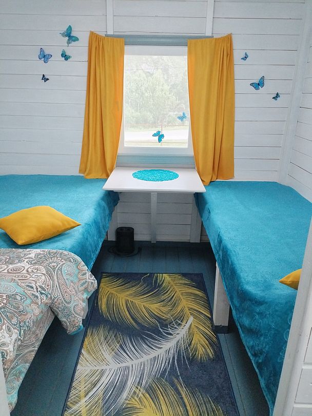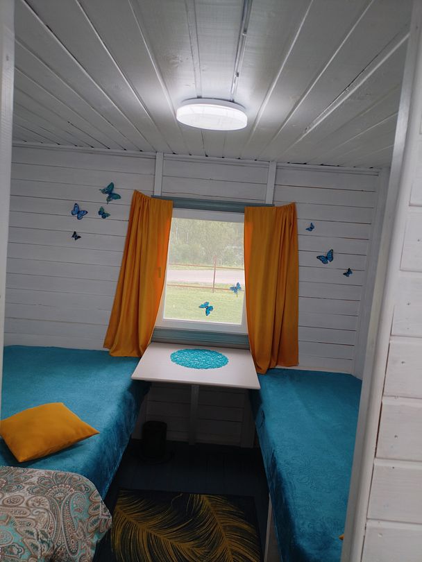 Каждый дом рассчитан на размещение троих человек. Спальные места представлены двуспальной и односпальной кроватями. А с террасы открывается потрясающий вид на реку и горы. Удобства находятся на улице.