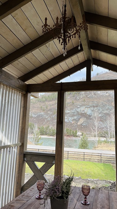 Коттедж с прекрасным видом на Катунь и горы. В доме большой зал, совмещенный с кухней, с большим столом на компанию. В кухне есть посуда для приготовления пищи, микроволновка, посудомоечная машина, холодильник, теплый пол.
