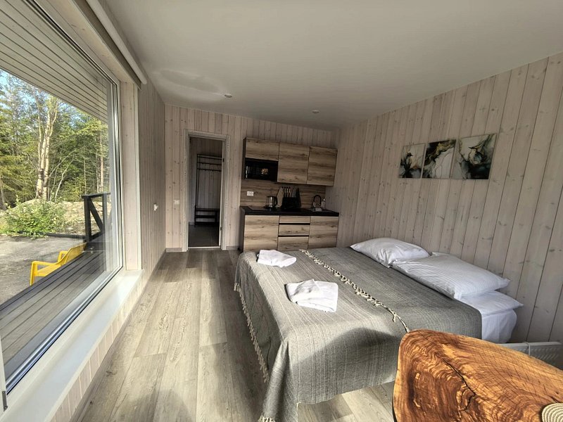 Каждый домик «Кускас», доступный для аренды, оснащён всем необходимым для комфортного проживания. Рядом расположена шашлычная зона с мангалом.