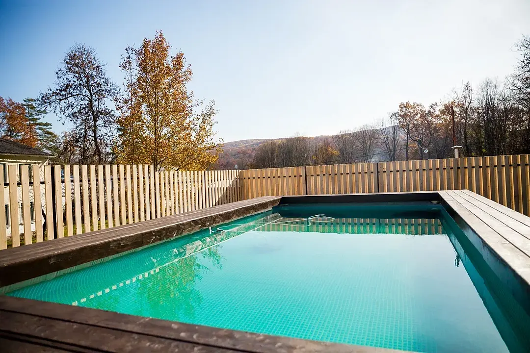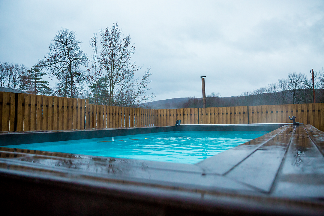 Открытый подогреваемый бассейн на дровах с видом на горно-лесной массив.