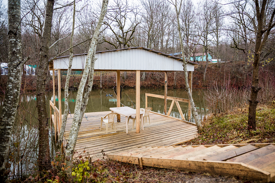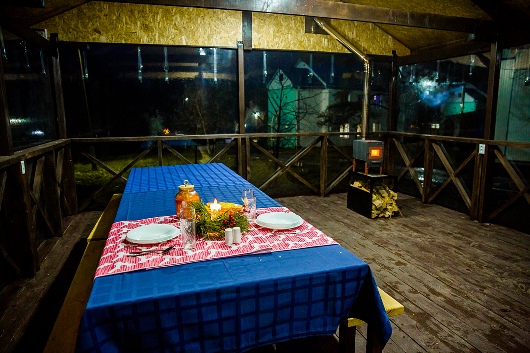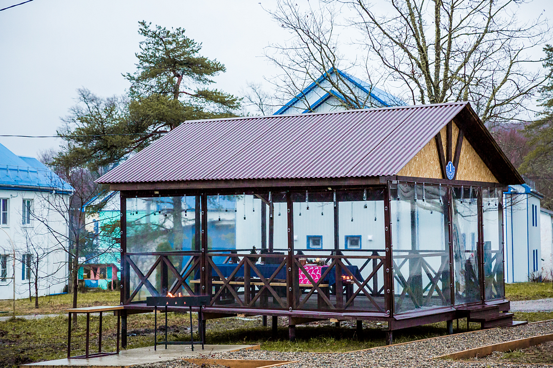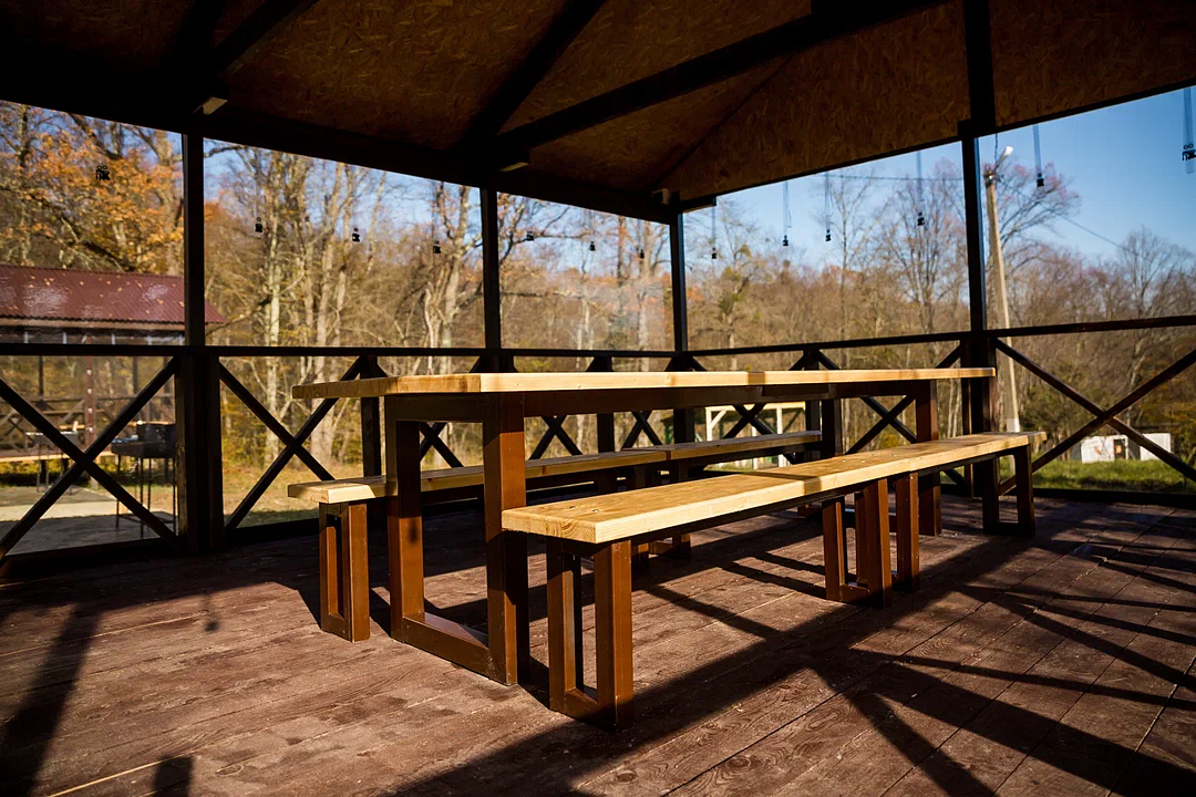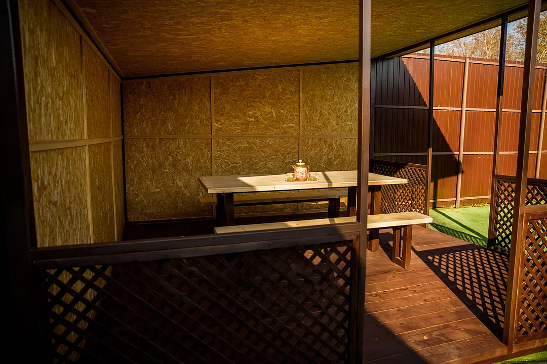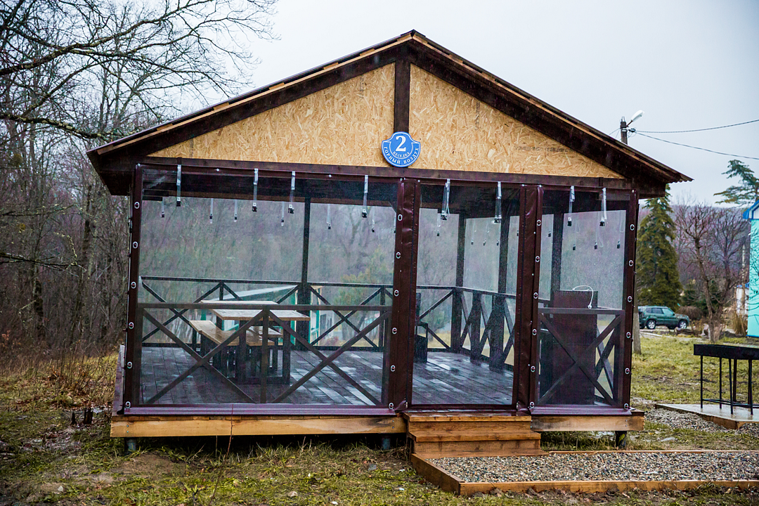 Две большие беседки вместимость до 12 человек с индивидуальными мангальными зонами. В холодное время года беседки закрываются мягкими окнами и обогреваются от буржуйки на дровяной печи для уютного время провождения.