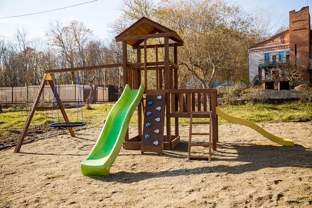 Современная деревянная детская площадка с горками, качелями и песочницей.