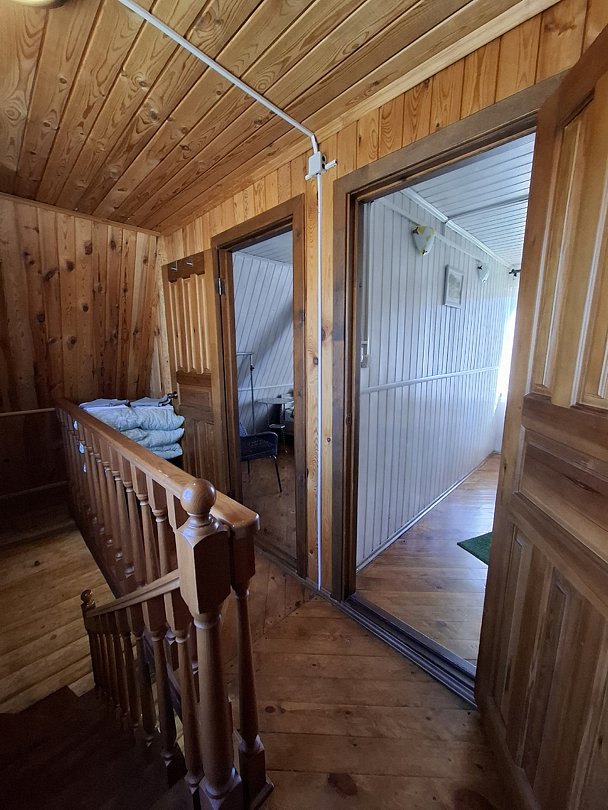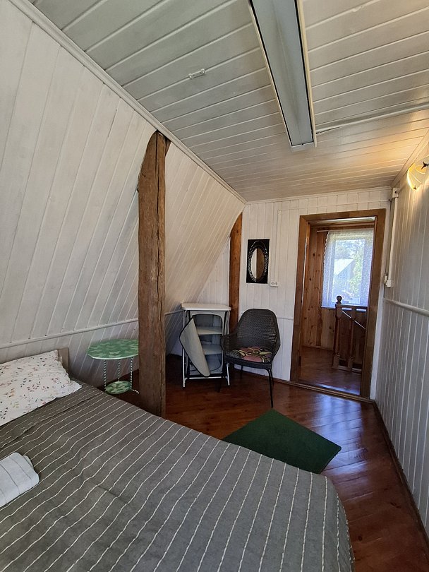 На втором этаже находятся две уютные спальные комнаты. В обеих комнатах находятся двуспальные кровати, кресла, столик, вешалка или полки для ваших вещей.