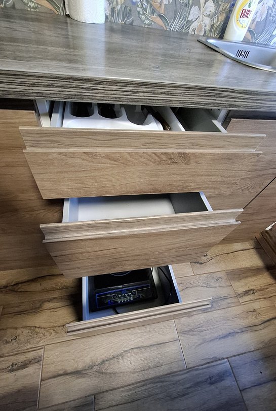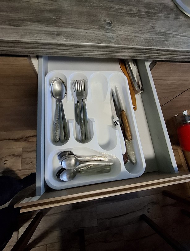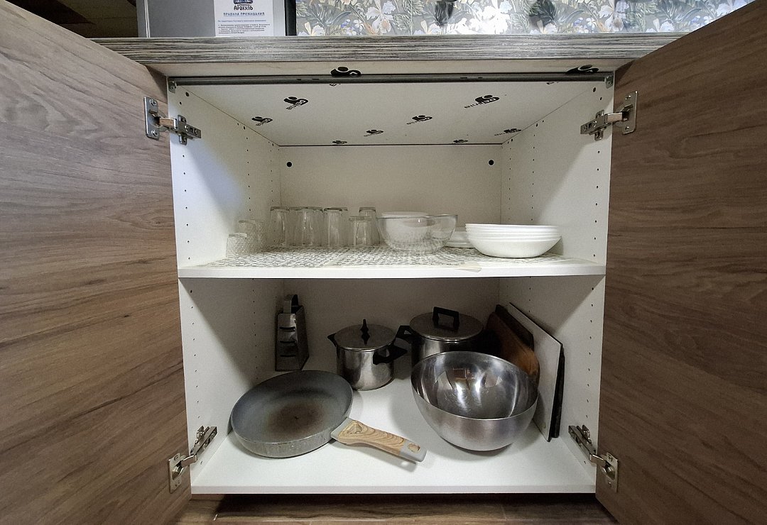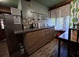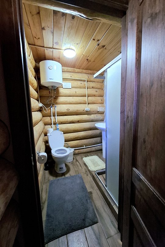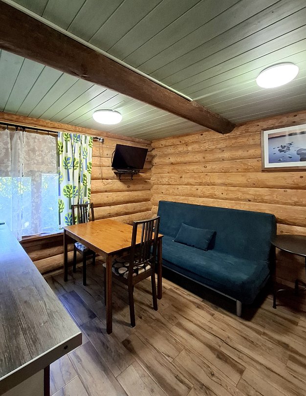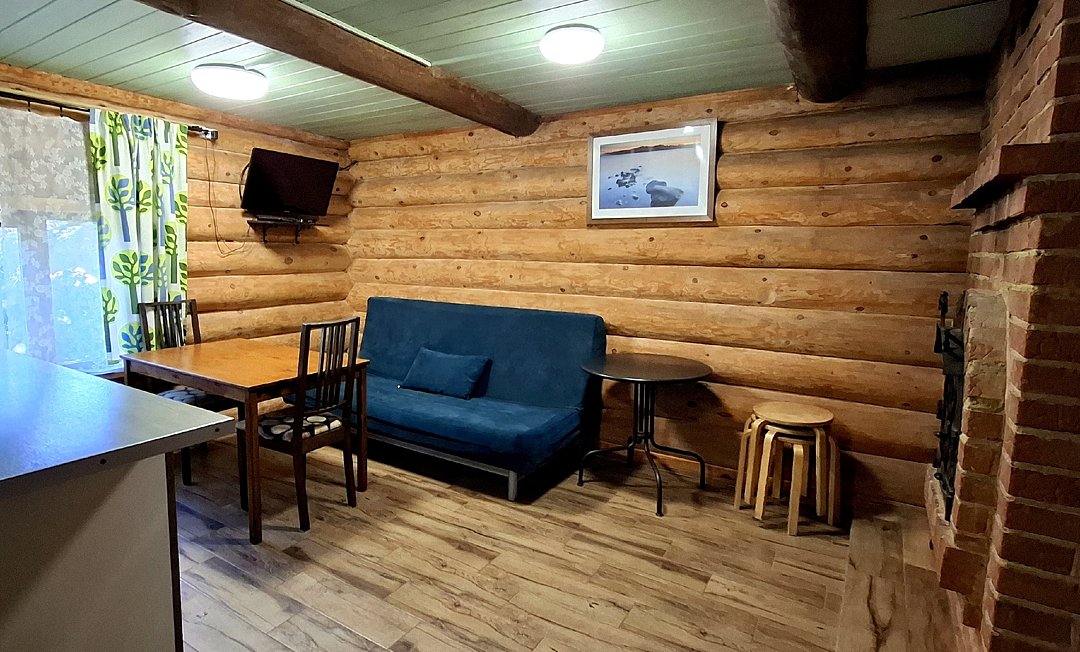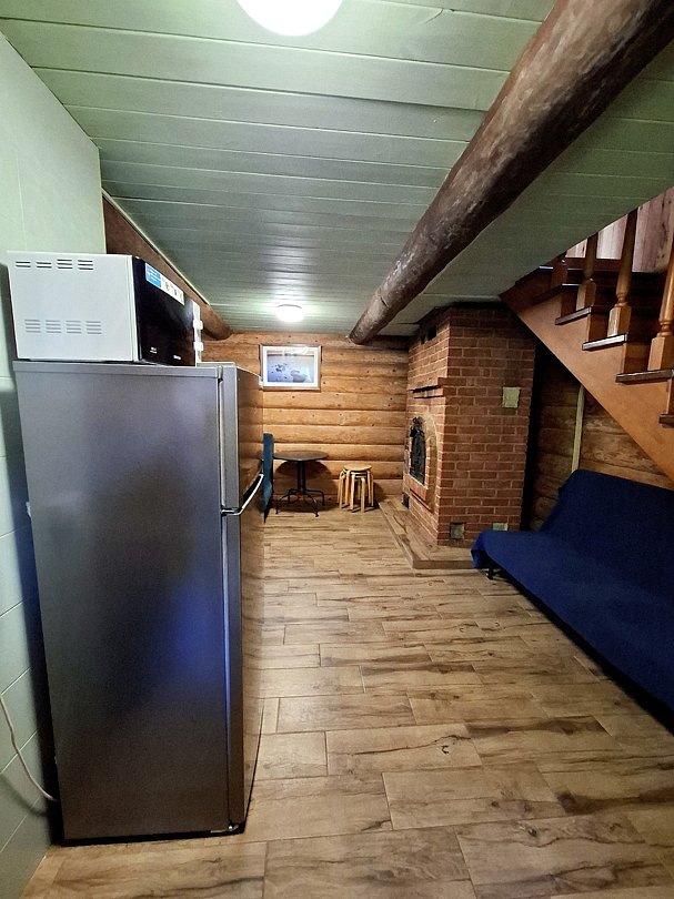 В домике на первом этаже расположена просторная гостиница, соединённая с кухней и туалетная комната с душевой кабинкой с санузлом. В гостиной расположены: телевизор, обеденный стол, стулья, небольшой столик и в качестве спальных мест – два удобных двухместных дивана. Кухня оборудована всей необходимой бытовой техникой (двухкамерный холодильник, индукционная варочная панель с 1 конфоркой, свч-печь, чайник) и посудой, включая кастрюли, сковородку, терку, столовые приборы и др.
