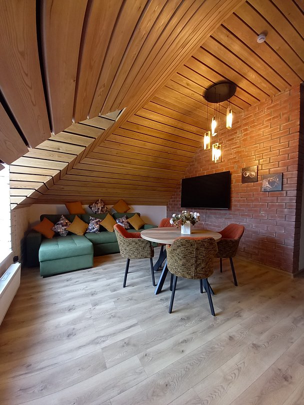 Апартаменты в гостевом доме рассчитаны на 6 человек. Есть все необходимые для комфортного пребывания : кухня-гостиная и 2 спальни, ванная комната. Апартаменты оснащены двумя двуспальными кроватями и угловым диваном , холодильником, микроволновой печью, посудой и столовыми приборами. Ванная комната оборудована душевой кабиной, санузлом и раковиной. В каждом номере имеется вентилятор.
