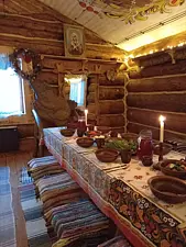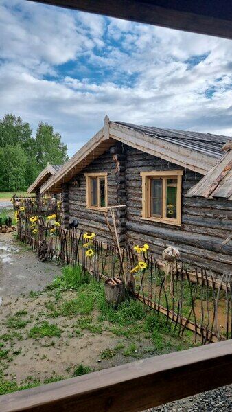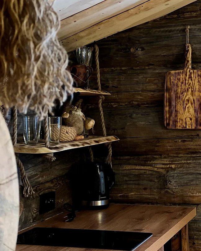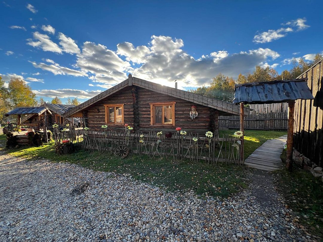 Это небольшая изба, выполненная в старорусском стиле. Жилое пространство представлено уютной комнатой с двуспальной кроватью. Компактная кухонная зона позволяет готовить простые блюда. Современные удобства - санузел с душевой кабиной и раковиной для умывания. Из бытовых удобств предусмотрены: комплект свежего постельного белья, полотенца, парковочные места на территории. Кроме того, имеется открытая веранда для отдыха на свежем воздухе и оборудованная зона для приготовления шашлыков/барбекю.