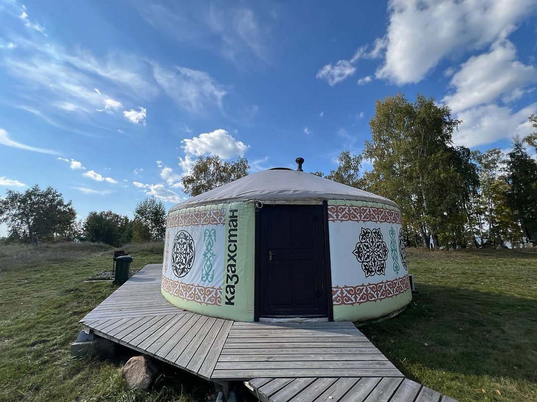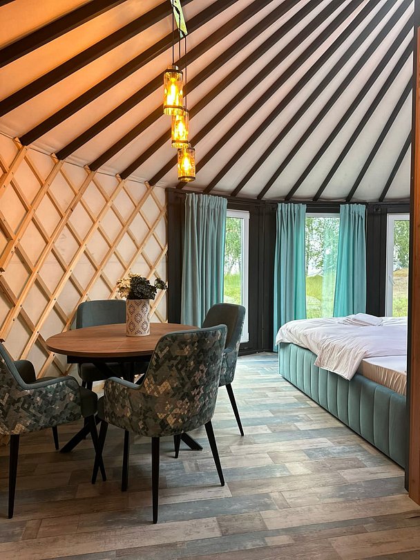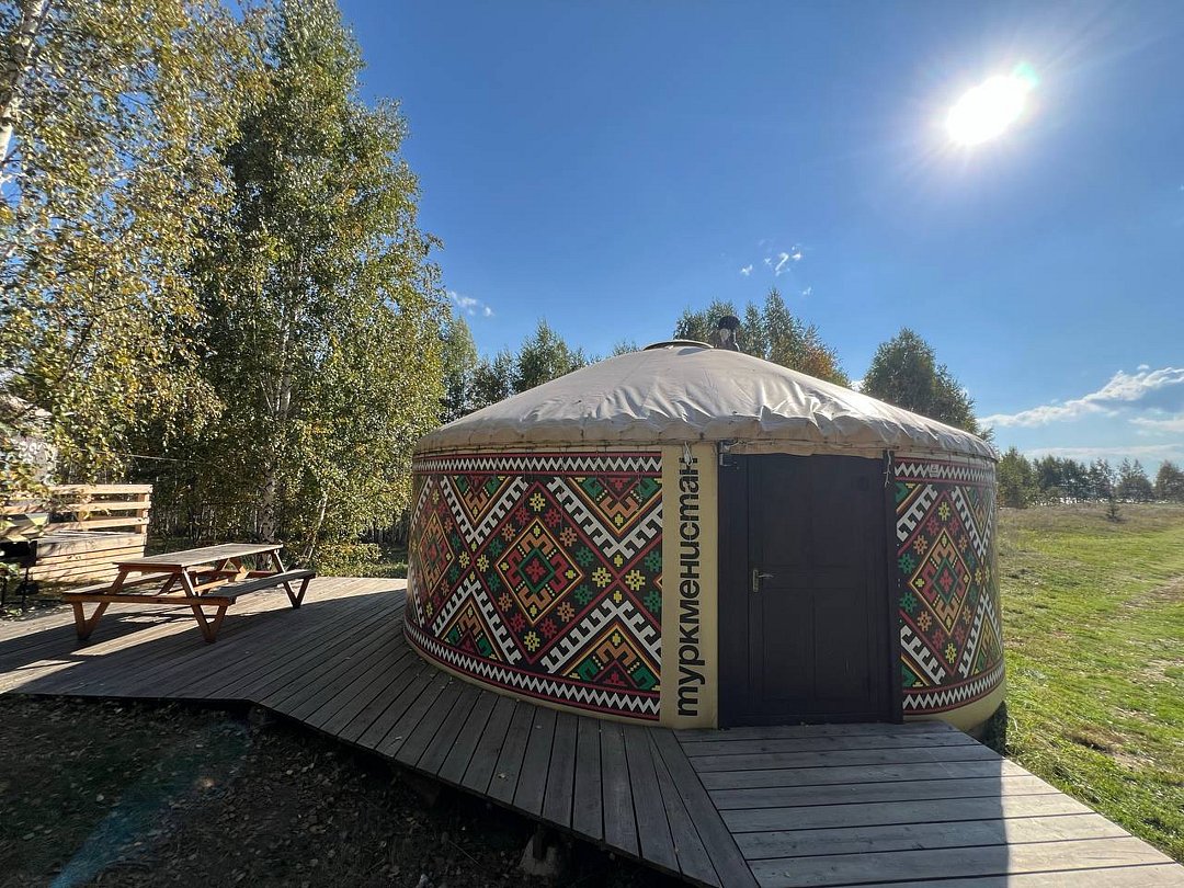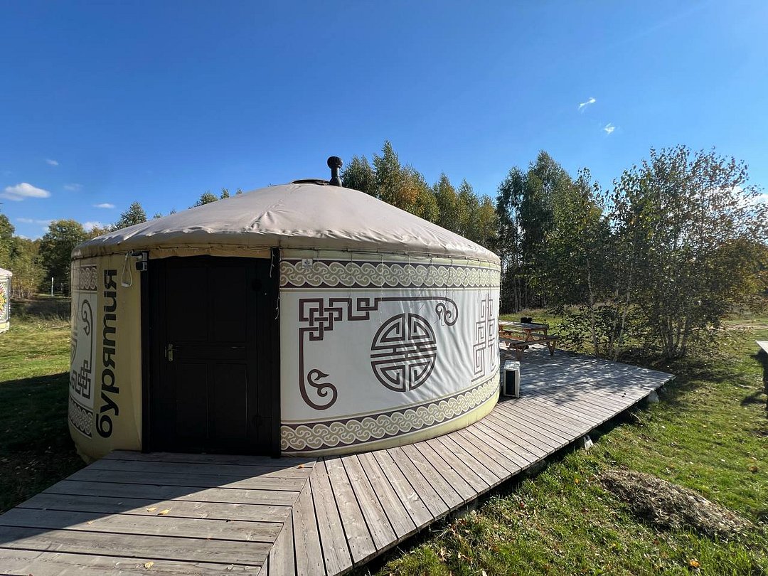 Колоритный дом (юрта) для семейного отдыха с видом на лес и озеро. Цвет интерьера – жёлтый. Юрта состоит из одной комнаты-гостиной. В гостиной имеется двухуровневое спальное место: одна полноформатная двуспальная кровать, вторая двуспальная кровать расположена на втором уровне (дополнительное место). Размещение: 2-е взрослых + 2-е детей.