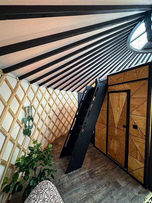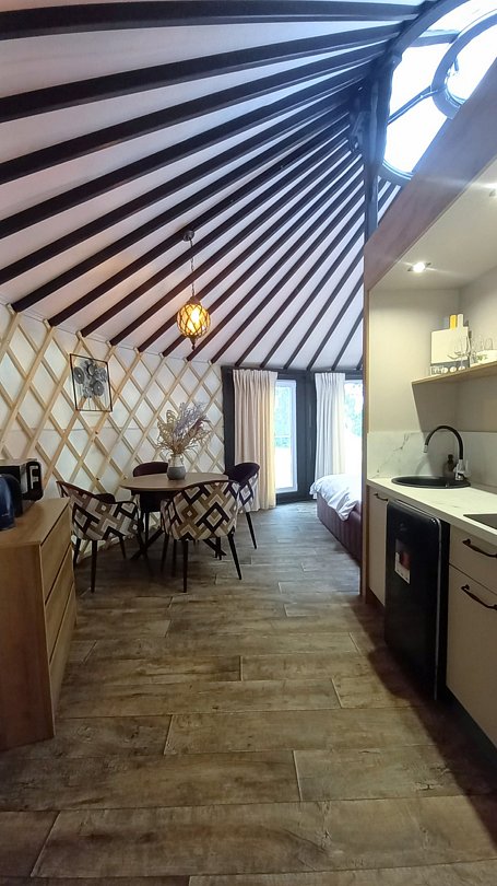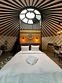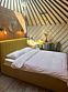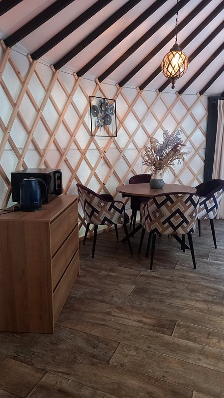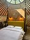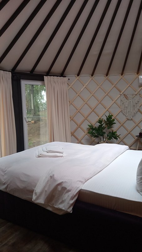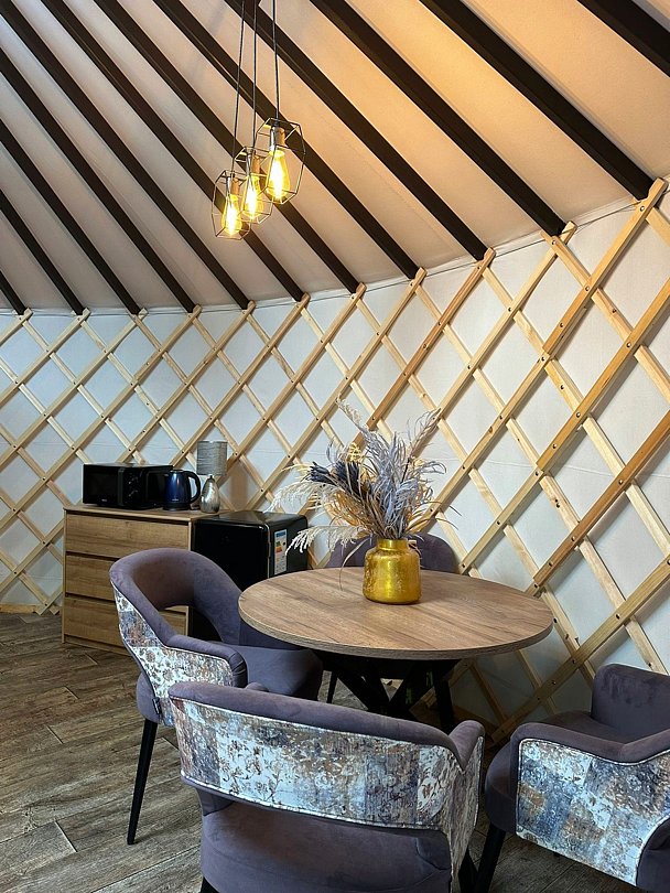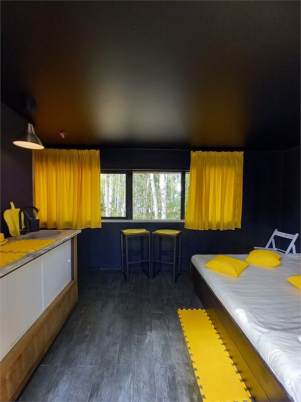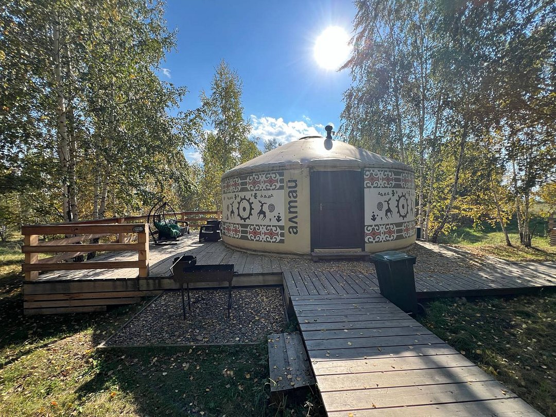 Колоритный дом (юрта) для семейного отдыха с видом на лес и озеро. Цвет интерьера – жёлтый. Юрта состоит из одной комнаты-гостиной. В гостиной имеется двухуровневое спальное место: одна полноформатная двуспальная кровать, вторая двуспальная кровать расположена на втором уровне (дополнительное место). Размещение: 2-е взрослых + 2-е детей.