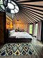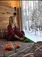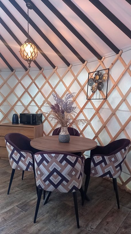 Колоритный дом (юрта) для семейного отдыха с видом на лес и озеро. Цветовой акцент - насыщенно фиолетовый. Юрта состоит из одной комнаты-гостиной. В гостиной имеется двухуровневое спальное место: одна полноформатная двуспальная кровать, вторая двуспальная кровать расположена на втором уровне (дополнительное место). Размещение: семья из 4-х человек (2-е взрослых + 2-е детей).