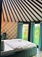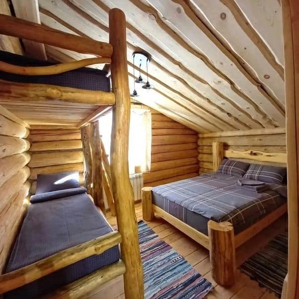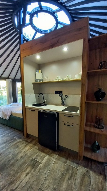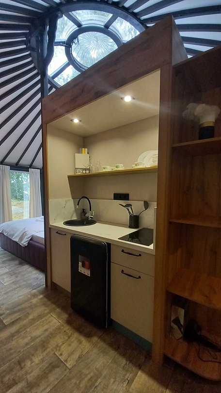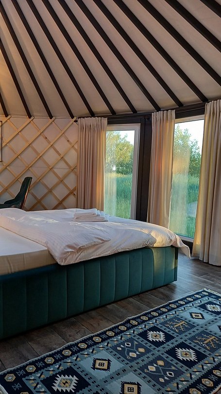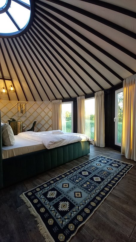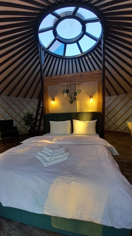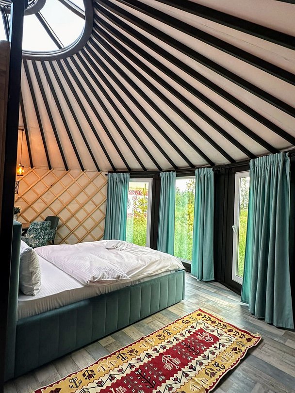 Колоритный дом (юрта) для семейного отдыха с видом на лес и озеро. Цвет интерьера - зелёный. Юрта состоит из одной комнаты-гостиной. В гостиной имеется двухуровневое спальное место: одна полноформатная двуспальная кровать, вторая двуспальная кровать расположена на втором уровне (дополнительное место). Размещение: 2-е взрослых + 2-е детей.