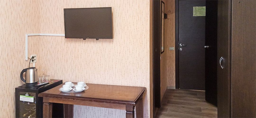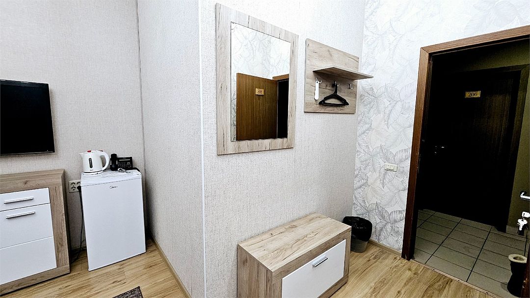 Небольшой номер, располагающий всем необходимым для комфортного отдыха. Он меньше остальных номеров, но не менее уютен — он очень светлый, с приятным классическим интерьером в теплых пастельных тонах.