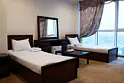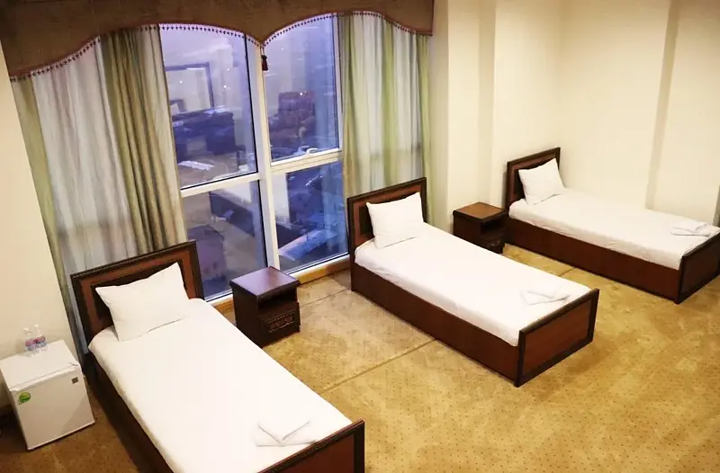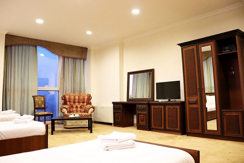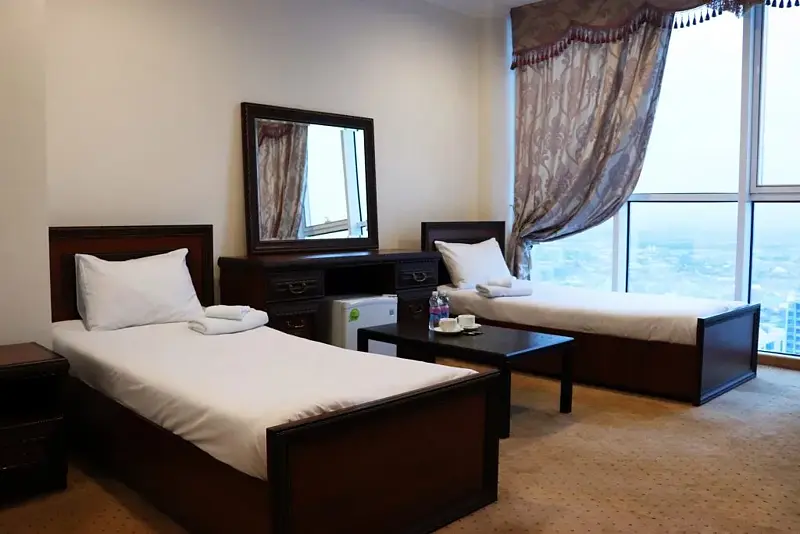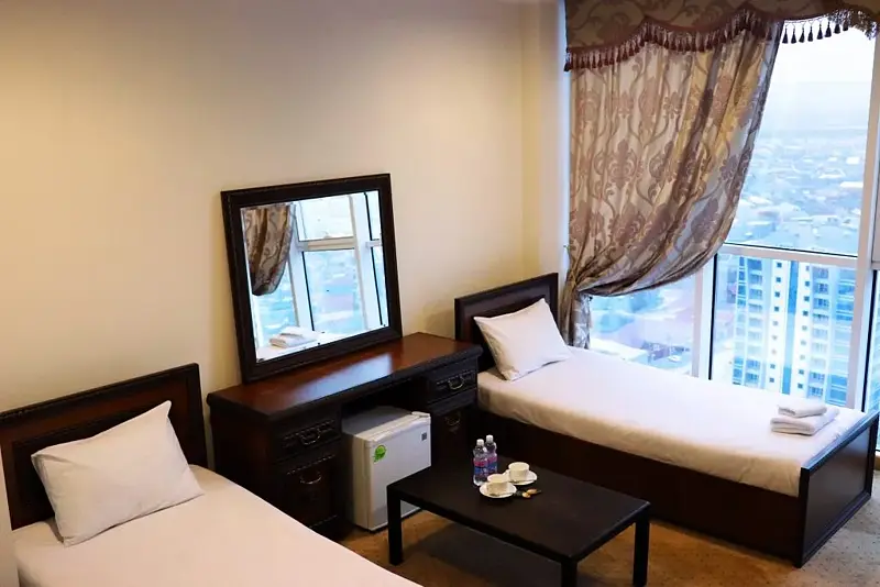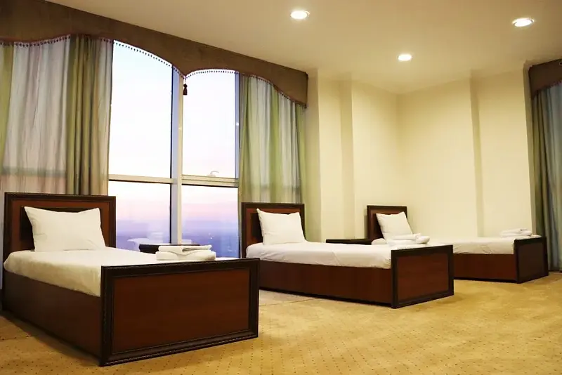 Большой уютный номер для небольшой компании путешественников. Три раздельные кровати, душевая комната, холодильник и вид из панорамных окон на ночной Грозный и мечеть им. Аймани Кадыровой.