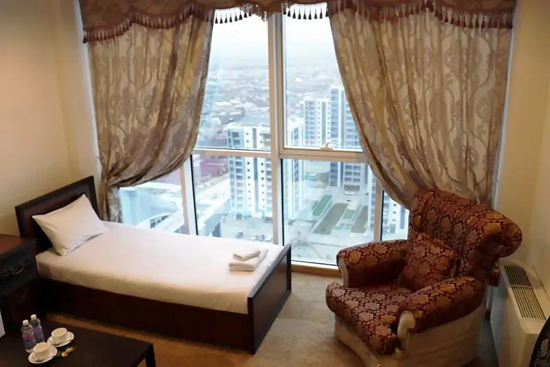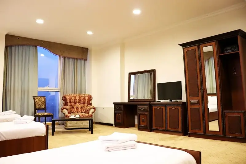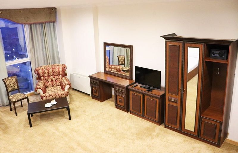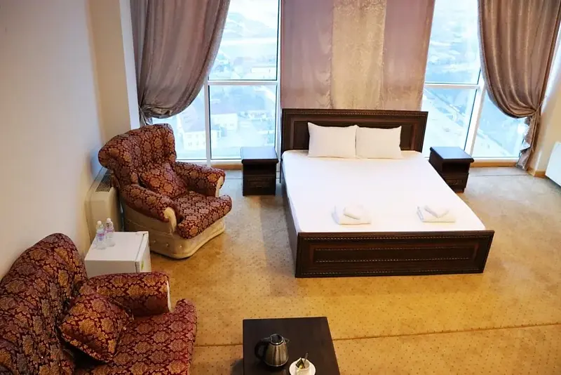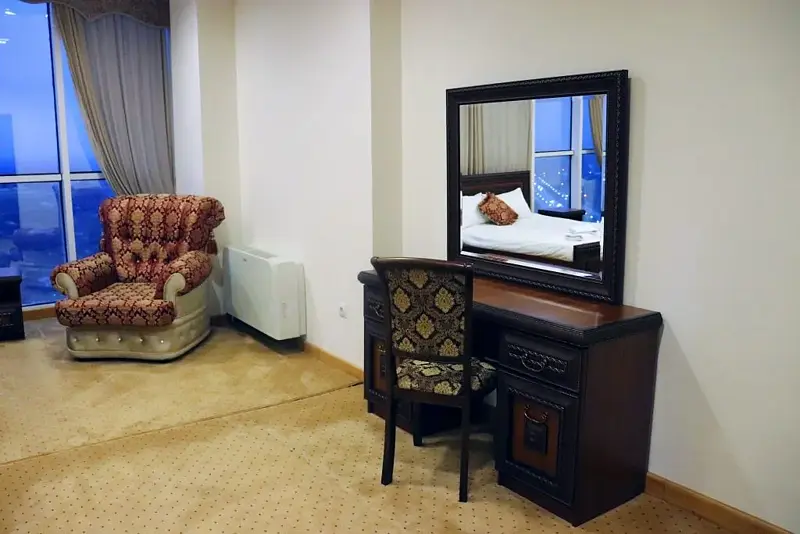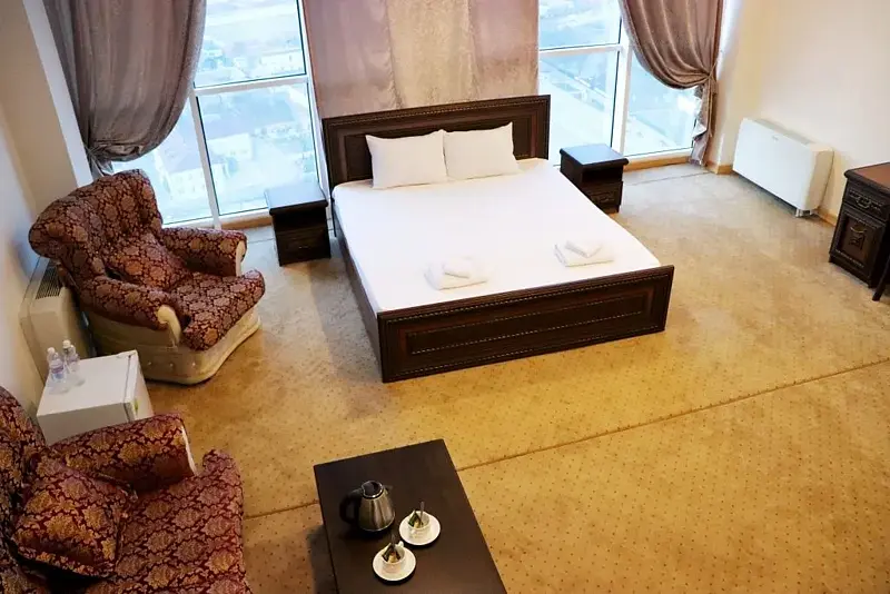Большая кровать, большой номер, большая ванная. В этом номере есть все, что необходимо для прекрасного вечера семейной пары. Сногсшибательный вид из панорамных окон на мечеть им. Аймани Кадыровой. Объемное зеркало для прекрасных посетительниц.